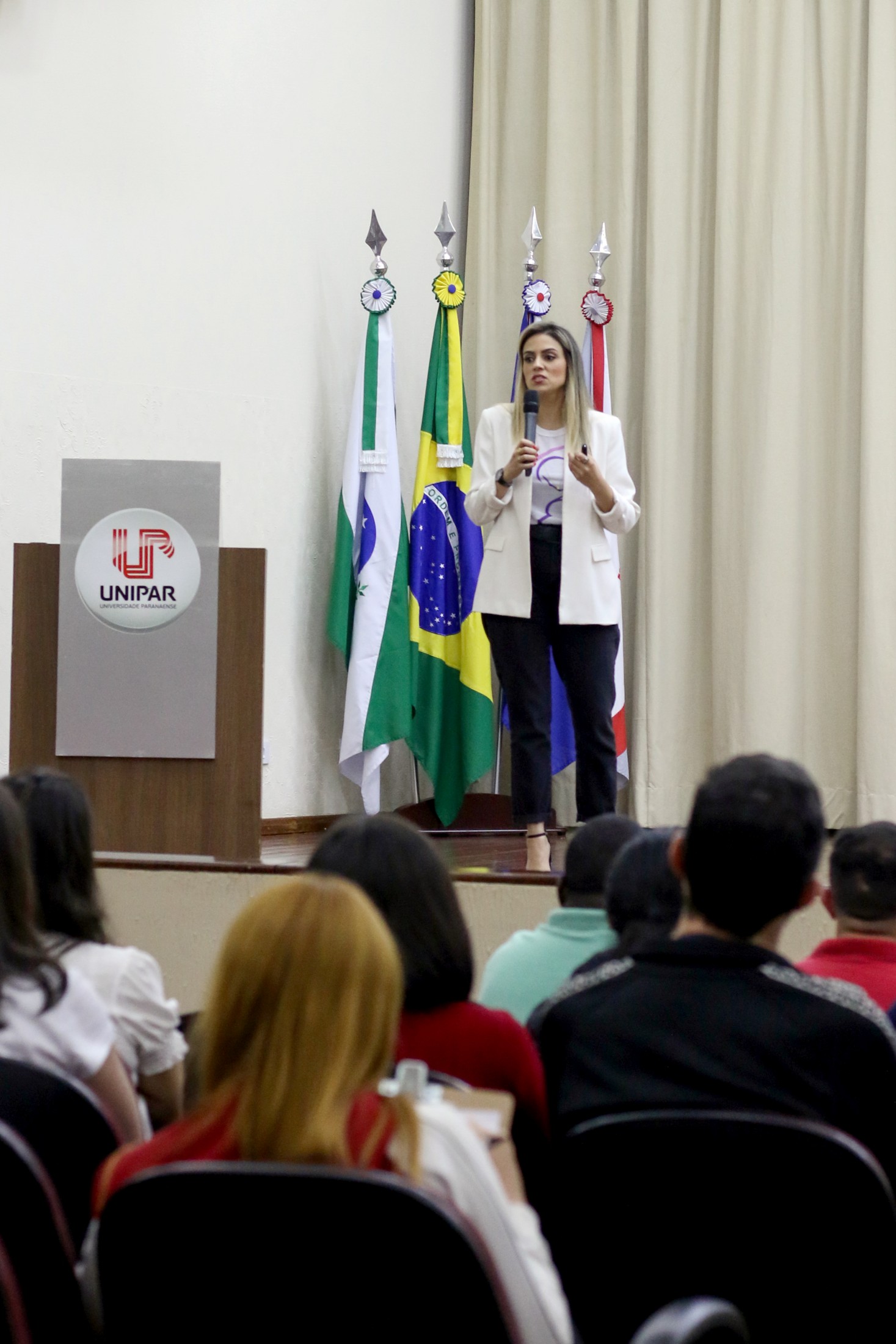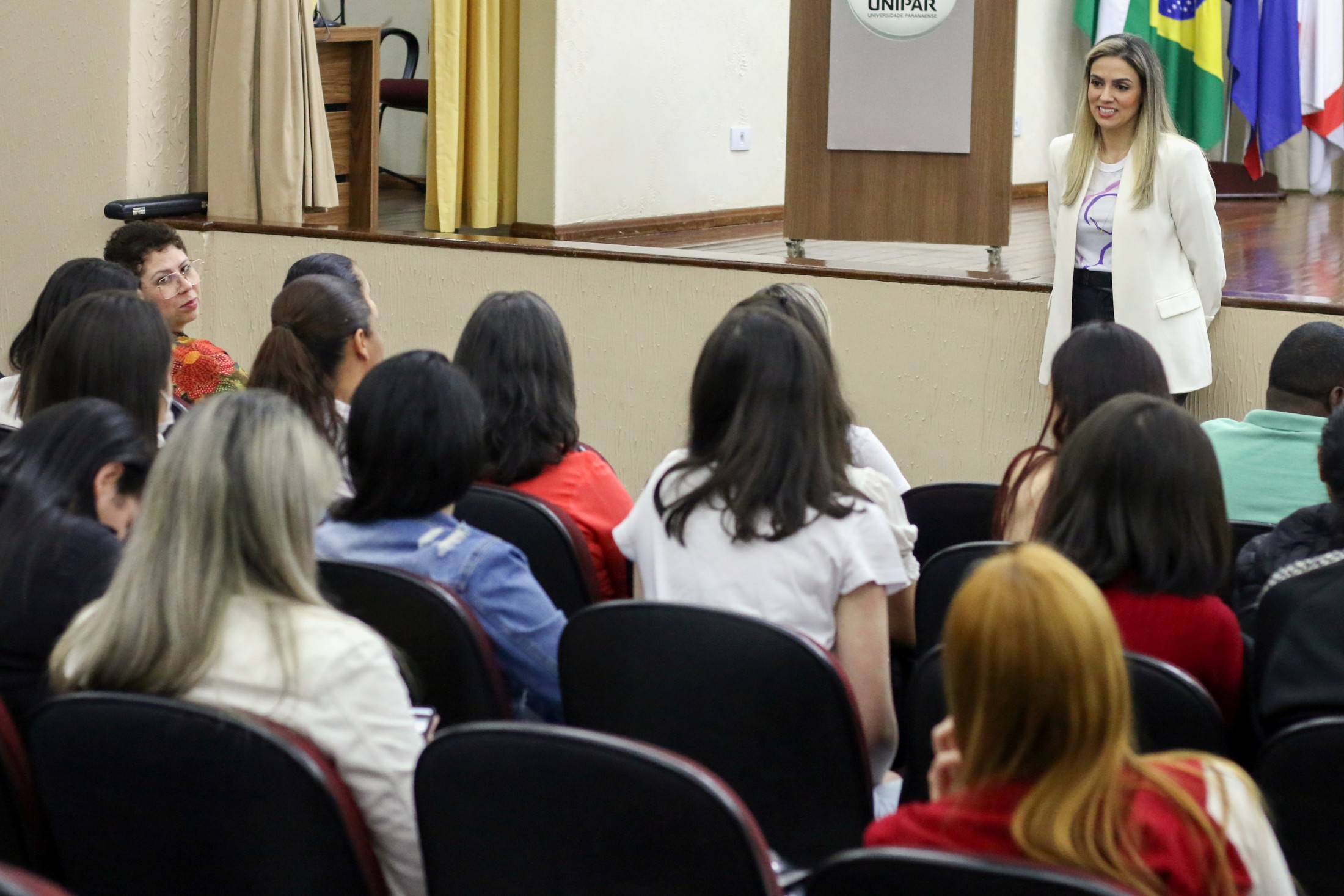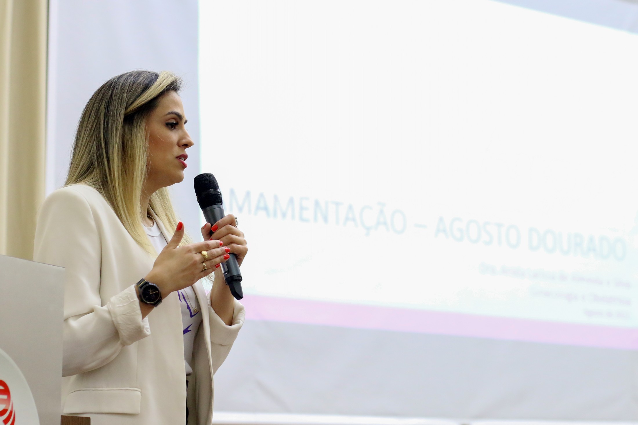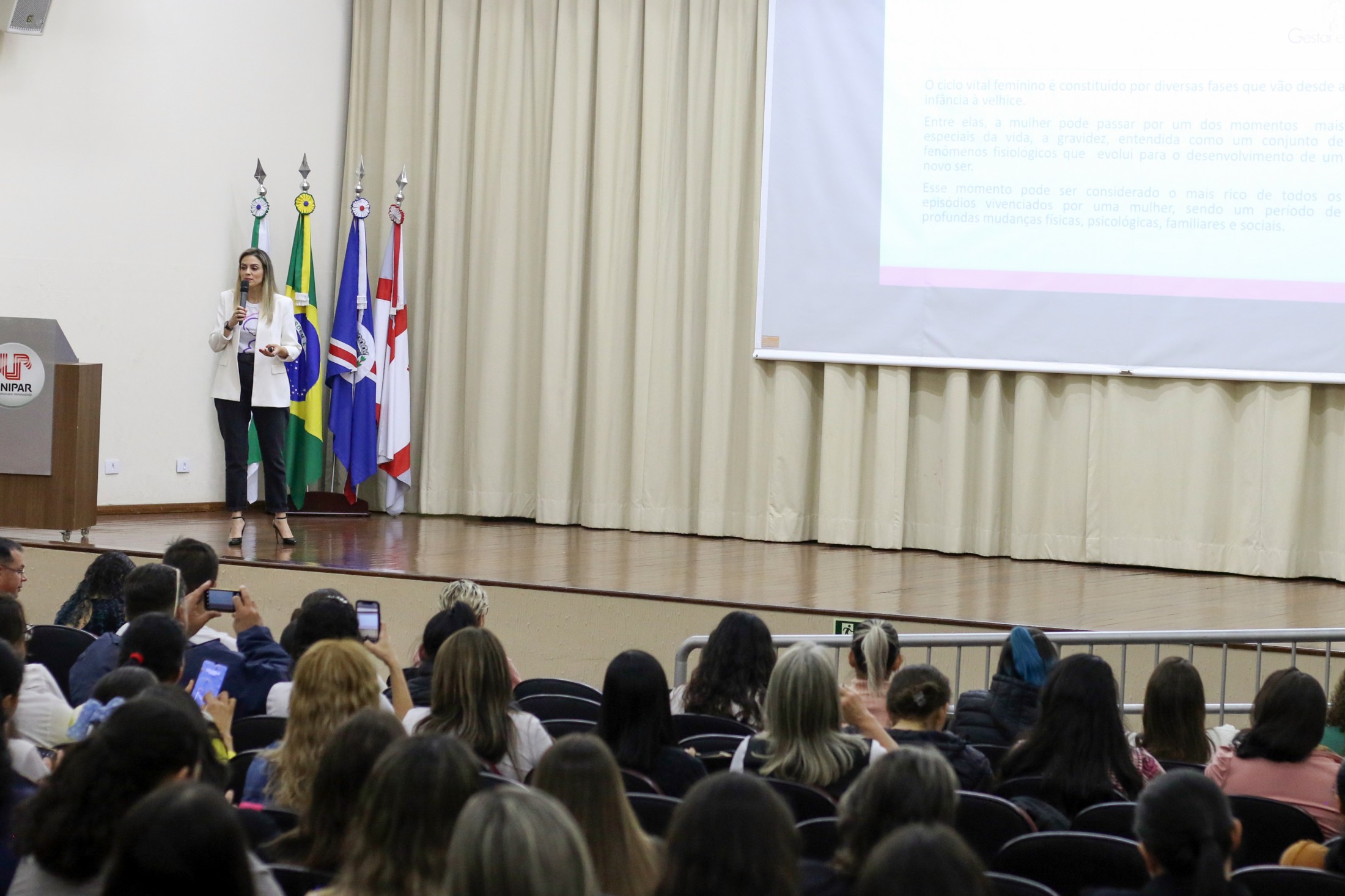 Mais de 200 pessoas participaram, na noite da quarta-feira (24), da palestra em comemoração ao mês do aleitamento materno, o Agosto Dourado. Voltada para acadêmicos de enfermagem da Unipar, estudantes do curso técnico em enfermagem do Colégio Estadual Cianorte e profissionais da área, a capacitação foi realizada no anfiteatro Cândido Garcia e ministrada pela médica obstetra, Dra. Anida Larissa de Almeida e Silva.