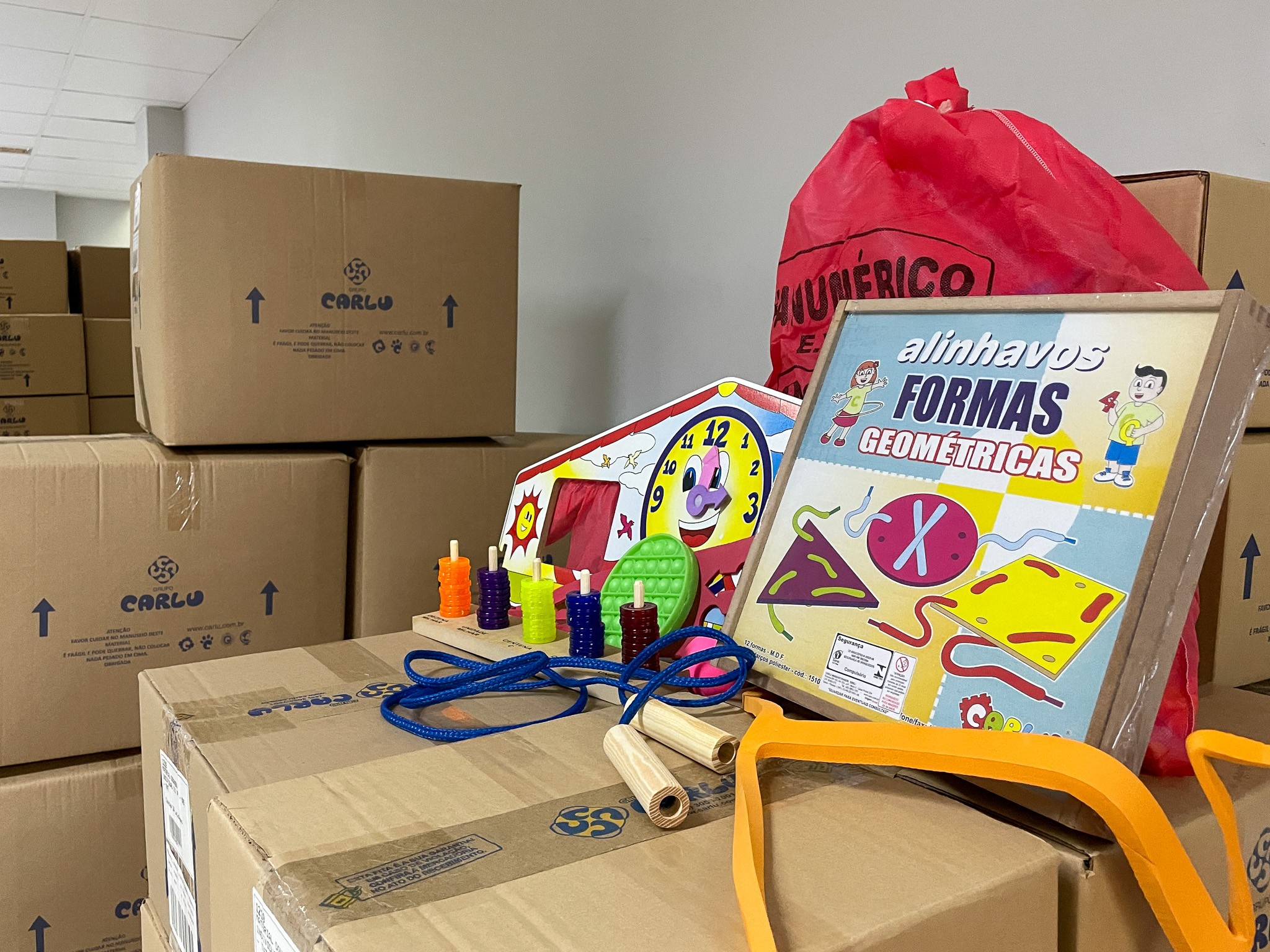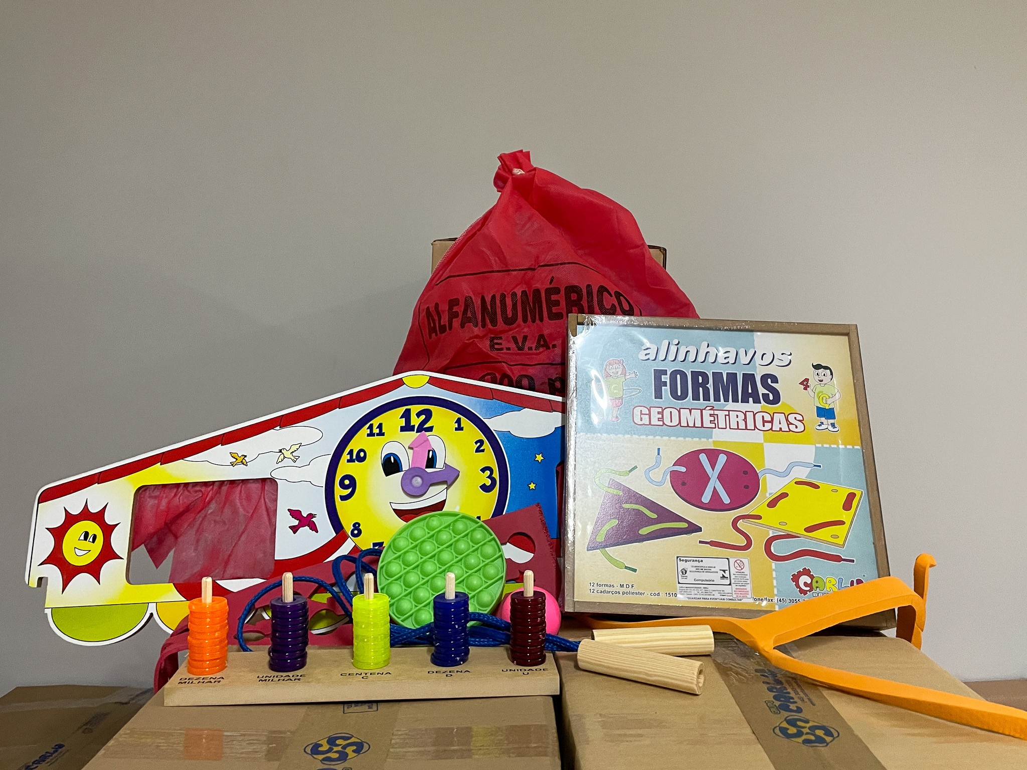 São 120 tipos de materiais, entre eles alfabetos em MDF, alinhavo formas geométricas, tapete de amarelinha, túneis centopeia, pescarias, jogos de boliche, bandas rítmicas, bambolês, tangrans, cordas de pular, bonecas, jogos da memória, bolas, cones, chocalhos, bancadas de ferramentas, fantoches, jogos de argolas, cestas de basquete, quebra-cabeças, pop its, lousas mágicas, escorregadores e gangorras.