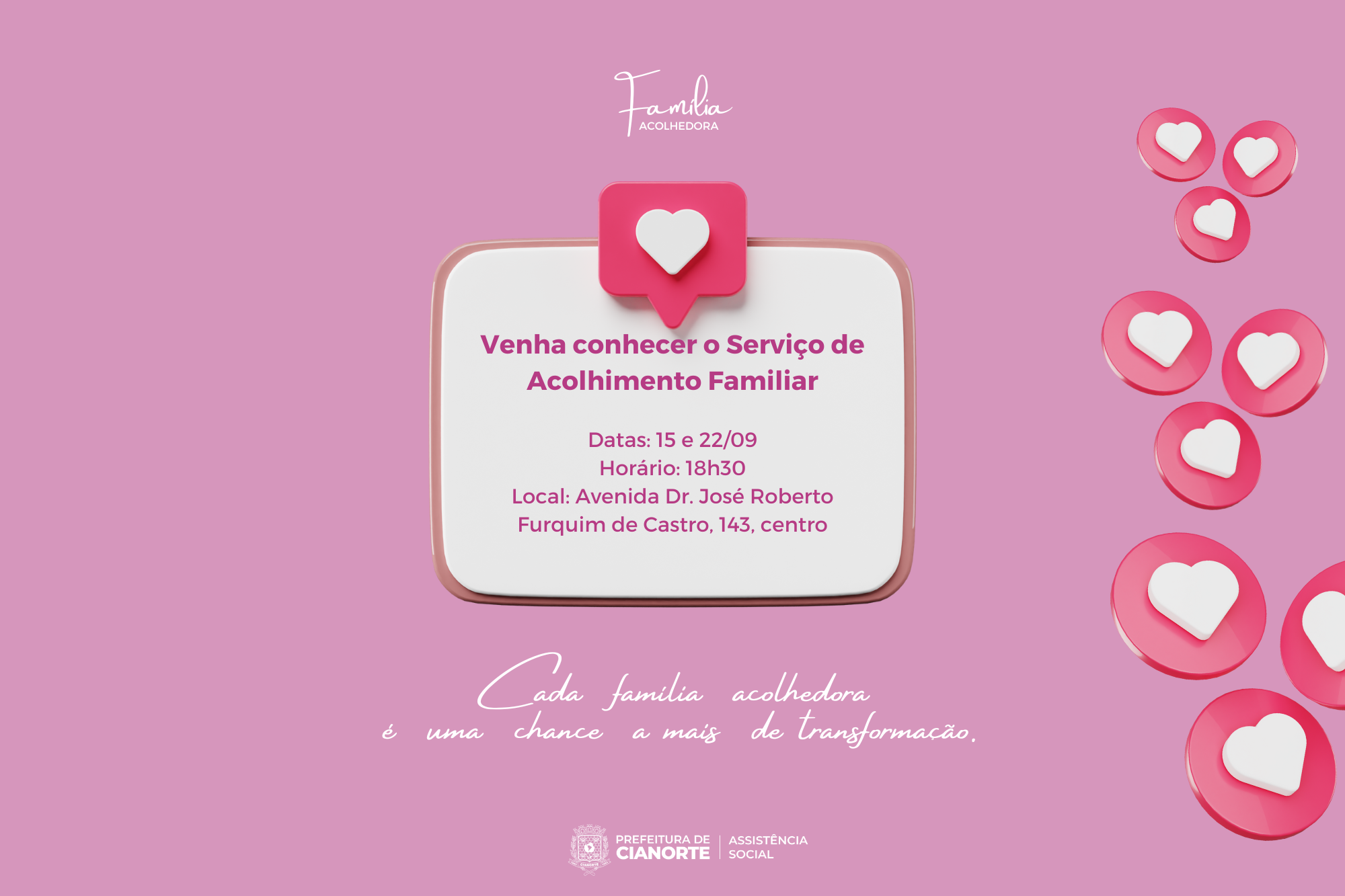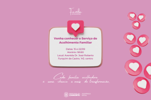 A Secretaria Municipal de Assistência Social tem um importante convite aos cianortenses: um encontro para conhecer o Serviço de Acolhimento Familiar, nesta quinta-feira (15), às 18h30, na sede localizada na Avenida Doutor José Roberto Furquim de Castro, 143, Centro. A ocasião visa promover o diálogo e sanar dúvidas sobre o funcionamento do Programa Família Acolhedora.
