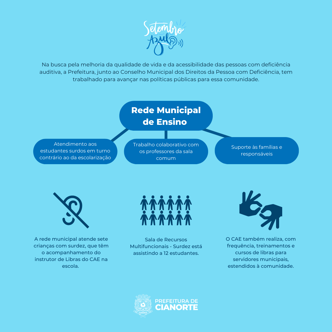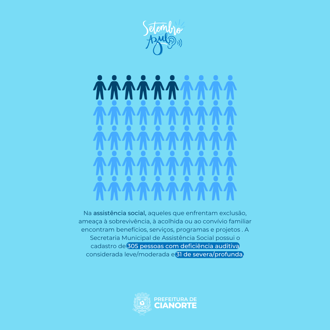 De acordo com o censo demográfico realizado em 2010 pelo IBGE (Instituto de Geografia e Estatística), mais de 5% da população brasileira sofre com algum tipo de deficiência auditiva. Diante deste elevado índice, em Cianorte, o Setembro Azul, mês em que são lembradas as lutas e conquistas dos surdos, conta com uma atenção especial. Isto, porque a Lei nº 5.398, de 8 de junho de 2022, instituiu no calendário oficial do município a campanha de conscientização sobre os direitos das pessoas surdas, em alusão ao 26 de setembro, em que comemora-se o Dia Nacional dos Surdos e Dia Internacional da Linguagem de Sinais.
