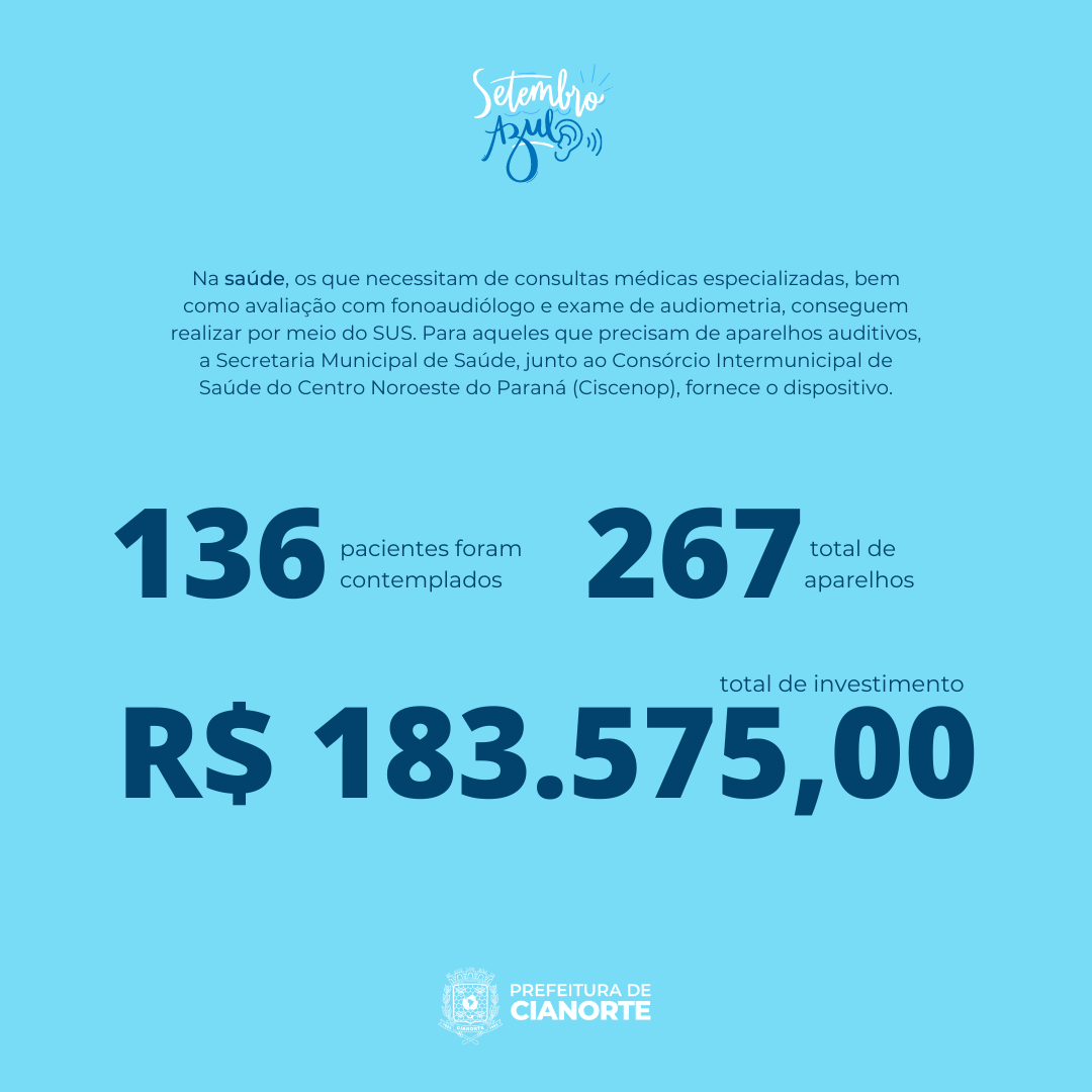 Na saúde, os que necessitam de consultas médicas especializadas, bem como avaliação com fonoaudiólogo e exame de audiometria, conseguem realizar por meio do SUS. Para aqueles que precisam de aparelhos auditivos, a Secretaria Municipal de Saúde, junto ao Consórcio Intermunicipal de Saúde do Centro Noroeste do Paraná (Ciscenop), fornece o dispositivo. Em 2022, de janeiro a agosto, 136 pacientes foram contemplados, totalizando 267 aparelhos e um investimento de R$ 183.575,00.