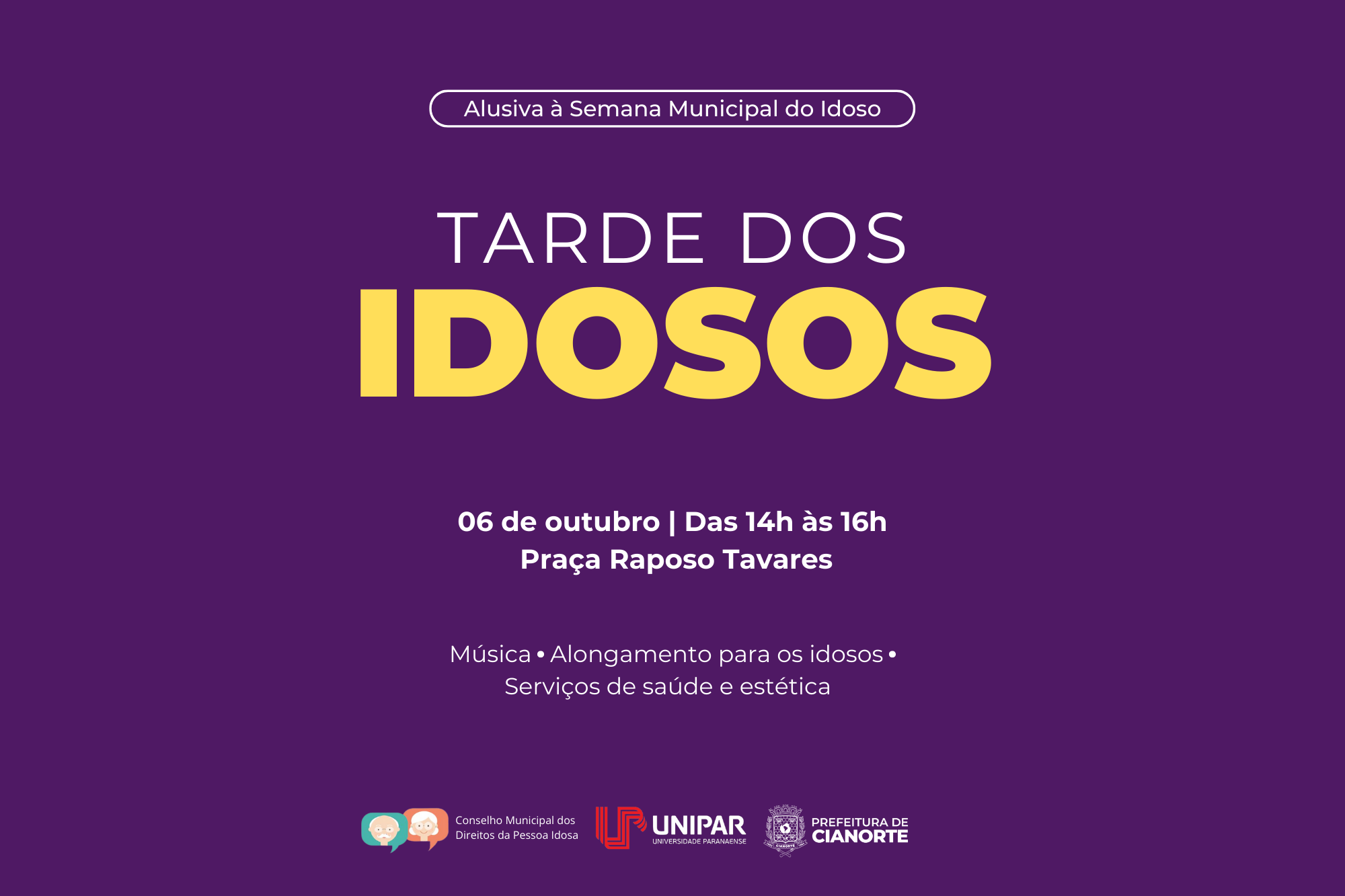Em alusão ao Dia Nacional do Idoso, celebrado em 1º de outubro, e à Semana Municipal do Idoso, instituída pela Lei nº 5.320/21, comemorada na primeira semana do mês, o Conselho Municipal dos Direitos da Pessoa Idosa, em parceria com a Prefeitura e Unipar, promove a Tarde do Idoso, com ações especiais e gratuitas para a população, principalmente para o público da terceira idade.