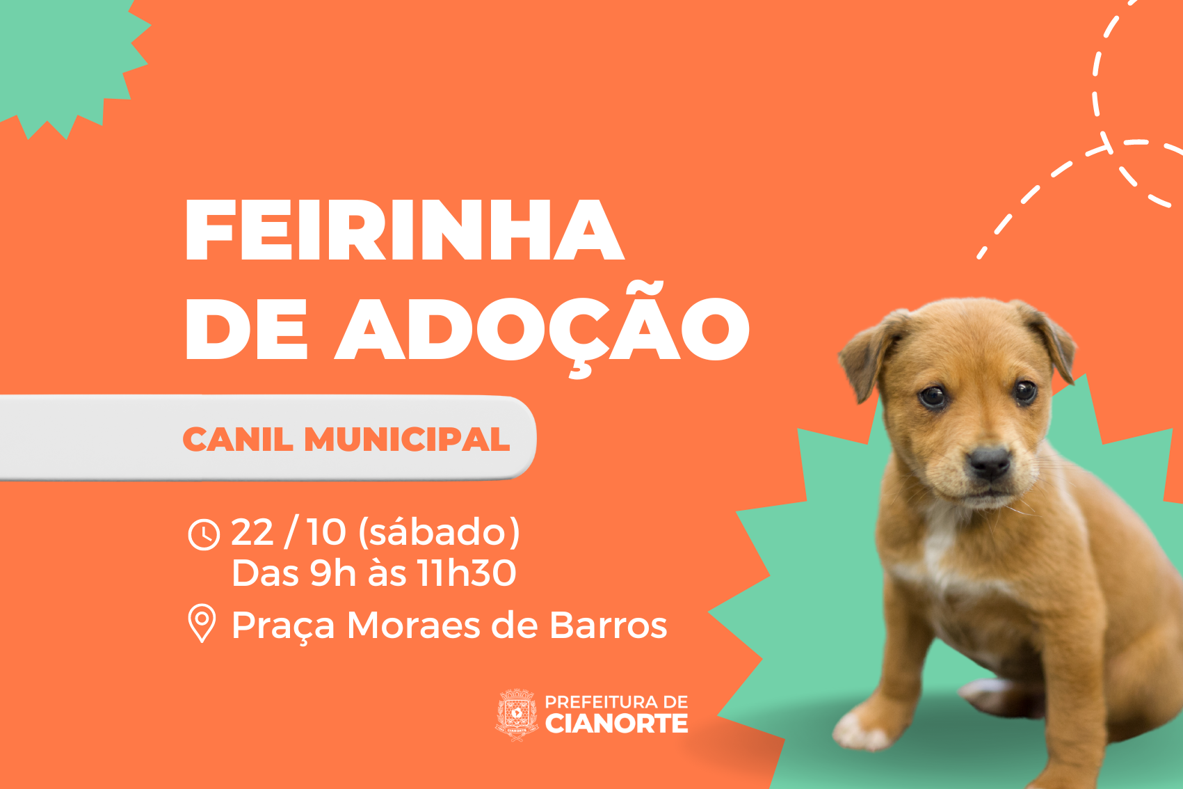 Quem está em busca de um amigo de patas tem a oportunidade de encontrar neste sábado (22), na tradicional Feirinha de Adoção do Canil Municipal, que estará com uma edição especial de filhotes, na Praça Antonio Moraes de Barros, das 9h às 11h30. Serão disponibilizados 10 cachorrinhos, entre machos e fêmeas, a partir de três meses, vermifugados e com direito a receber vacinação e castração ao atingirem a idade recomendada.