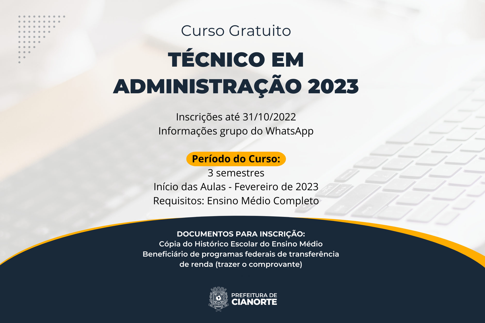 As pessoas que já concluíram o Ensino Médio têm a oportunidade de se profissionalizar. Isto porque, o Colégio Estadual Cianorte está com inscrições abertas para o Curso Técnico gratuito em Administração. Os interessados devem comparecer à secretaria do colégio, na Avenida São Paulo, 269, de segunda a sexta-feira e realizar a inscrição.