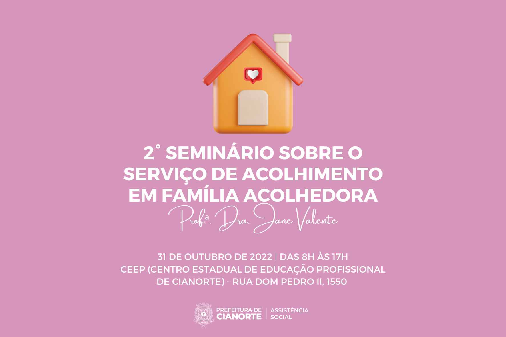 “Trata-se de uma oportunidade para ampliar o conhecimento e debater as qualidades e desafios do Serviço de Acolhimento em Família Acolhedora. A palestra será aberta ao diálogo e todos os cianortenses, em especial os profissionais da rede de proteção às crianças e adolescentes, assim como as famílias interessadas em fazer parte da iniciativa, estão convidados a participar”, destaca a assistente social, Karina Feliciano Pessoa.