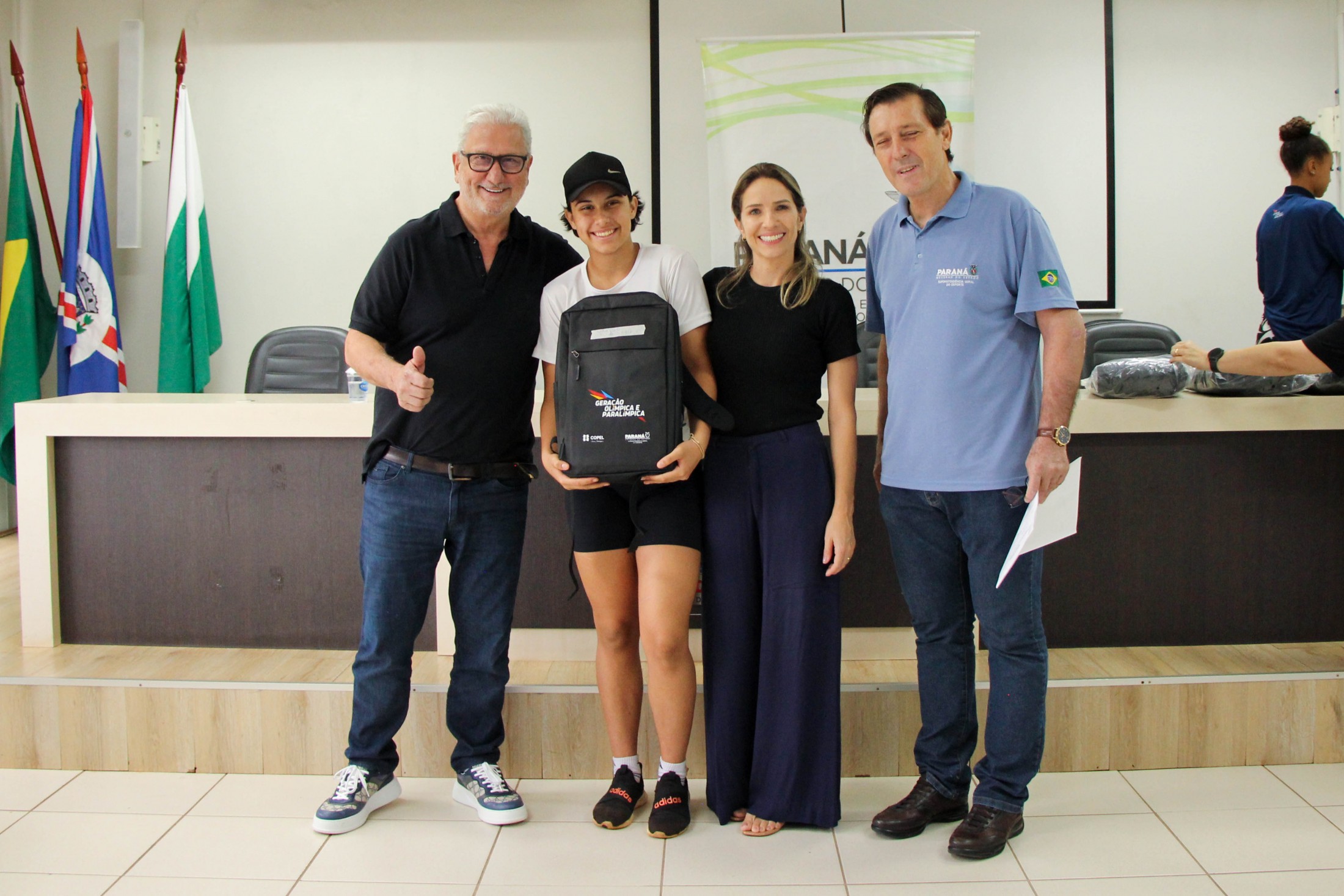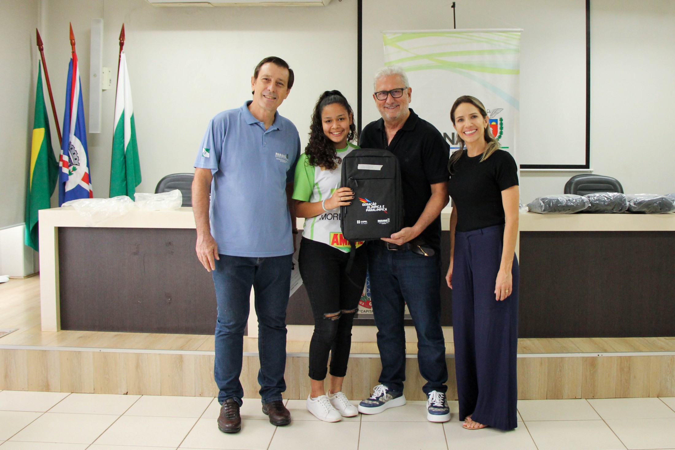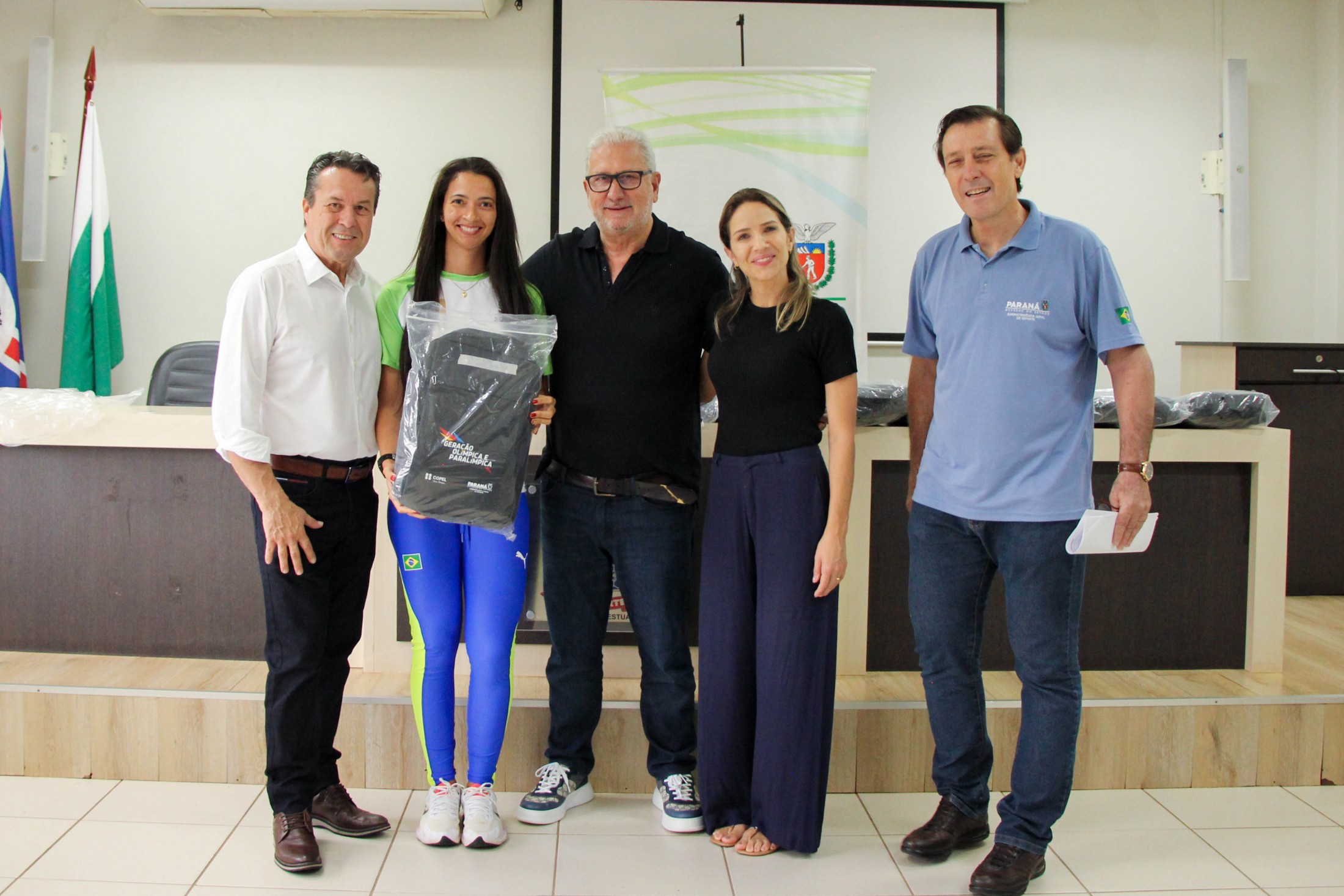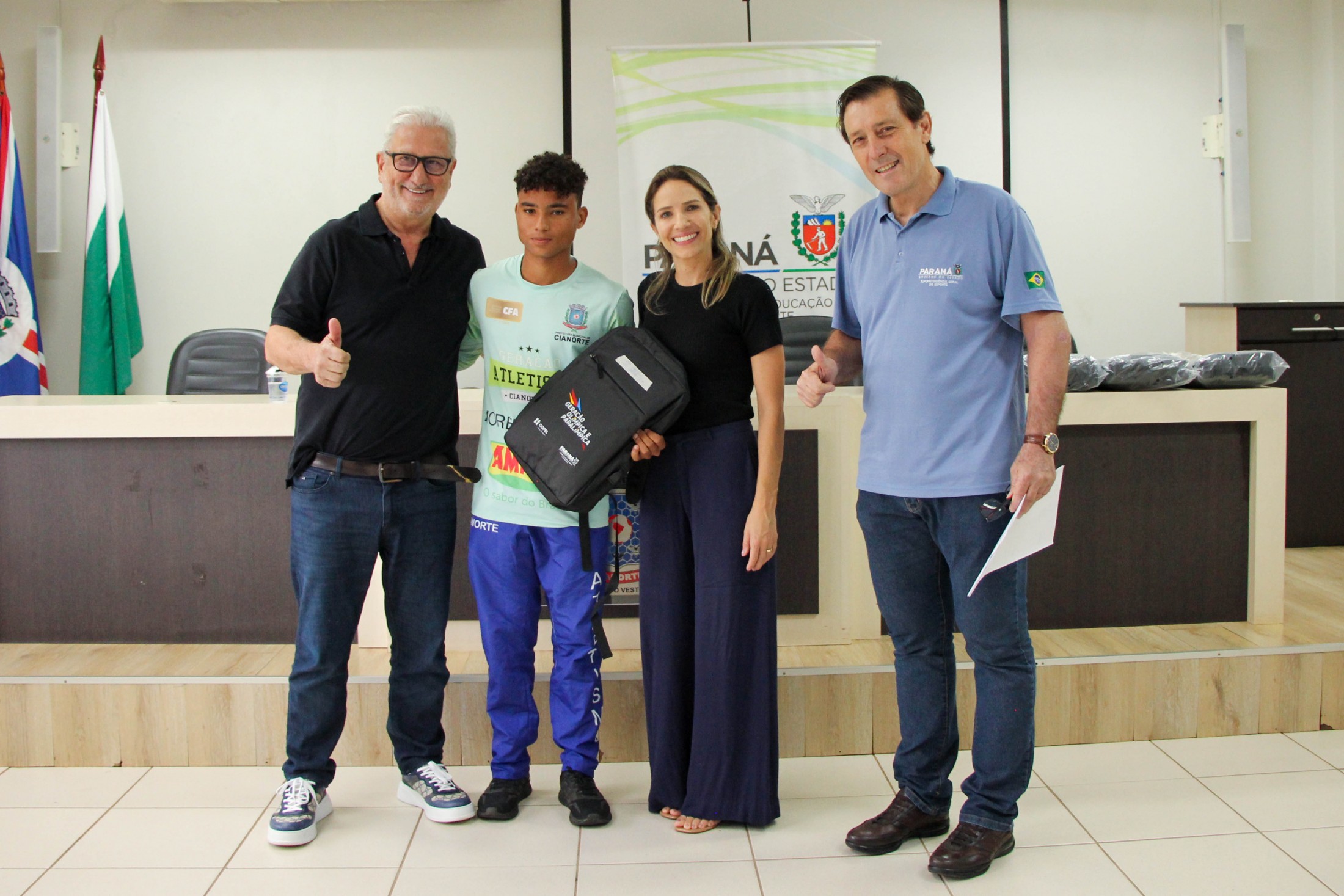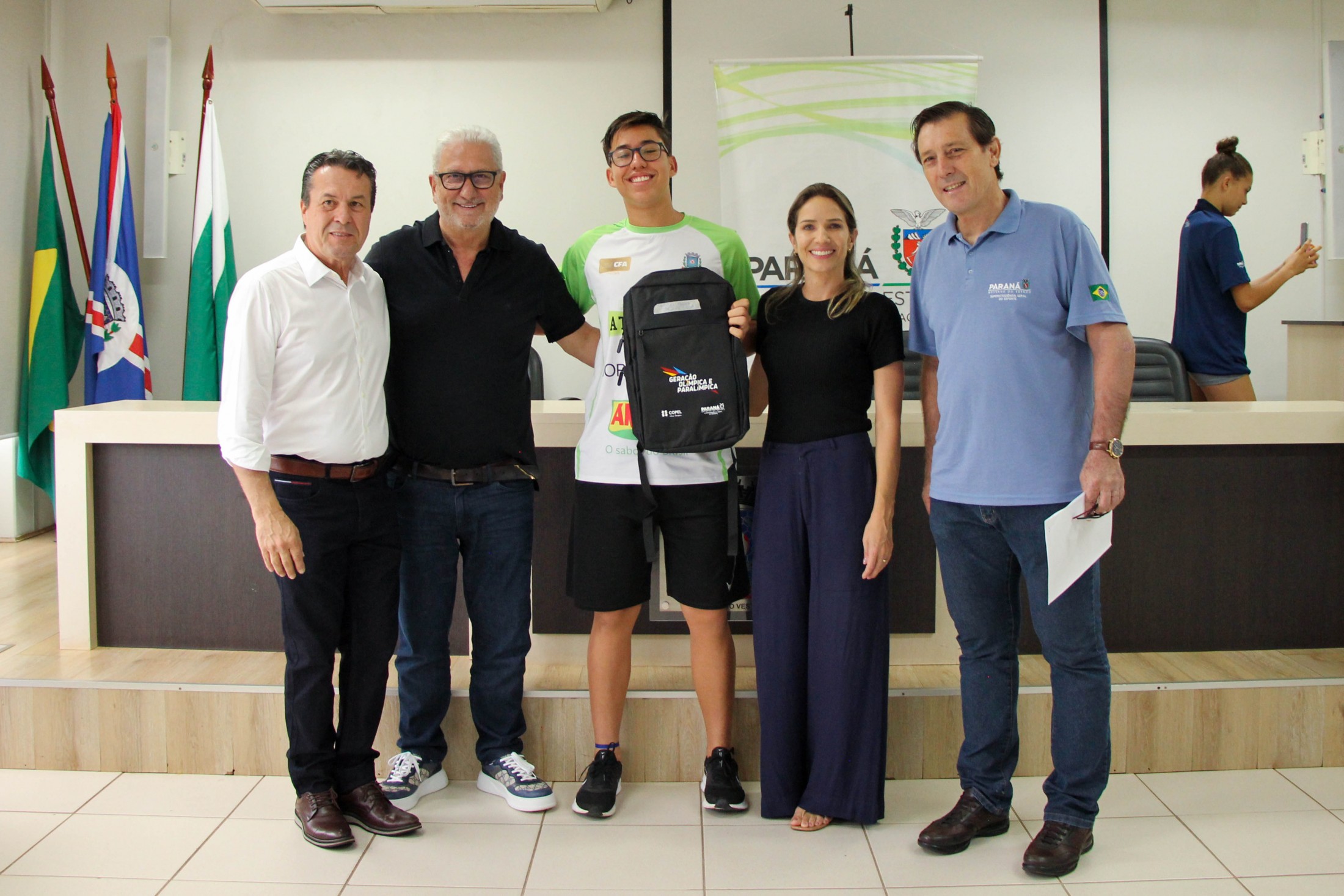 Na tarde da última quinta-feira (27), os 14 cianortenses bolsistas do programa Geração Olímpica e Paralímpica, do Governo do Estado do Paraná, receberam kits de identificação visual e foram homenageados pelos resultados alcançados recentemente. A solenidade foi realizada no auditório do Paço Municipal e contou com a participação de autoridades locais.