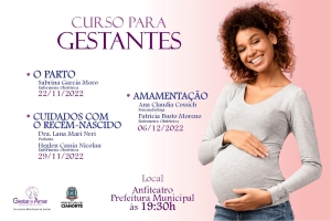 Muitas dúvidas permeiam a gestação. Para ajudar neste momento, esclarecer pontos fundamentais e simplificar a vida dos pais, a Prefeitura de Cianorte, por meio da Secretaria Municipal de Saúde, inicia uma nova turma do Curso para Gestantes em novembro. Serão três encontros, todos às terças-feiras, às 19h30, no anfiteatro da Prefeitura Municipal, que tratarão os temas: parto, amamentação e cuidados com o recém-nascido. Não há necessidade de inscrição prévia.