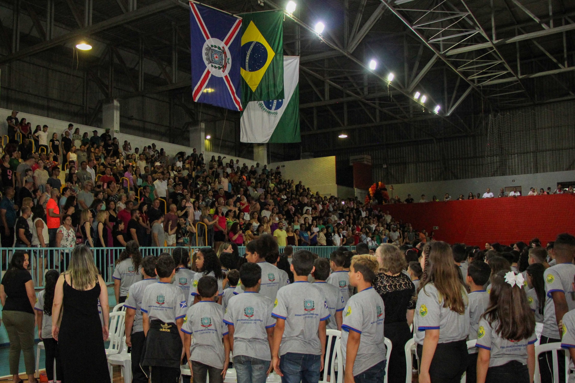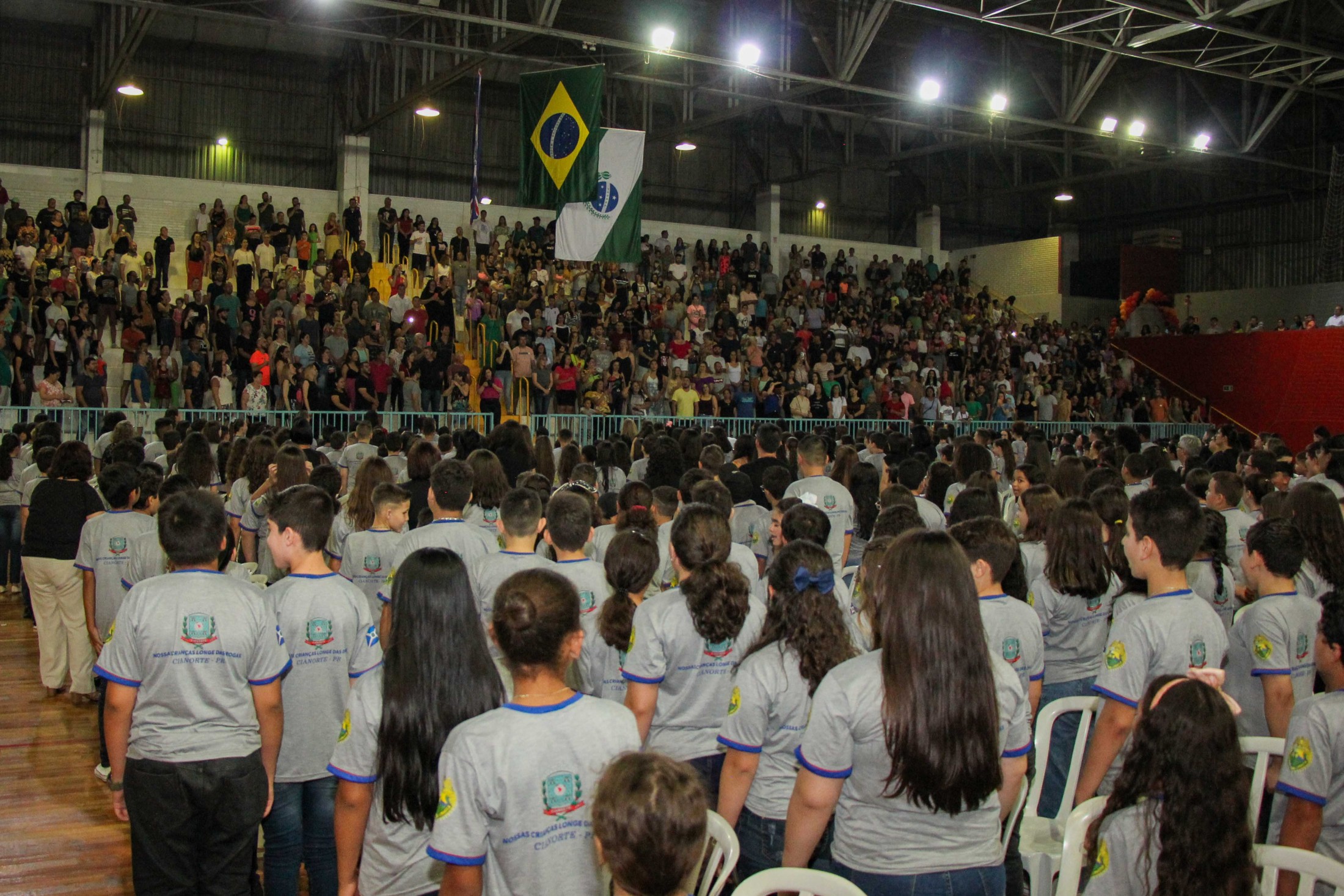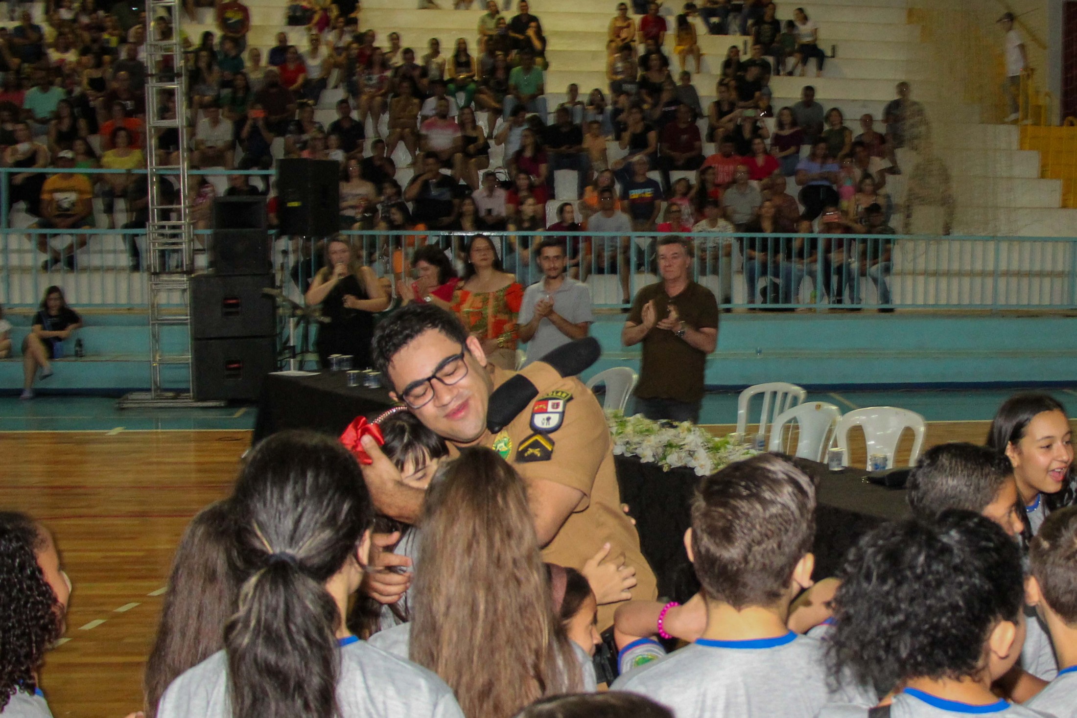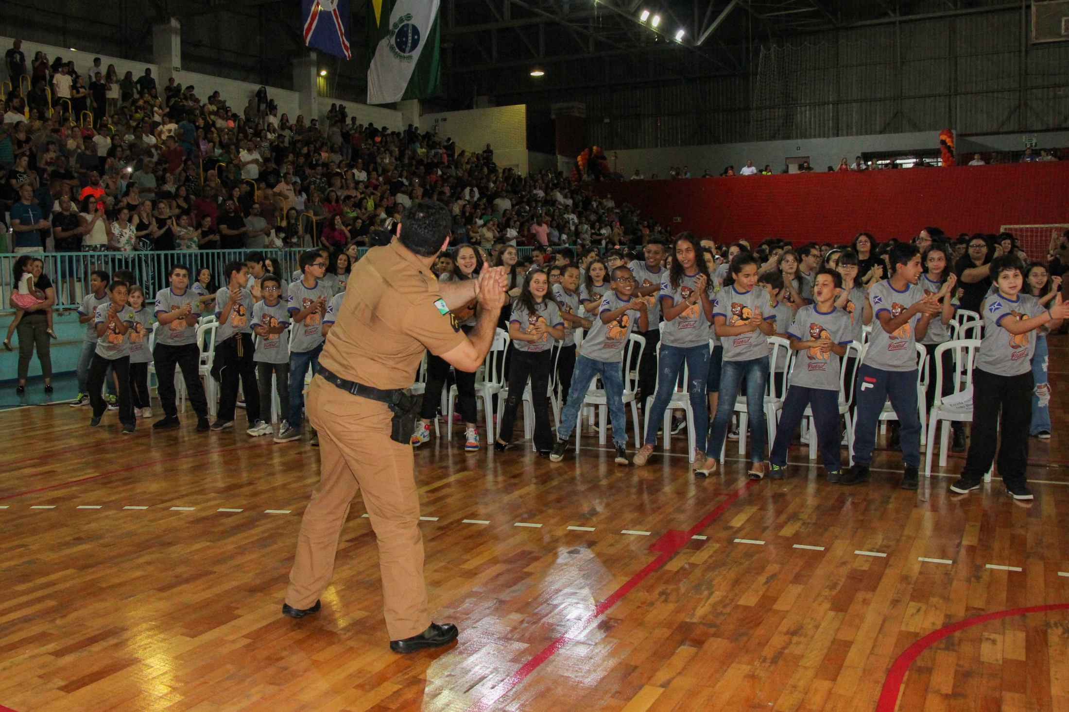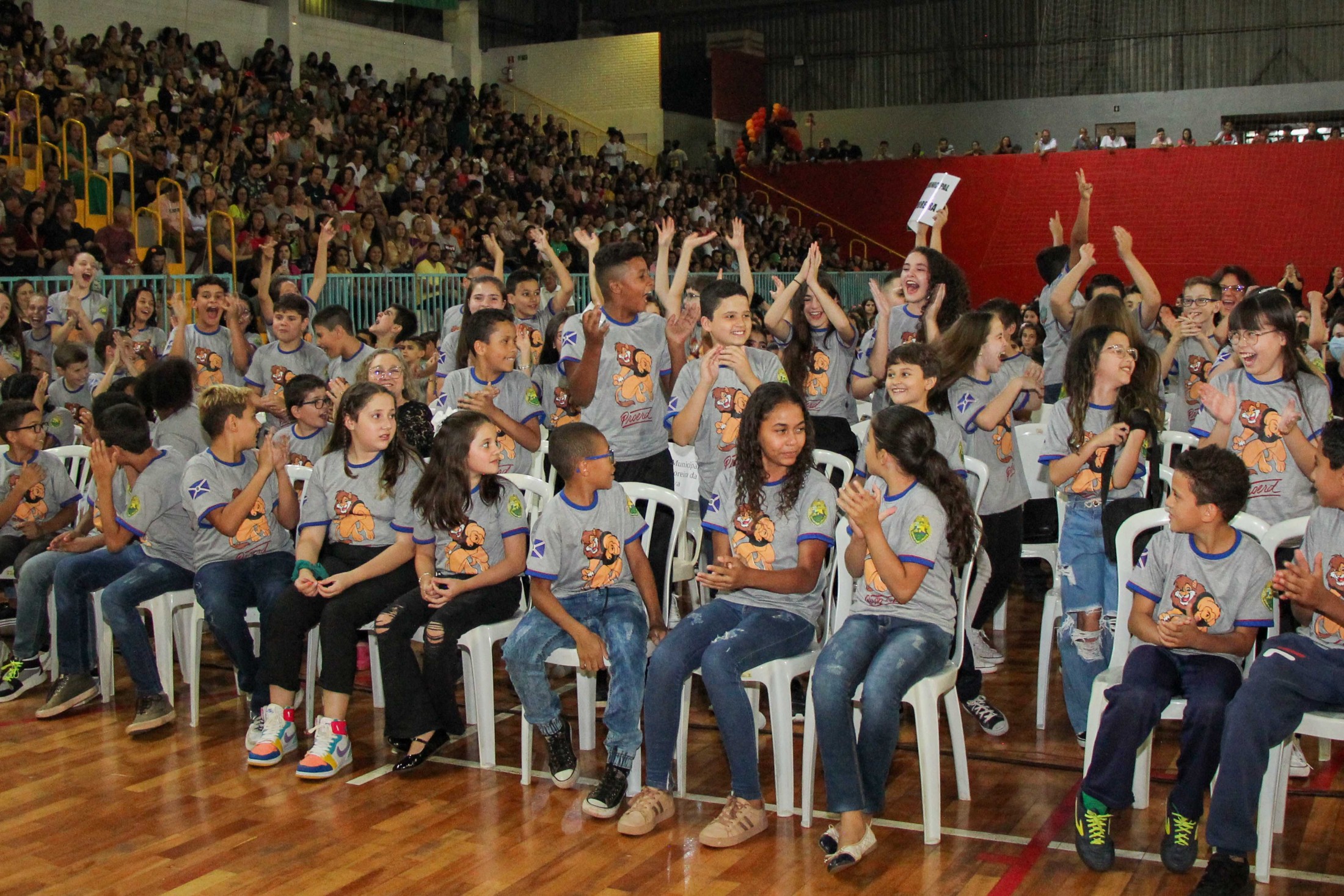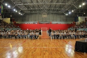 Emoção e alegria marcaram a solenidade de formatura do Programa Educacional de Resistência às Drogas e à Violência – Proerd, realizada na noite da última quinta-feira (10), no Ginásio de Esportes Tancredo Neves (Tancredão). O evento reuniu cerca de 3 mil pessoas, entre autoridades, militares, profissionais da educação, familiares e, aproximadamente, 670 estudantes do 5º ano do Ensino Fundamental, das 13 escolas da rede municipal de ensino, participantes do programa.