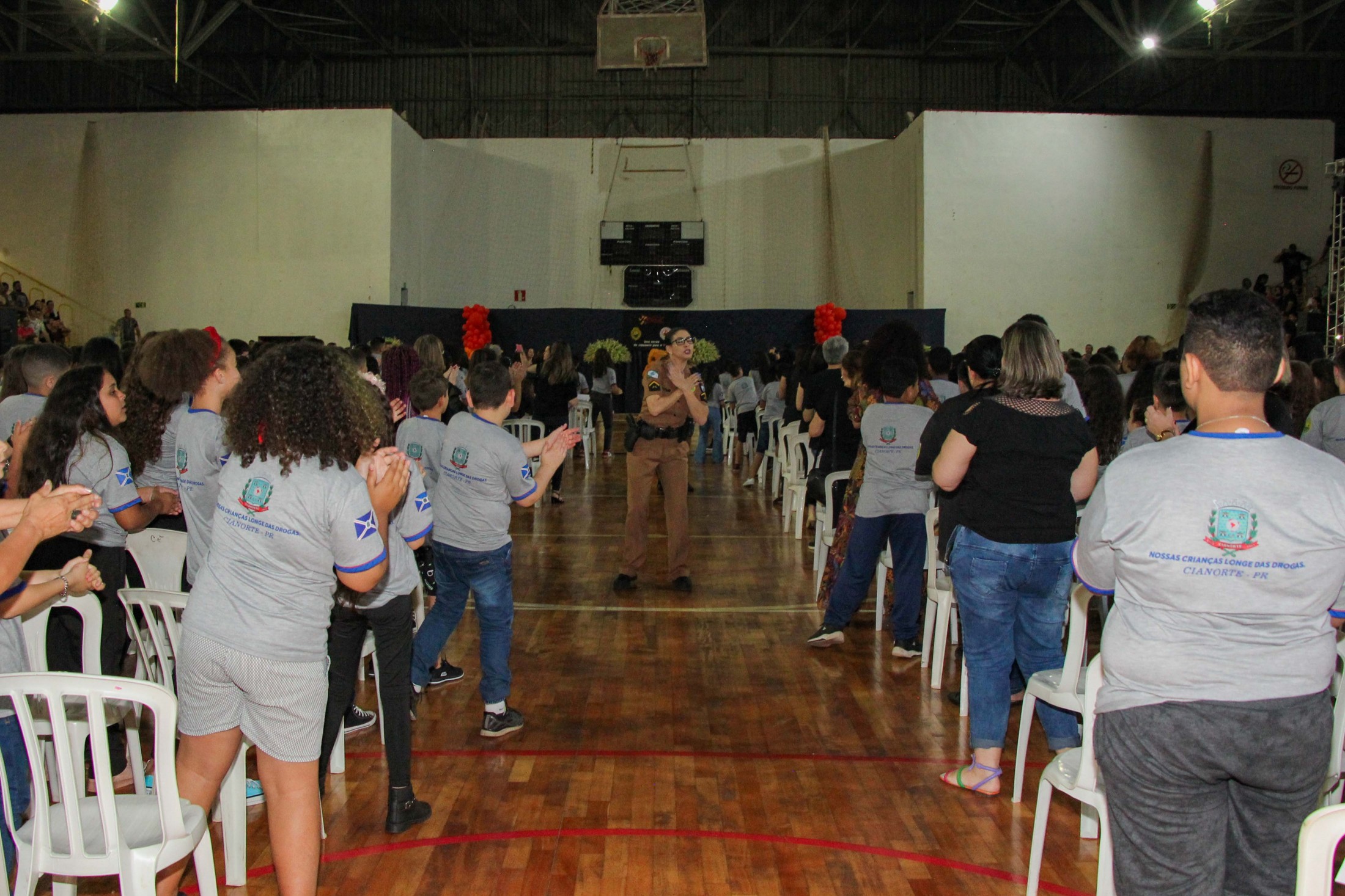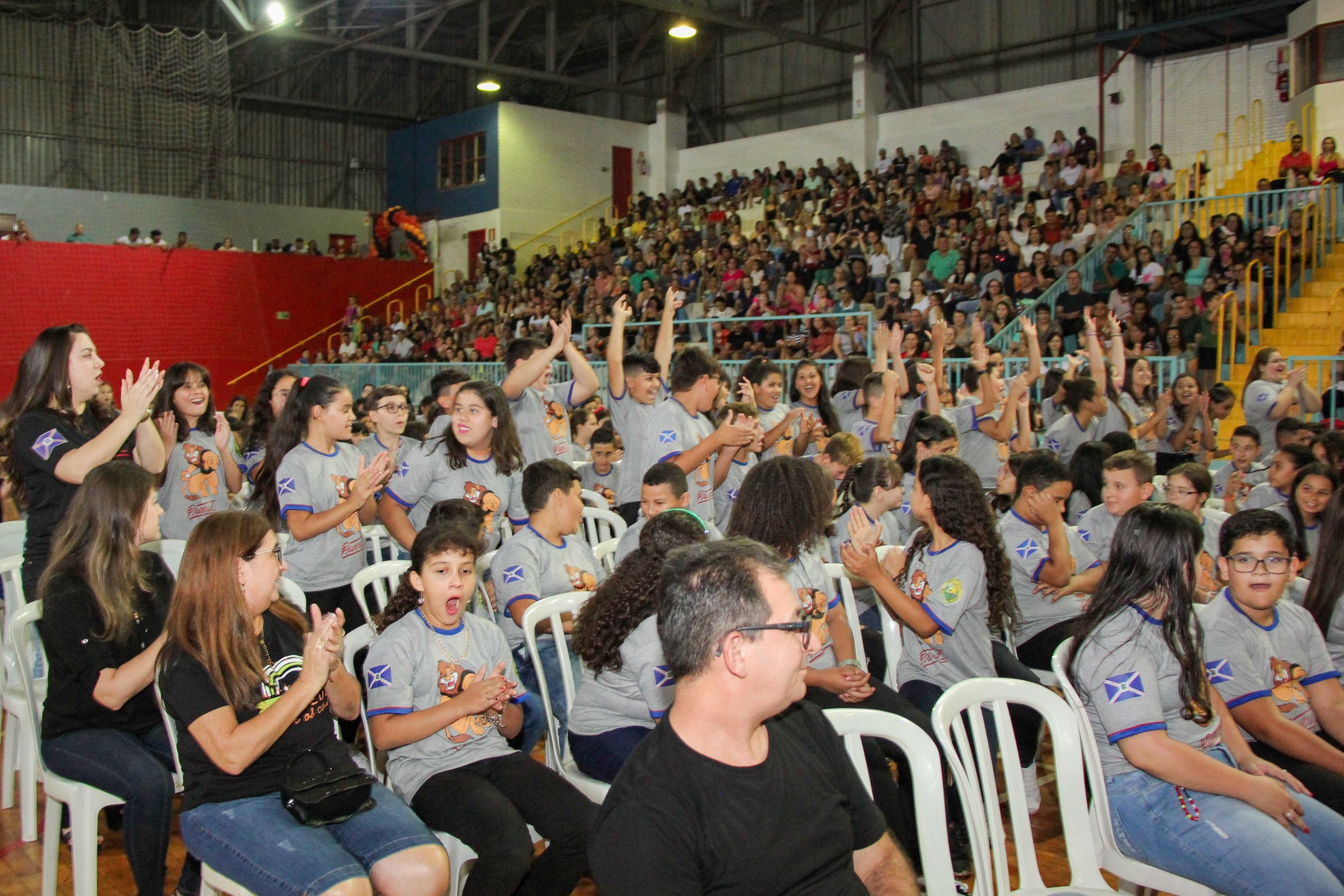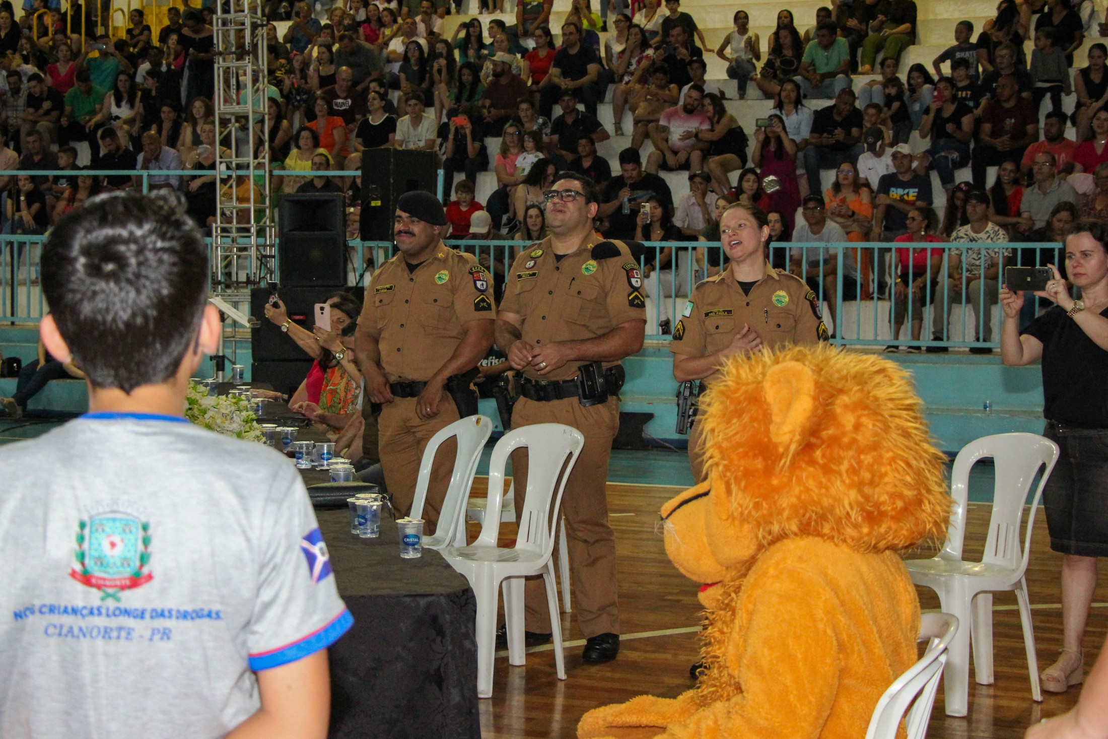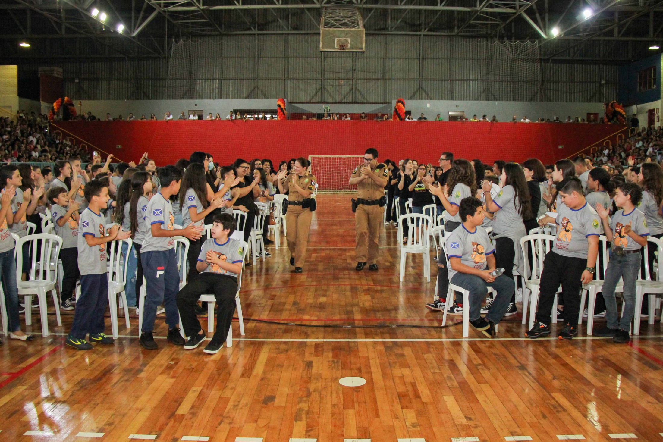 Emoção e alegria marcaram a solenidade de formatura do Programa Educacional de Resistência às Drogas e à Violência – Proerd, realizada na noite da última quinta-feira (10), no Ginásio de Esportes Tancredo Neves (Tancredão). O evento reuniu cerca de 3 mil pessoas, entre autoridades, militares, profissionais da educação, familiares e, aproximadamente, 670 estudantes do 5º ano do Ensino Fundamental, das 13 escolas da rede municipal de ensino, participantes do programa.
