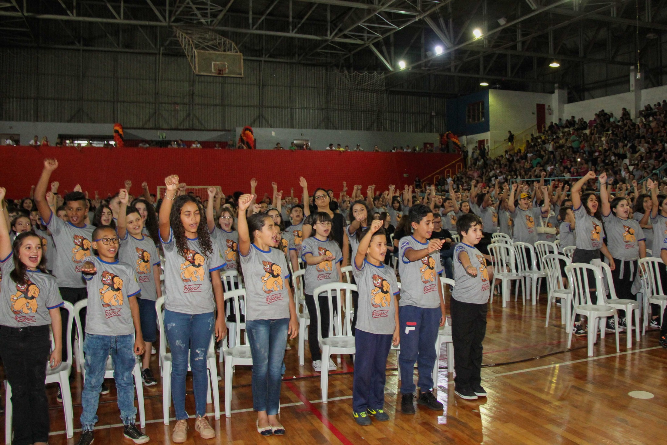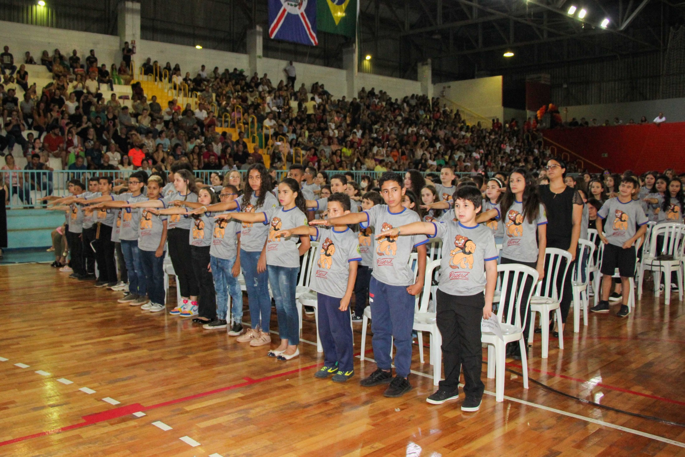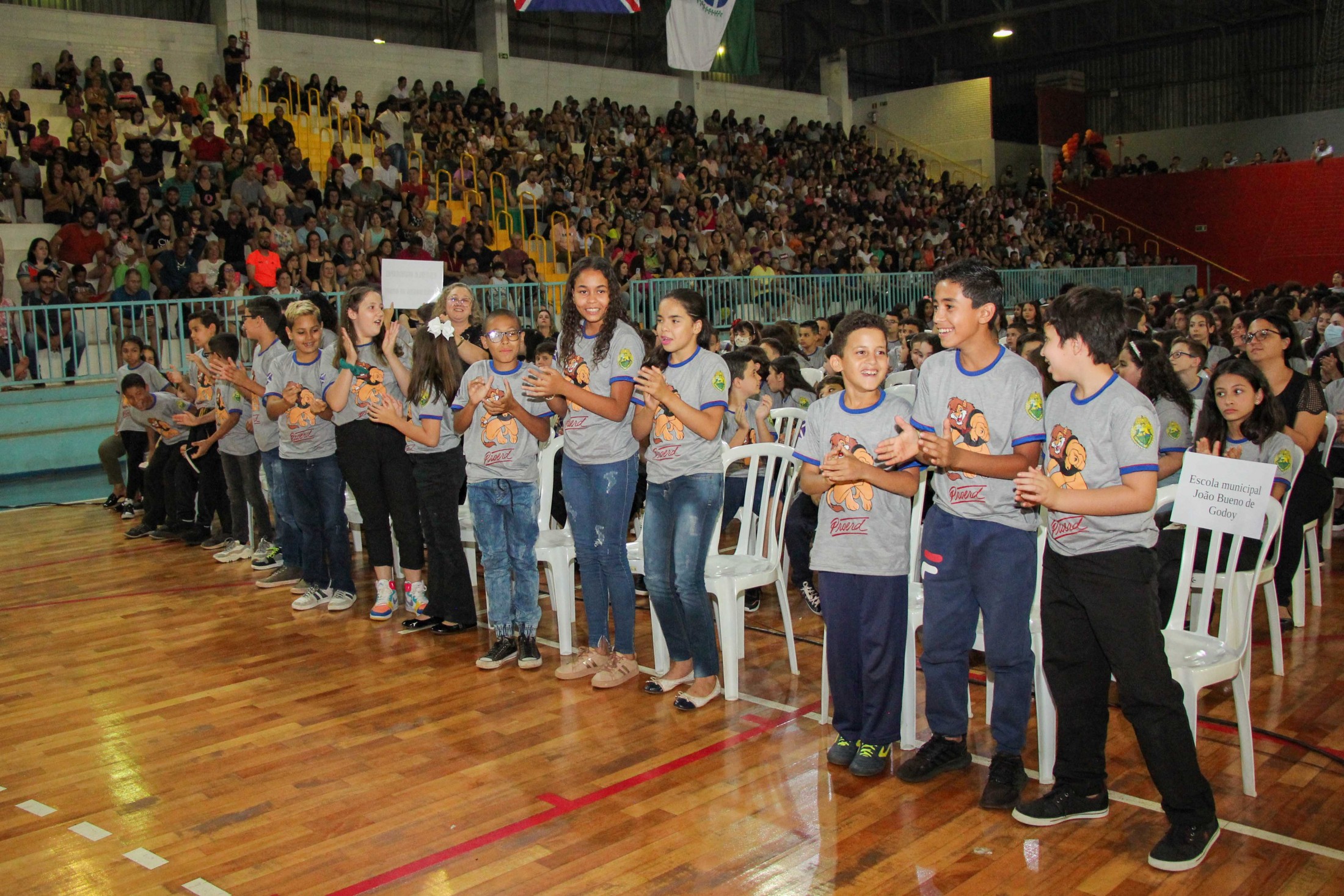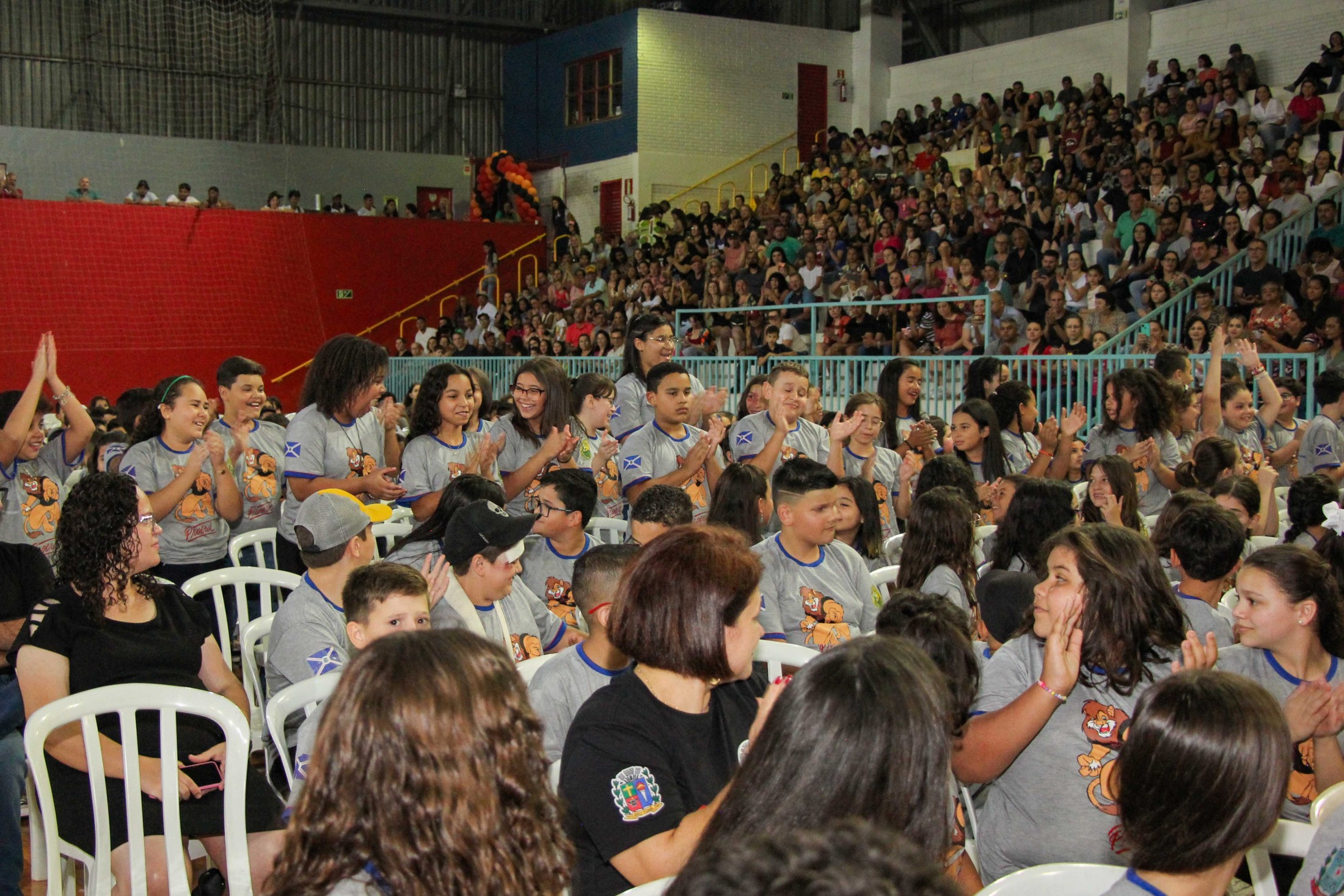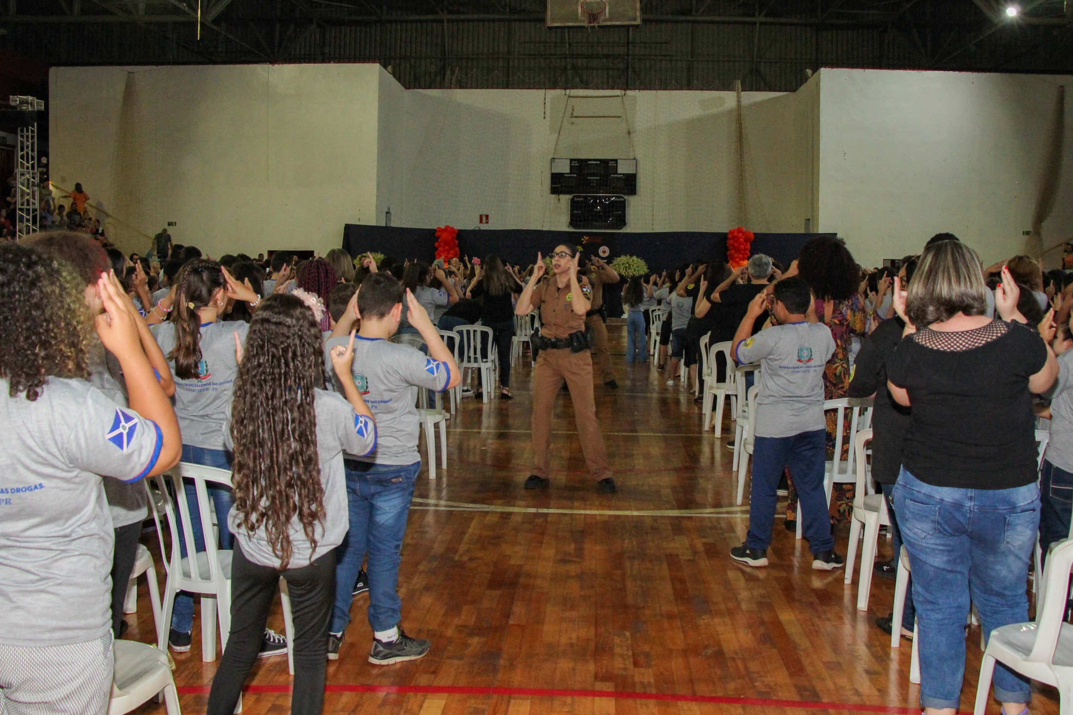 Emoção e alegria marcaram a solenidade de formatura do Programa Educacional de Resistência às Drogas e à Violência – Proerd, realizada na noite da última quinta-feira (10), no Ginásio de Esportes Tancredo Neves (Tancredão). O evento reuniu cerca de 3 mil pessoas, entre autoridades, militares, profissionais da educação, familiares e, aproximadamente, 670 estudantes do 5º ano do Ensino Fundamental, das 13 escolas da rede municipal de ensino, participantes do programa.