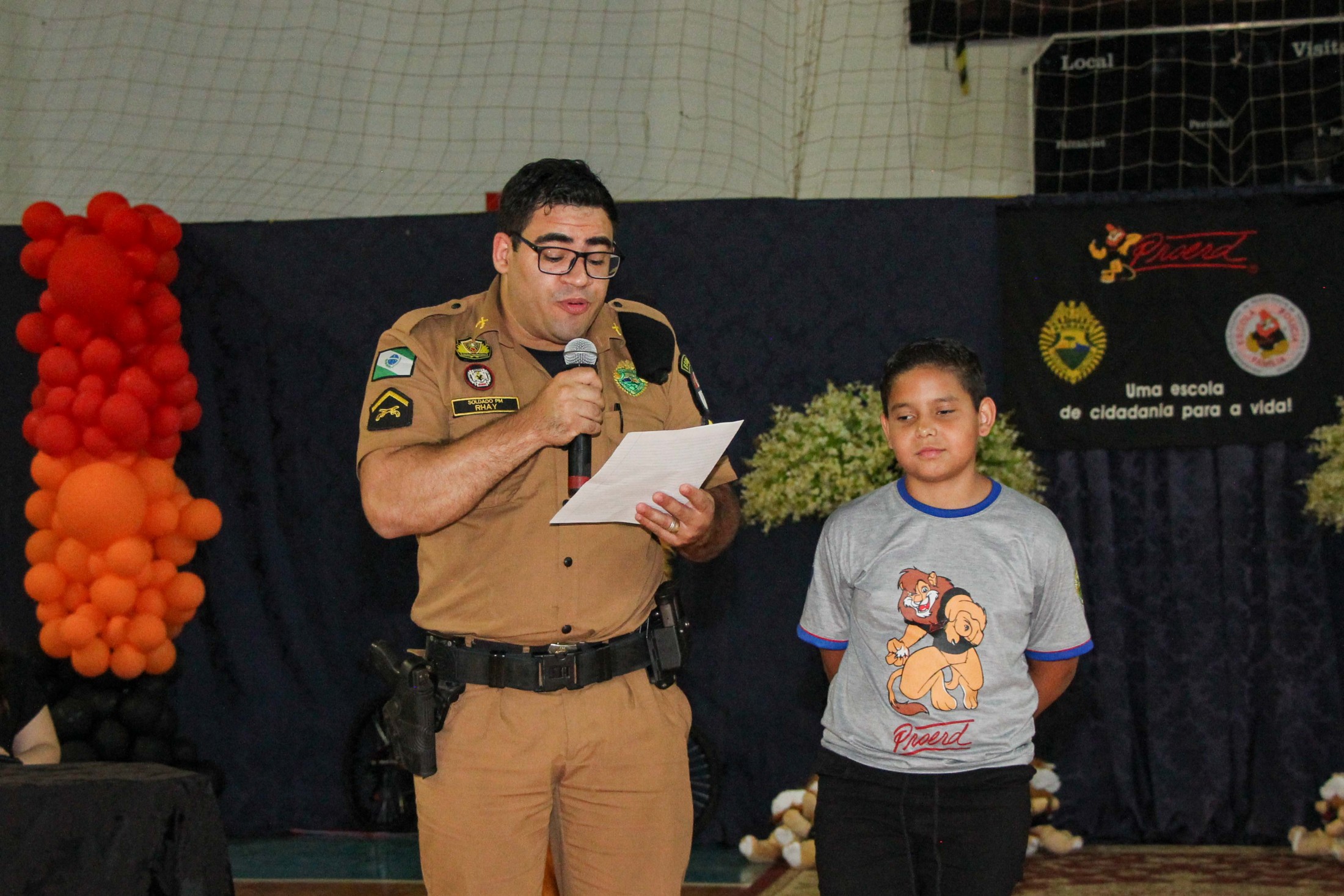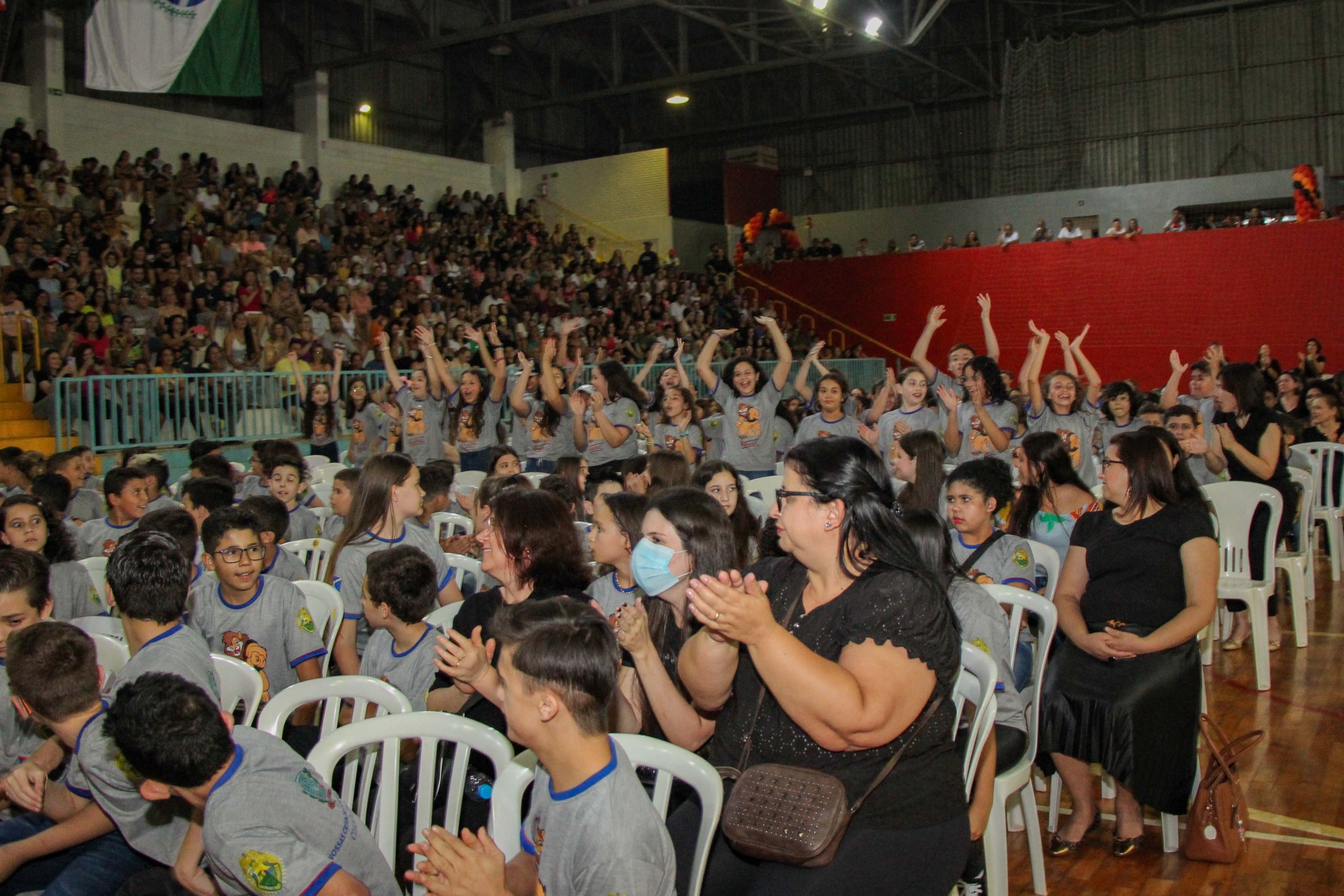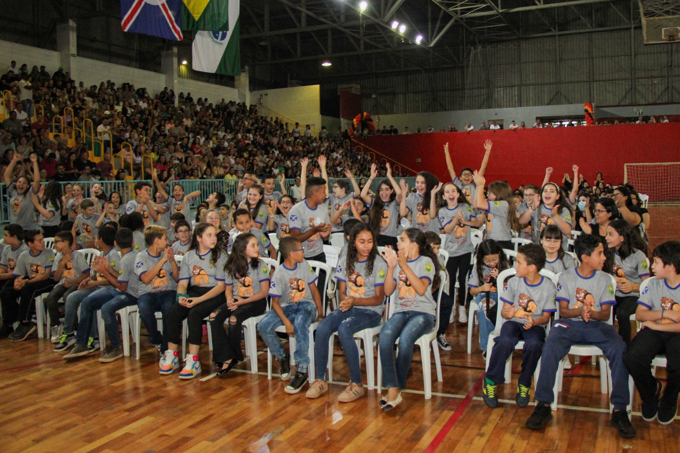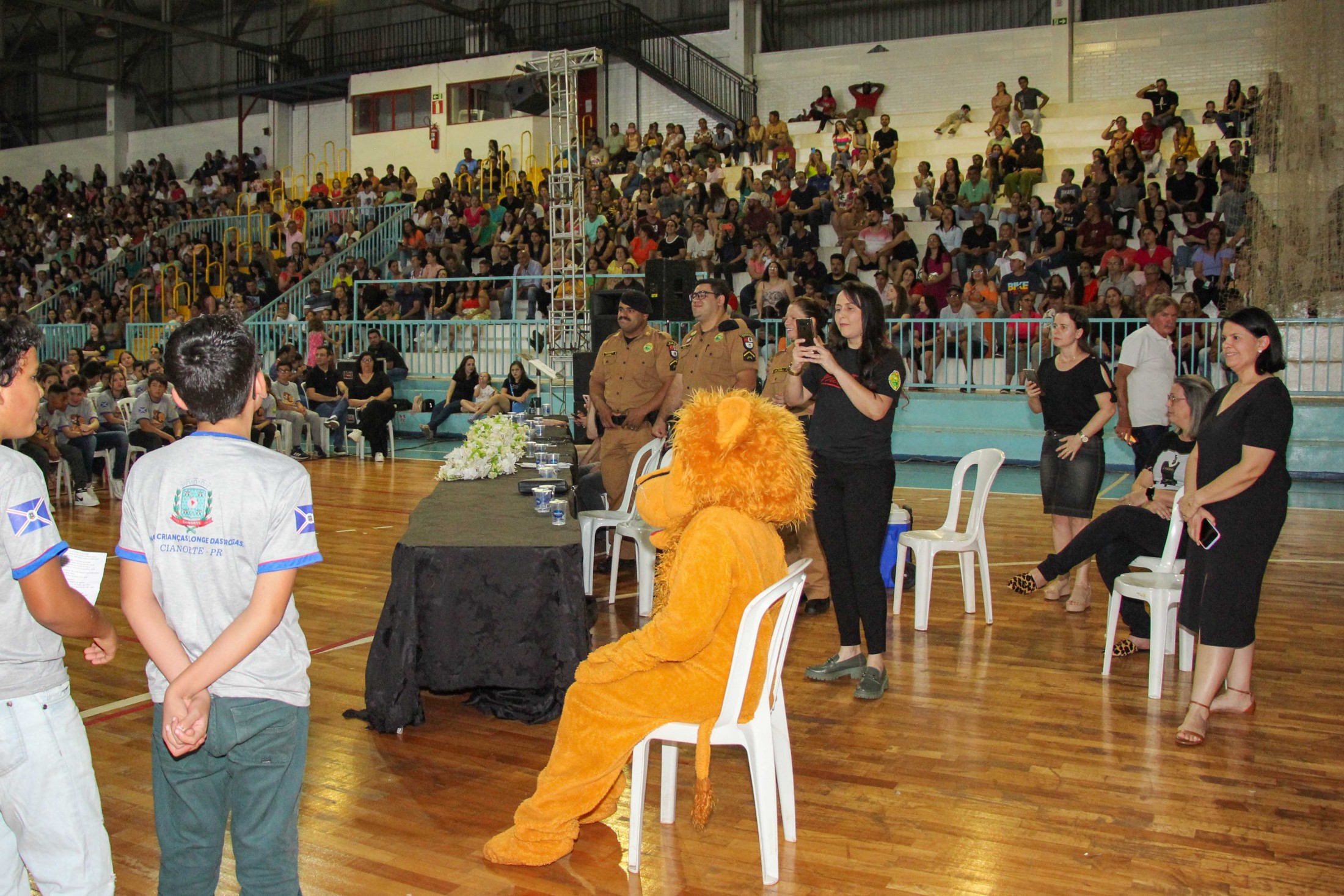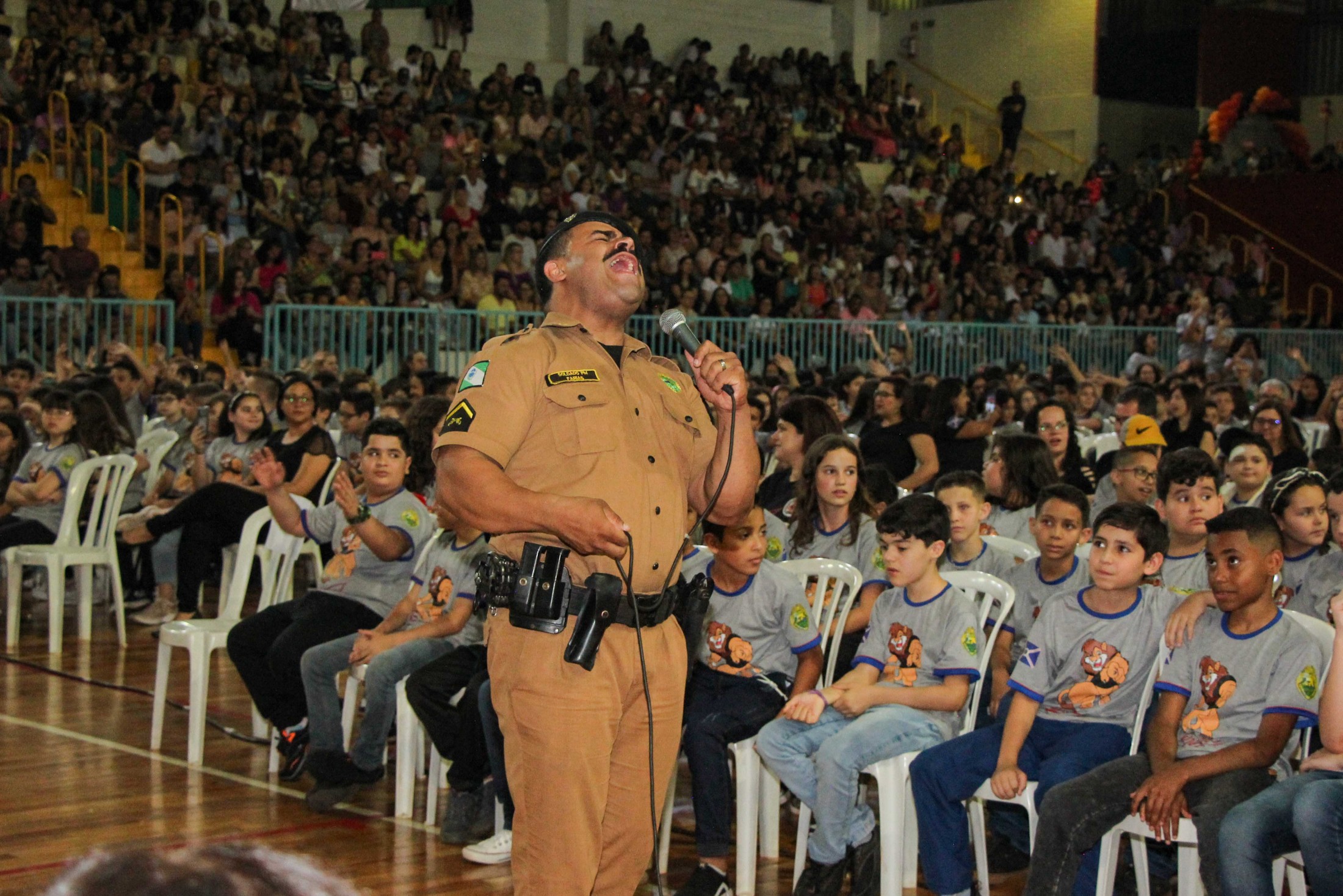 Emoção e alegria marcaram a solenidade de formatura do Programa Educacional de Resistência às Drogas e à Violência – Proerd, realizada na noite da última quinta-feira (10), no Ginásio de Esportes Tancredo Neves (Tancredão). O evento reuniu cerca de 3 mil pessoas, entre autoridades, militares, profissionais da educação, familiares e, aproximadamente, 670 estudantes do 5º ano do Ensino Fundamental, das 13 escolas da rede municipal de ensino, participantes do programa.