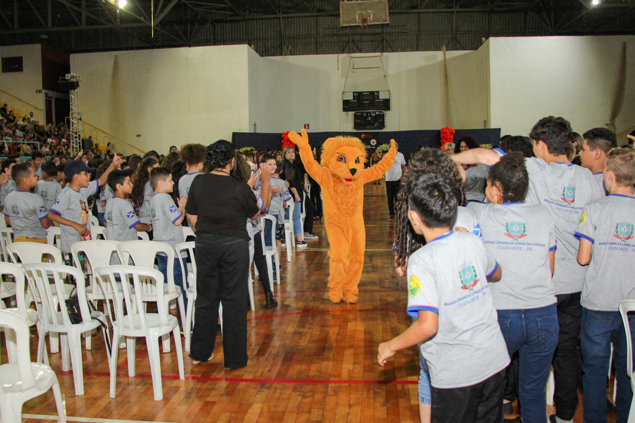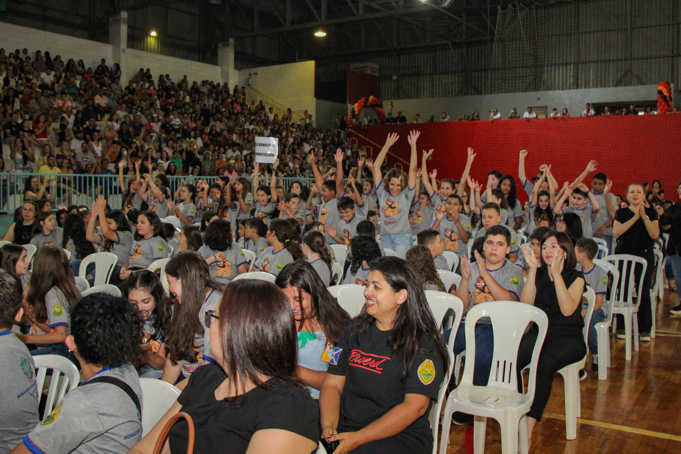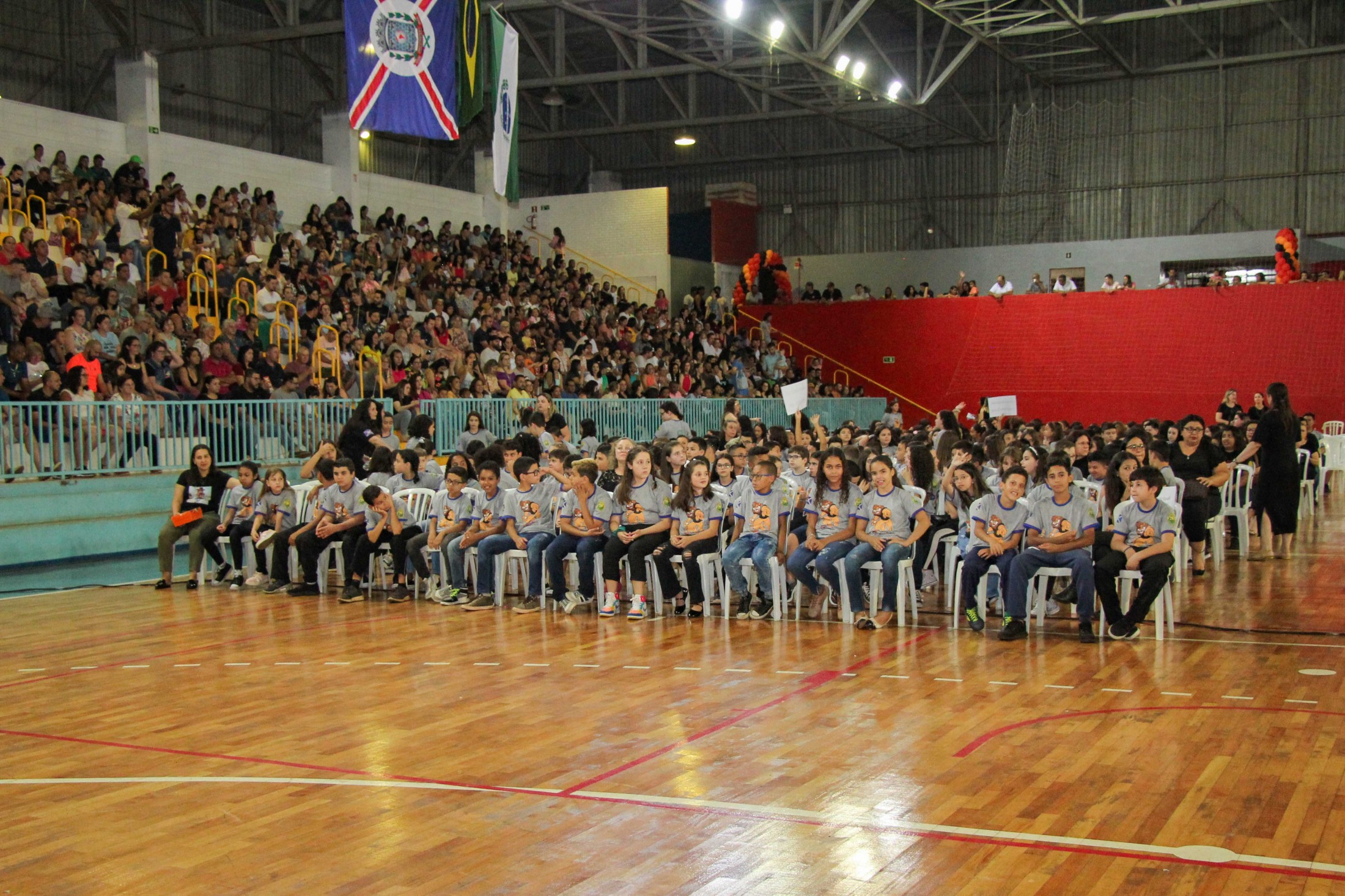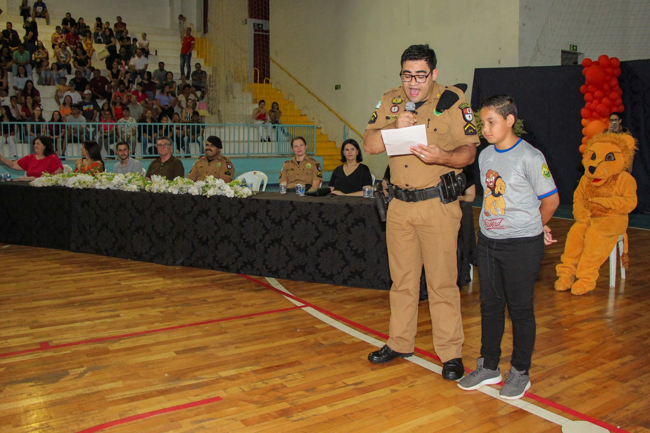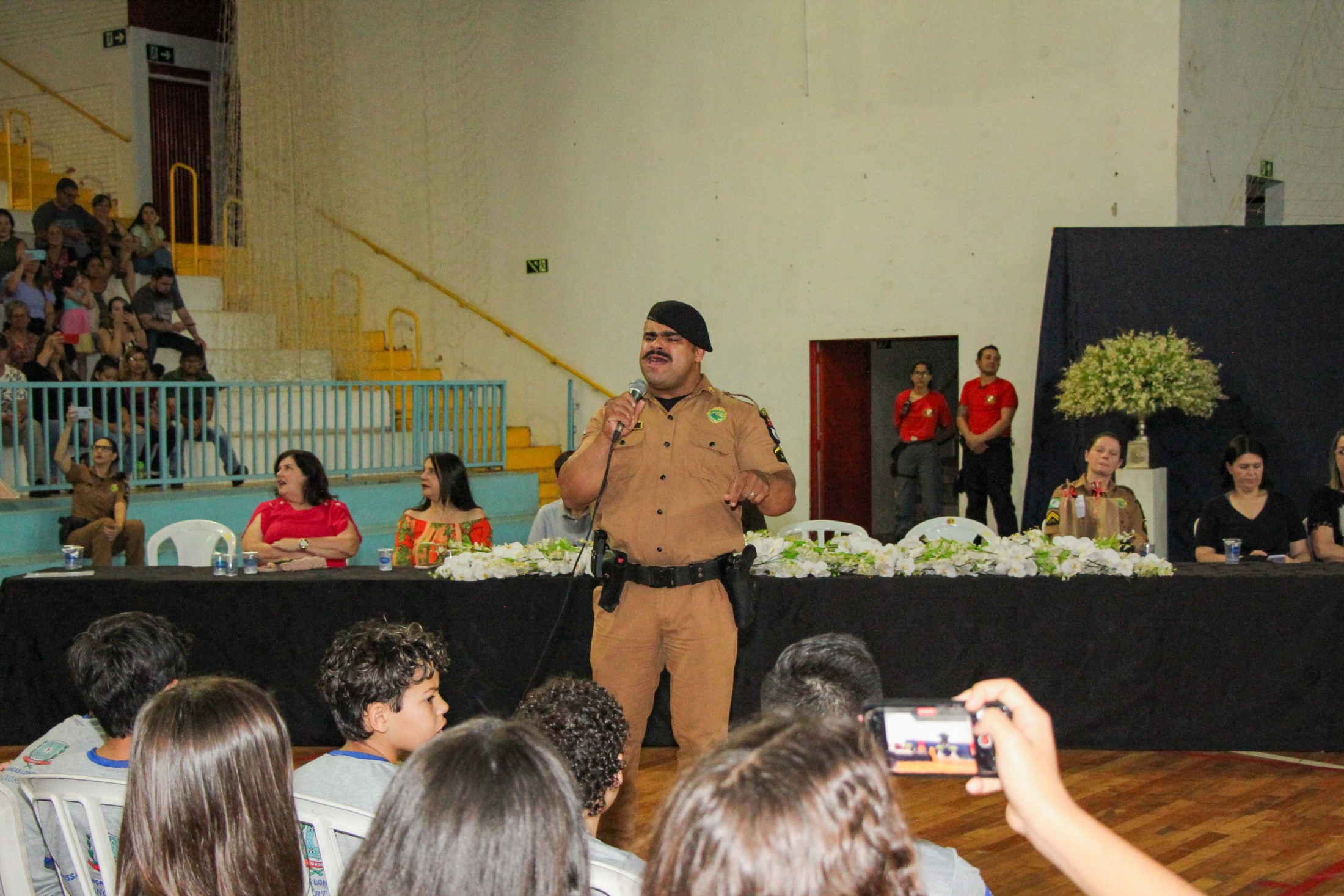 Emoção e alegria marcaram a solenidade de formatura do Programa Educacional de Resistência às Drogas e à Violência – Proerd, realizada na noite da última quinta-feira (10), no Ginásio de Esportes Tancredo Neves (Tancredão). O evento reuniu cerca de 3 mil pessoas, entre autoridades, militares, profissionais da educação, familiares e, aproximadamente, 670 estudantes do 5º ano do Ensino Fundamental, das 13 escolas da rede municipal de ensino, participantes do programa.