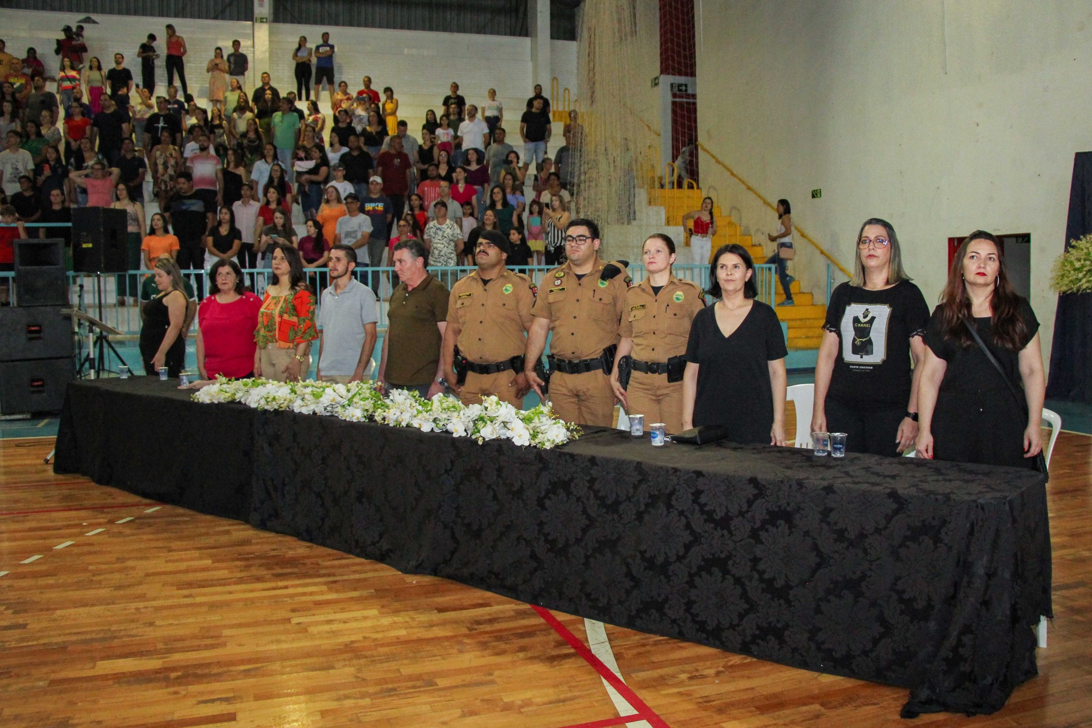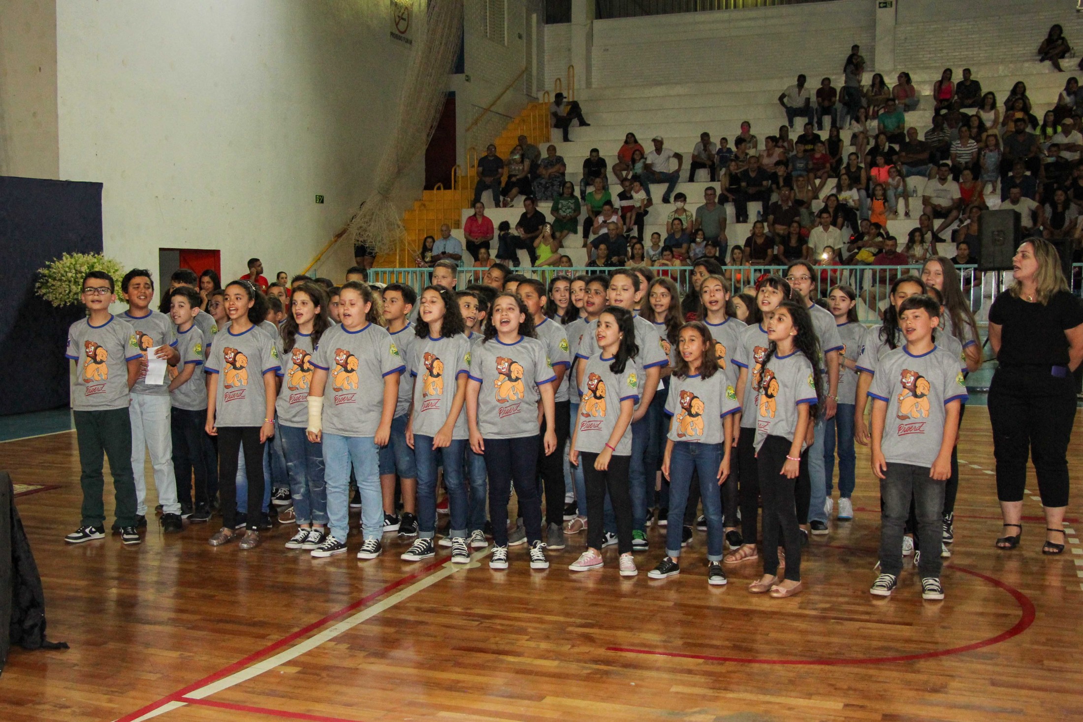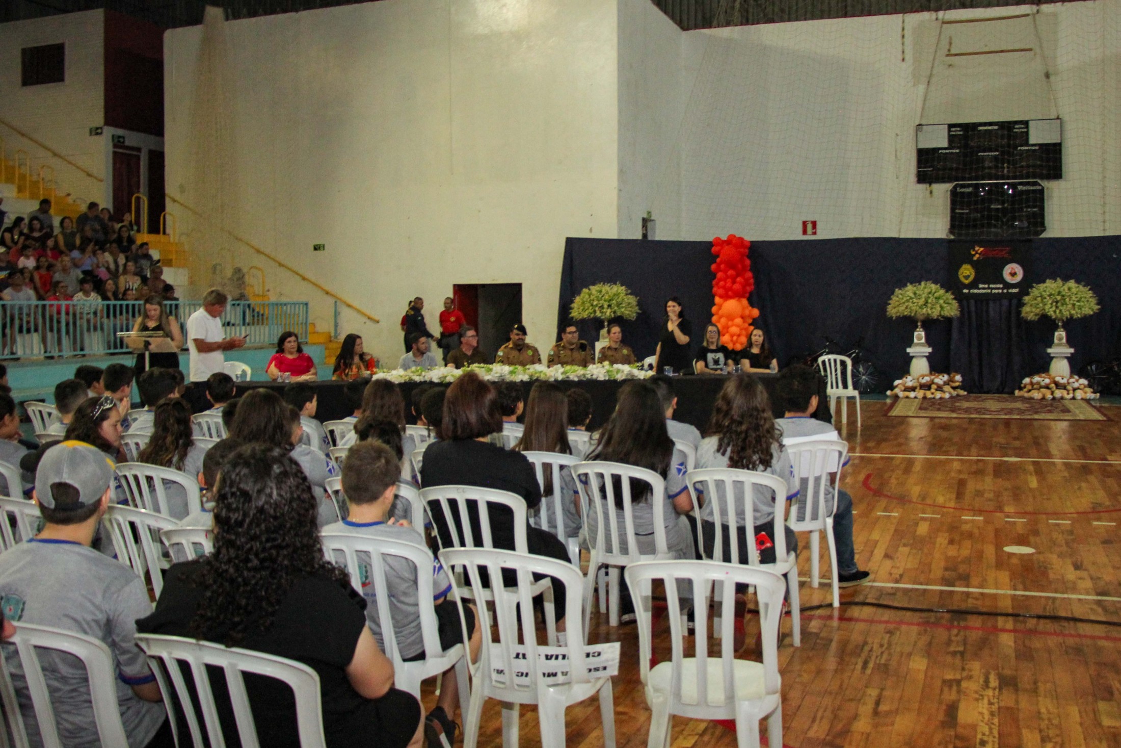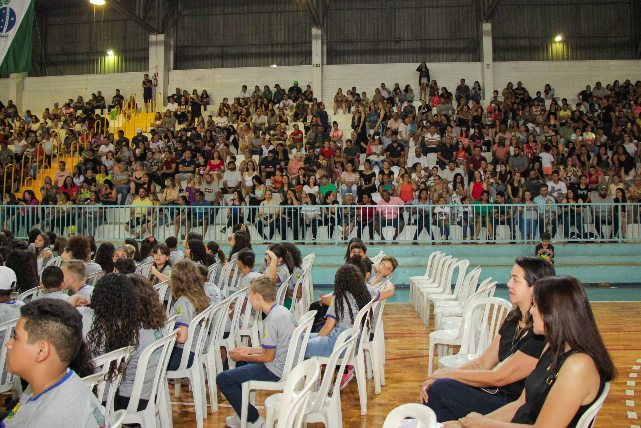 Emoção e alegria marcaram a solenidade de formatura do Programa Educacional de Resistência às Drogas e à Violência – Proerd, realizada na noite da última quinta-feira (10), no Ginásio de Esportes Tancredo Neves (Tancredão). O evento reuniu cerca de 3 mil pessoas, entre autoridades, militares, profissionais da educação, familiares e, aproximadamente, 670 estudantes do 5º ano do Ensino Fundamental, das 13 escolas da rede municipal de ensino, participantes do programa.