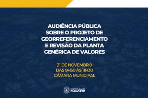 No Edital de Convocação de Audiência Pública, publicado no Órgão Oficial do Município, no dia 04 de novembro (Edição nº 2430), também é assegurado aos participantes o direito de manifestação oral (de no máximo cinco minutos), observando a ordem sequencial do registro da intenção de fala na ocasião. “Contamos com a participação da população, uma vez que o projeto afeta a todos os cianortenses. Acreditamos que o georreferenciamento possibilitará que atuemos de forma planejada e inovadora. Poderemos utilizar tecnologias para solucionar problemas, criar oportunidades e oferecer serviços com eficiência”, afirmou o prefeito, Marco Franzato.