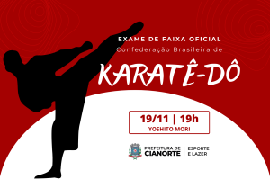 Neste sábado (19), o Centro Poliesportivo Carlos Yoshito Mori recebe, às 19h, o Exame de Faixa Oficial de Karatê-Dô com os alunos que adquiriram a qualificação durante o ano. O evento será a graduação dos atletas que participaram dos treinos e eventos realizados pela Secretaria Municipal de Esporte e Lazer (SMEL) e pela Confederação Brasileira de Karatê-Dô (CBKD).
