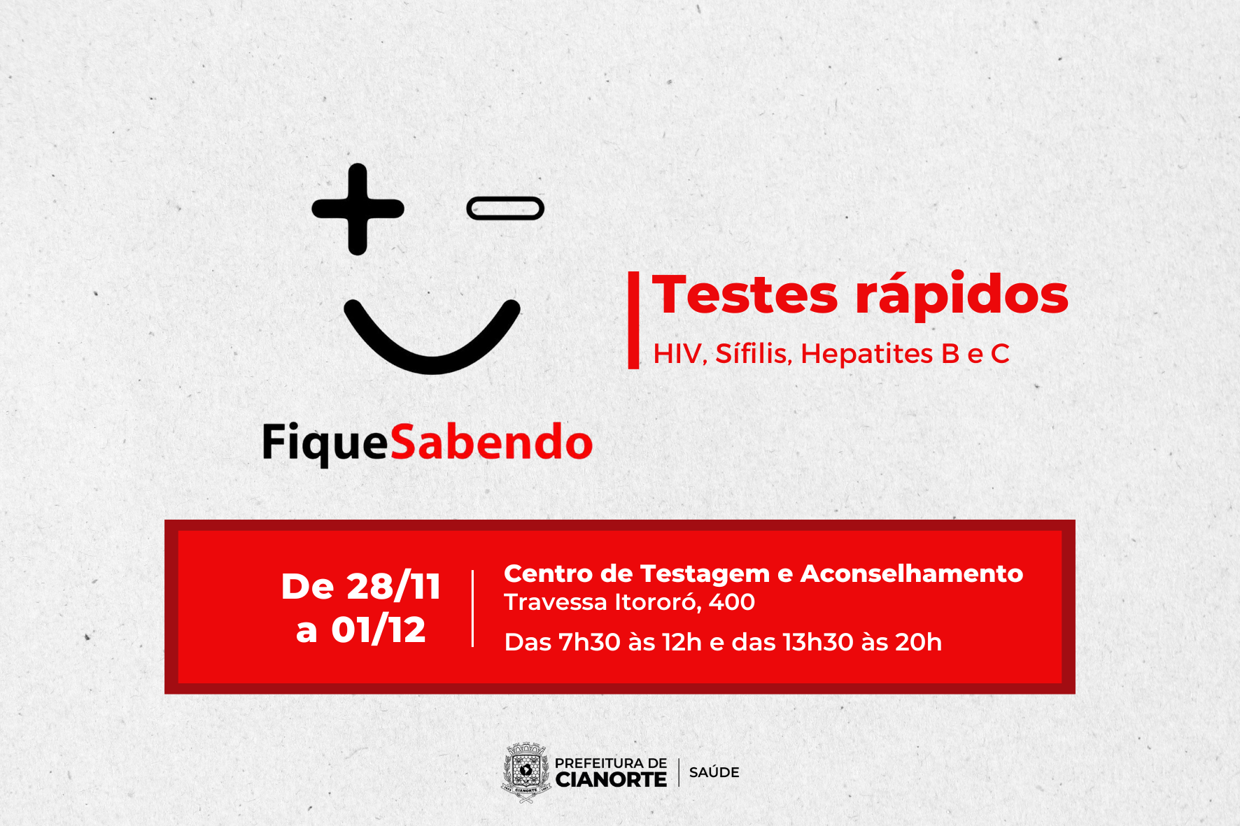 “O horário de atendimento estendido visa oportunizar o acesso das pessoas que têm dificuldade de comparecer durante o expediente e acabam postergando ou não encontrando tempo para realizar os testes e, consequentemente, cuidar da saúde. Assim, orientamos para que aproveitem a oportunidade e tirem as dúvidas. Quando mais cedo a infecção for detectada, é melhor para o tratamento e evita a transmissão”, recomenda a secretária municipal de Saúde, Rebeca Galacci.