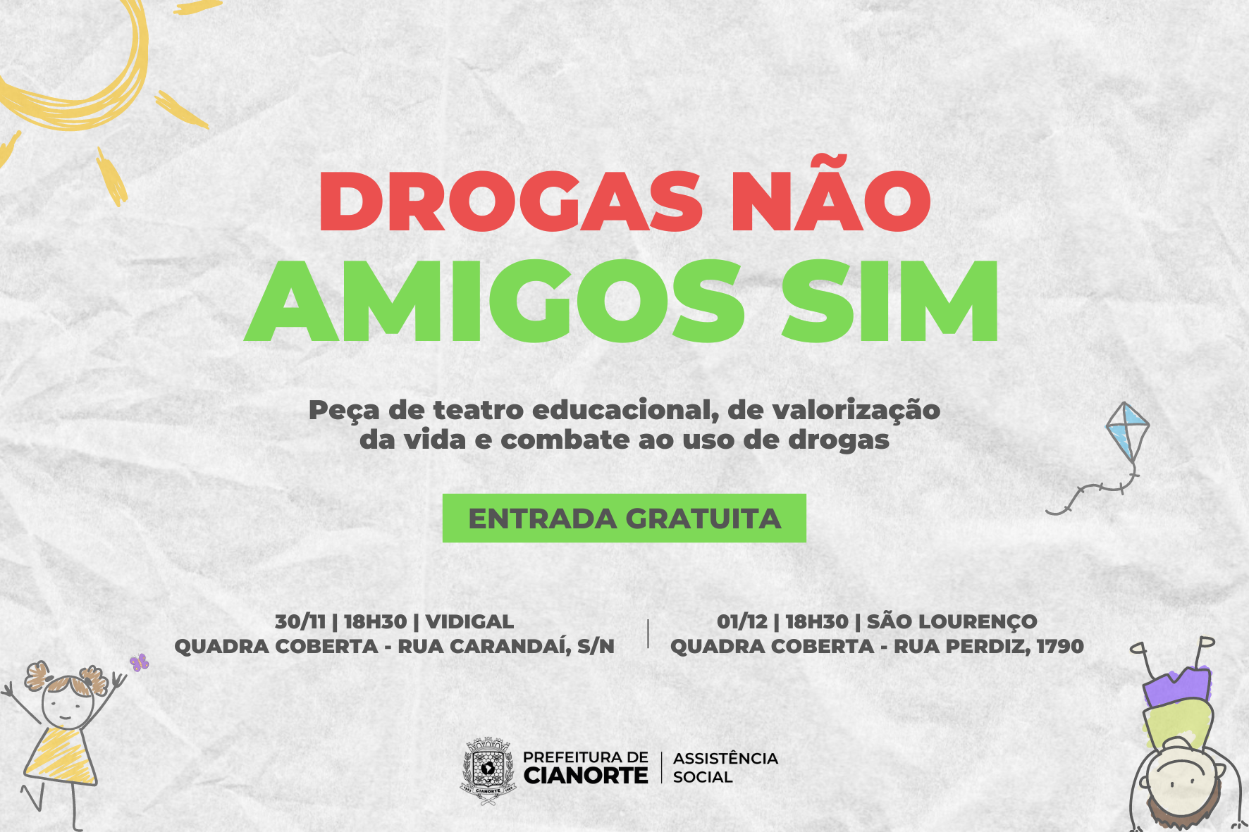 A Secretaria Municipal de Assistência Social tem um convite especial aos moradores dos distritos de Cianorte: a peça teatral “Drogas Não, Amigos Sim” que, com entrada gratuita, visa promover a valorização da vida e o combate ao uso de substâncias psicoativas. Três palhaços contam a história da Mariquinha, uma menina triste, sozinha e influenciável, que precisa da ajuda dos heróis mirins, o Super Cérebro e o Super Força, para não entrar no mundo das drogas. Juntos, eles aprontam várias peripécias, passando uma mensagem leve e descontraída para ter uma vida longe dos vícios e perto dos amigos de verdade.