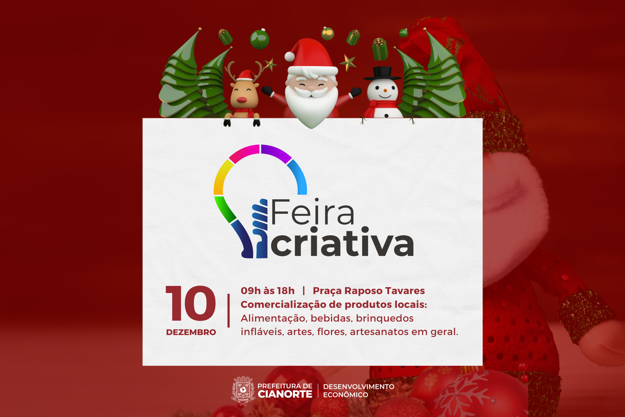 Neste sábado (10), os cianortenses e visitantes têm uma ótima opção para compras e lazer: a Feira Criativa, na Praça Raposo Tavares, das 9h às 18h, com artigos para presente, artesanato, decoração, plantas, praça de alimentação e espaço para a diversão das crianças. A iniciativa, da Secretaria Municipal de Desenvolvimento Econômico em parceria com o Conselho Municipal de Turismo (Comtur), é realizada uma vez por mês, sempre no segundo sábado, e chega à sua última edição de 2022, com o tema especial de Natal.
