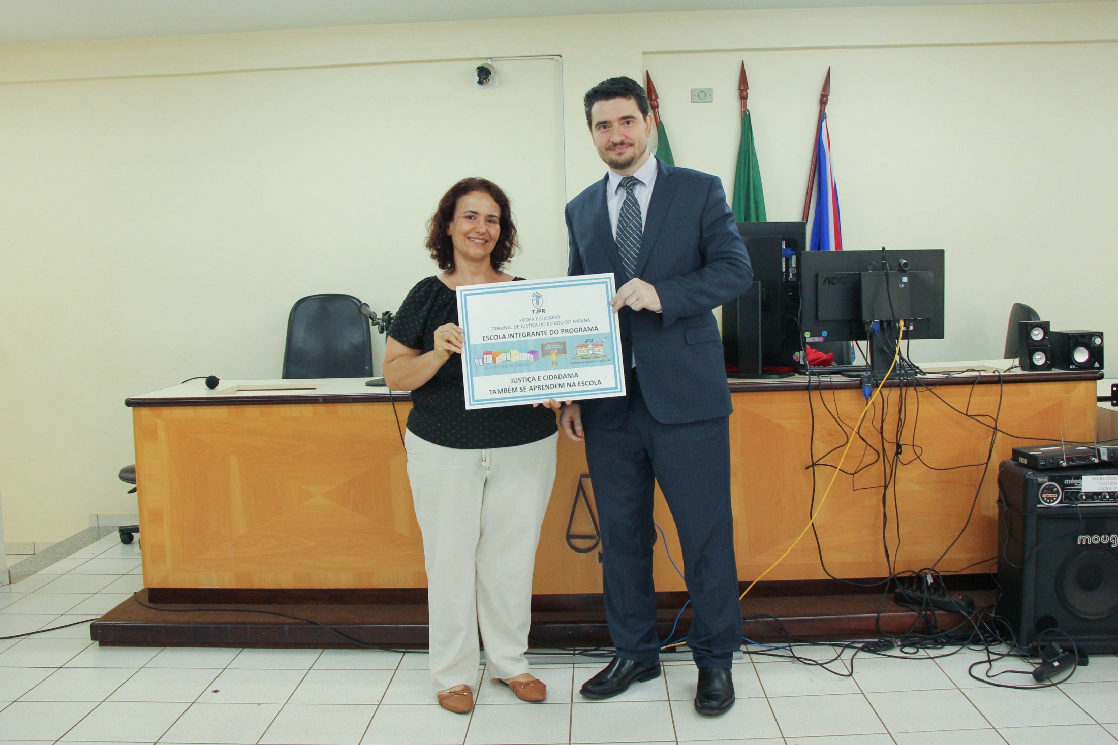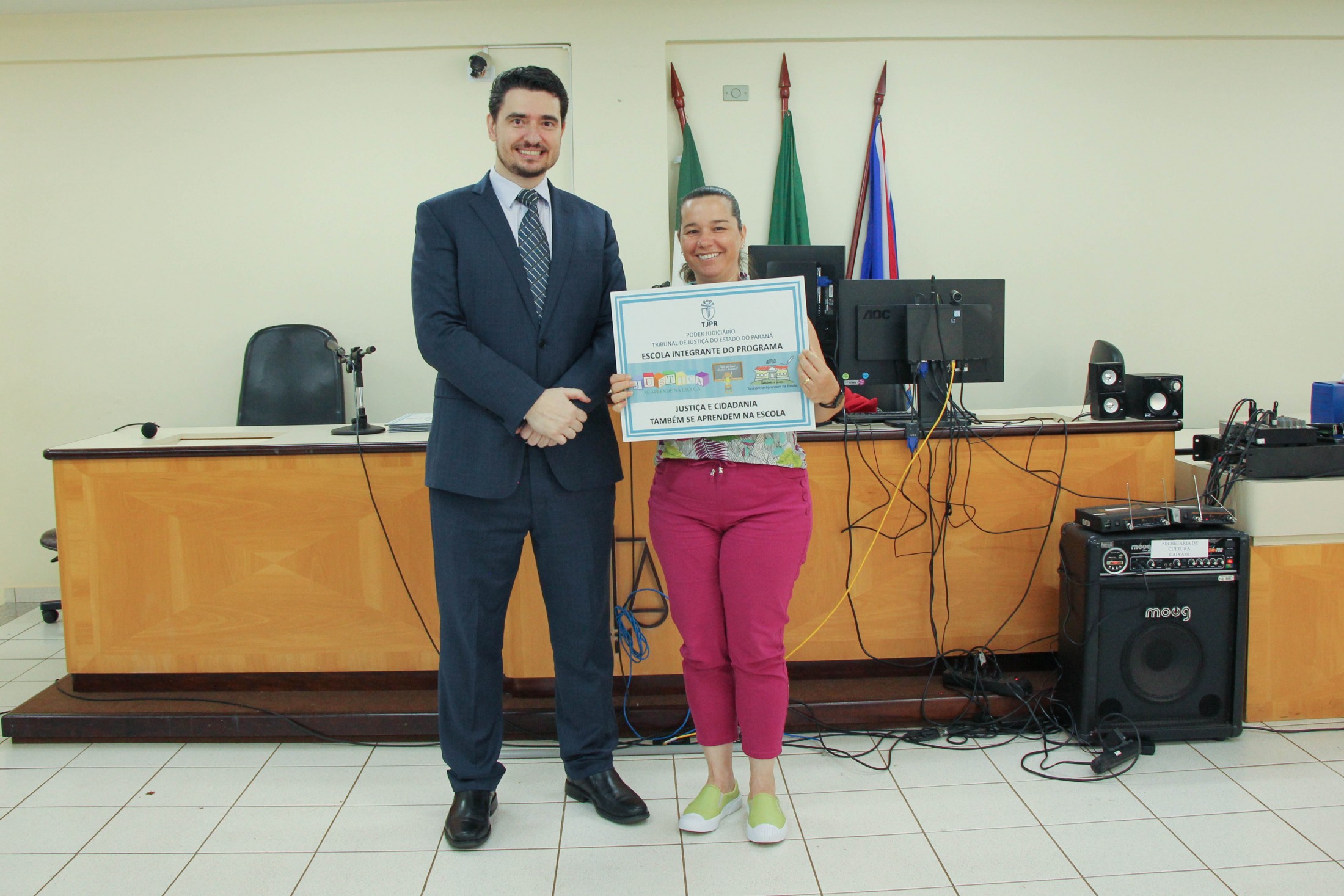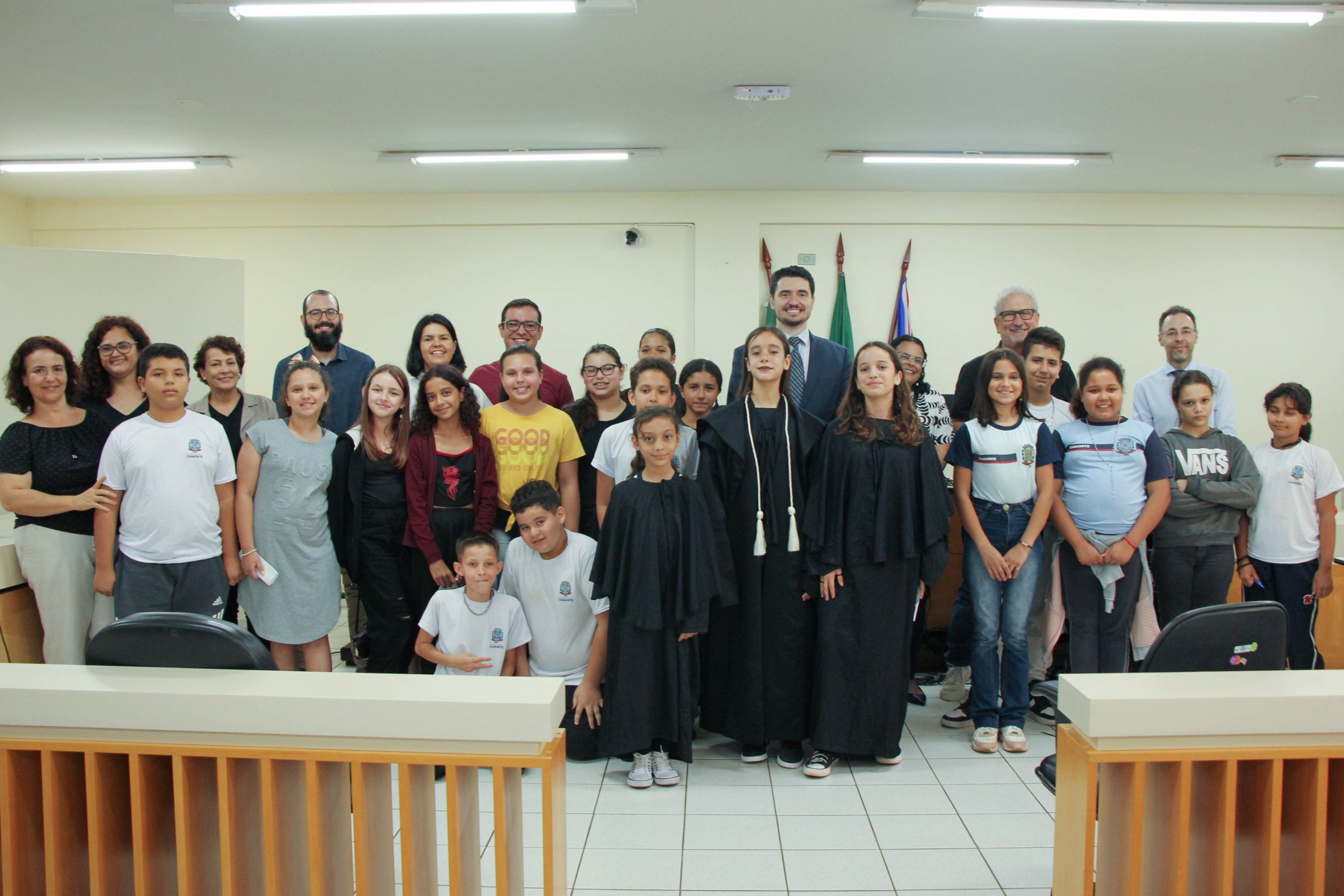Na manhã desta segunda-feira (12), no Fórum da Comarca de Cianorte, uma solenidade marcou o encerramento do programa “Cidadania e Justiça também se aprendem na Escola”, desenvolvido pelo Tribunal de Justiça do Paraná junto aos 5ºs anos das 13 escolas municipais. A iniciativa visa oferecer noções básicas de justiça e cidadania e sobre o funcionamento do Poder Judiciário a alunos da rede pública de ensino.