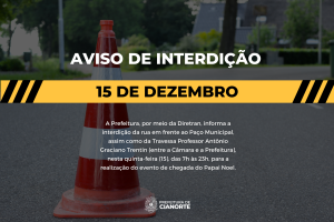 A Prefeitura, por meio da Diretran, informa a interdição da rua em frente ao Paço Municipal, assim como da Travessa Professor Antônio Graciano Trentin (entre a Câmara e a Prefeitura), nesta quinta-feira (15), das 7h às 23h, para a realização do evento de chegada do Papai Noel.