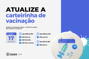 Os cianortenses com vacinas em atraso têm a oportunidade de colocar em dia neste sábado (17). As Unidades Básicas de Saúde (UBSs) do Setor 04, Marselha e São Lourenço prestarão atendimento das 8h às 16h. Já a da Zona 02, das 8h às 12h; e a do Setor 08, das 13h às 16h. Serão disponibilizadas todas as imunizações do calendário básico de rotina, assim como as contra a Covid-19 para os públicos a partir dos 5 anos e a 4ª dose para pessoas acima dos 18 anos.