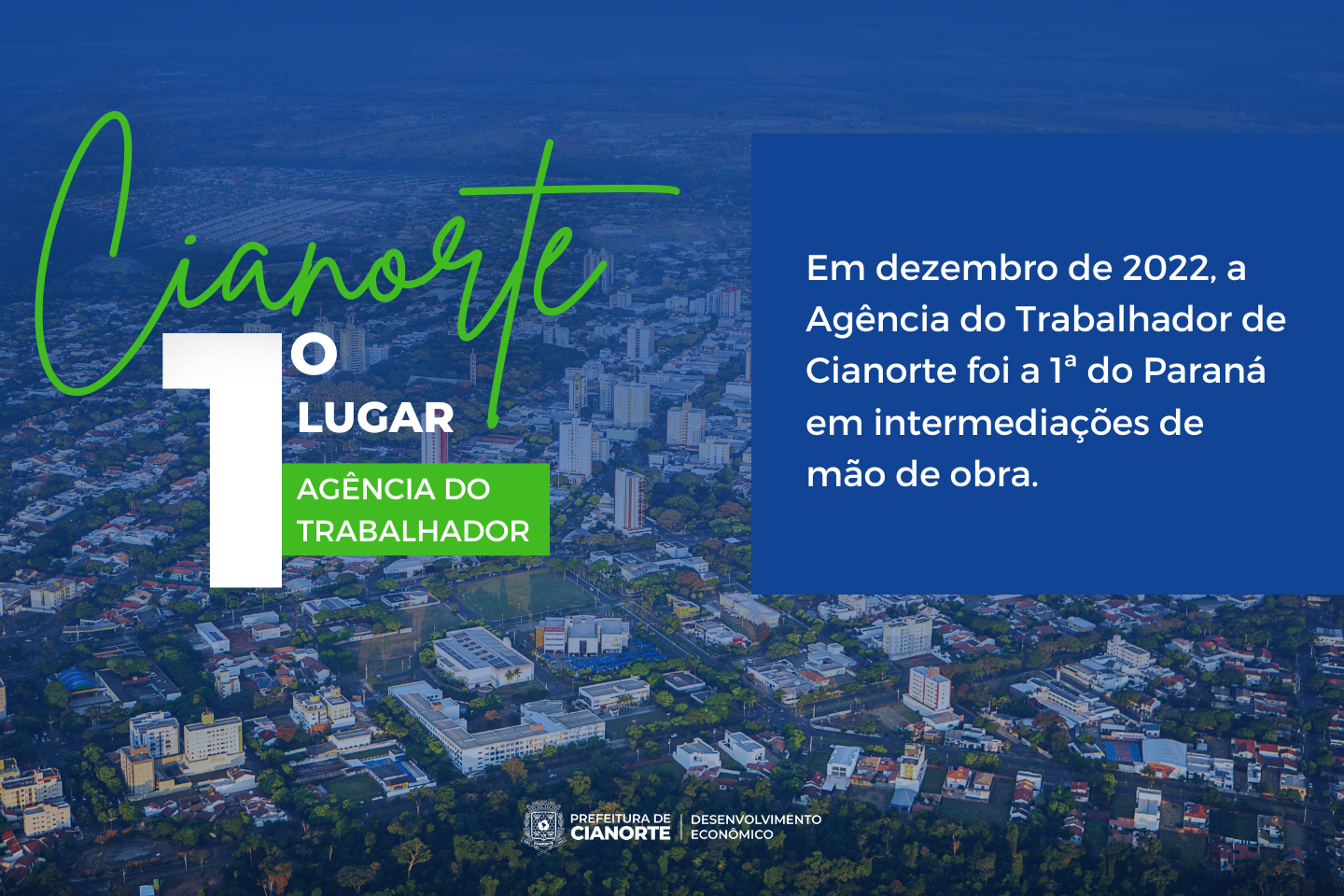 Cianorte concluiu 2022 com boas notícias em empregos com carteira assinada. Isto porque, a Agência do Trabalhador do Município fechou dezembro em 1º lugar do Paraná em Intermediação de Mão de Obra (IMO), conforme relatório do Departamento do Trabalho e Estímulo a Geração de Renda (DIET), divulgado nesta terça-feira (3), pela Secretaria da Justiça, Família e Trabalho (SEJUF).