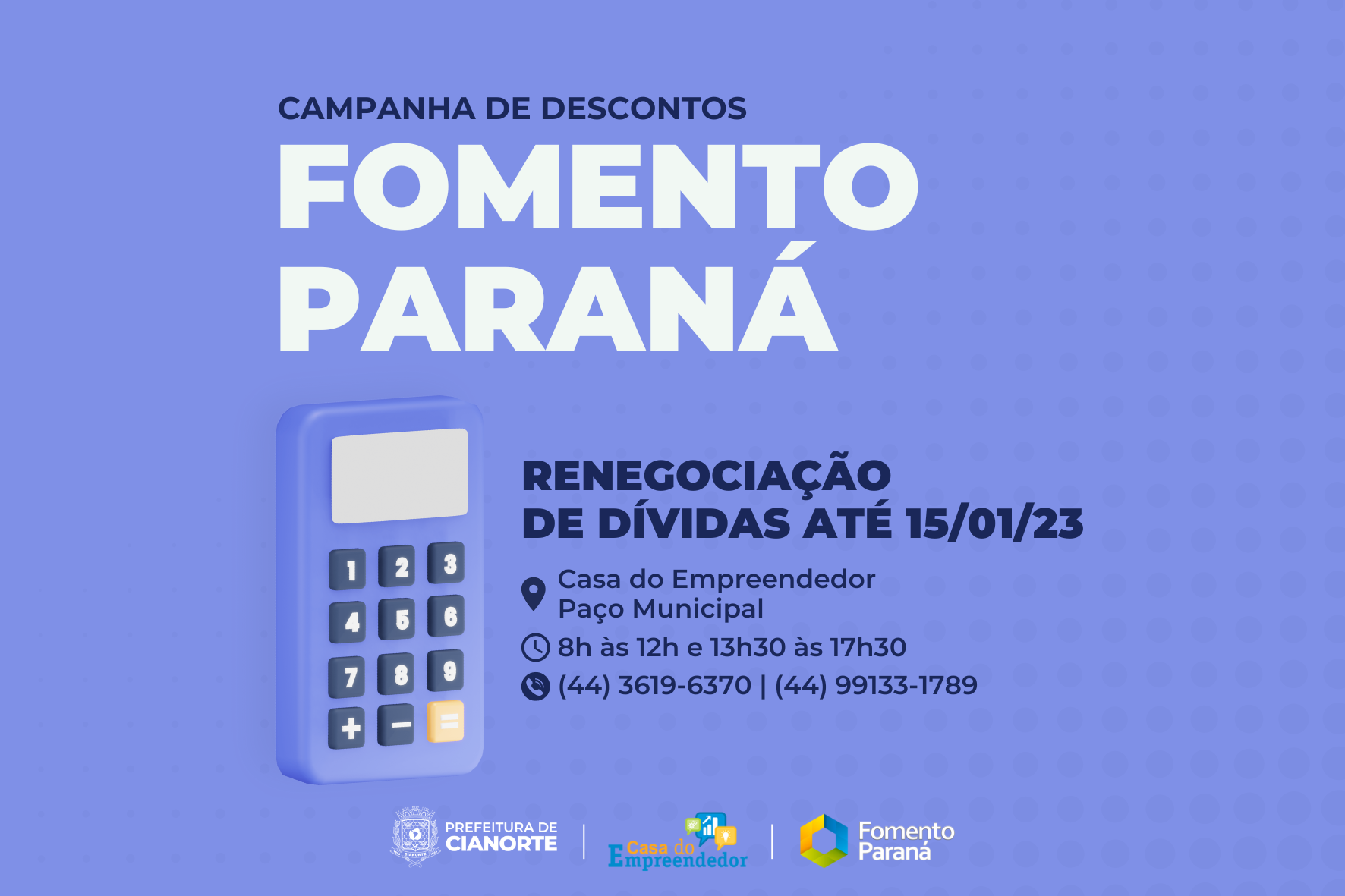 A porcentagem de descontos varia de acordo com cada caso, como o período de atraso, podendo ser de 50% ou 100%, e o alongamento de débito com primeira parcela em até 60 dias. Os interessados devem procurar por atendimento na Casa do Empreendedor, que é a correspondente da Fomento Paraná em Cianorte, de segunda a sexta-feira, no primeiro piso do Paço Municipal, das 8h às 12h e das 13h30 às 17h30. Mais informações pelos telefones (44) 3619-6370 ou (44) 99133-1789 (WhatsApp).