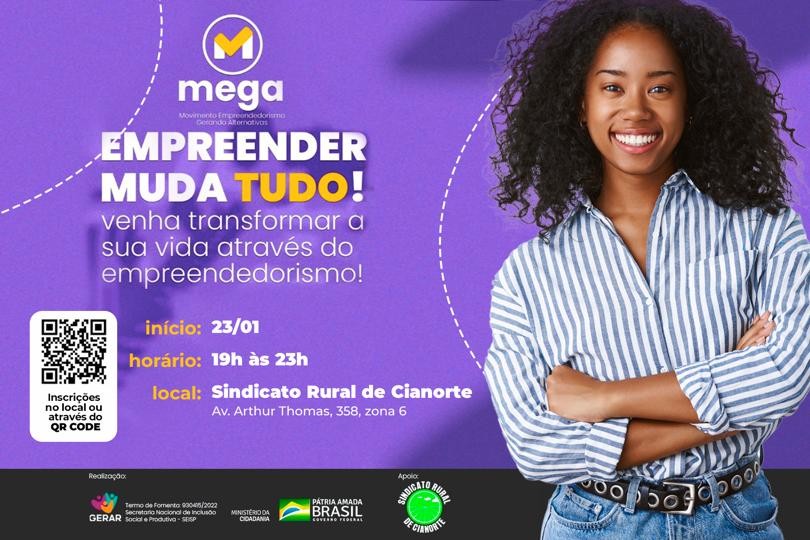 Os cianortenses interessados em aprender sobre processos de negócios, gestão financeira, marketing, vendas e autoconhecimento não podem perder esta oportunidade: o curso “Empreender muda tudo!”, ofertado pelo Movimento Empreendedorismo Gerando Alternativas (Mega), em parceria com Secretaria Nacional de Inclusão Social e Produtiva – Ministério da Cidadania, com o apoio do Sindicato Rural de Cianorte e a Casa do Empreendedor.