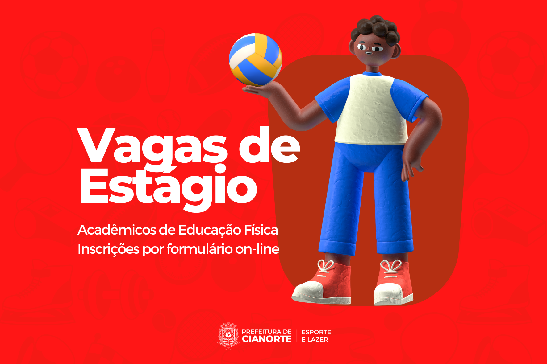 A Secretaria Municipal de Esporte e Lazer está com inscrições abertas para o preenchimento de vagas de estágio remunerado por acadêmicos de Educação Física. Para se candidatar, é preciso estar regularmente matriculado e frequentando a graduação. A jornada é de 30 horas semanais para atuação nas modalidades das escolinhas de iniciação esportiva. Os interessados devem preencher o formulário on-line: https://forms.gle/s5QGSx6BH9jDknxV7.