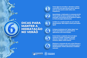 Com publicação mensal, o projeto Cianorte Mais Saudável, promovido pelo Conselho Municipal de Segurança Alimentar e Nutricional, inicia 2023 com dicas de hidratação para aproveitar a estação mais quente do ano. Isto porque, durante o verão, com as altas temperaturas, o organismo tende a perder mais líquido e sais minerais, seja pela respiração, transpiração ou urina, e, quando a ingestão de água não é suficiente, pode gerar dor de cabeça, constipação intestinal, pele ressecada, câimbras musculares, irregularidade na pressão sanguínea, entre outras consequências.