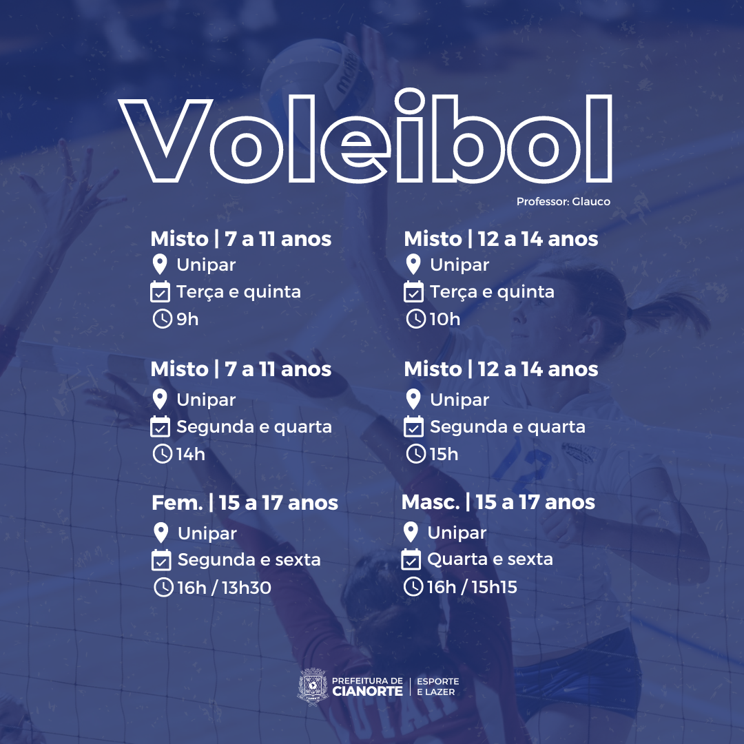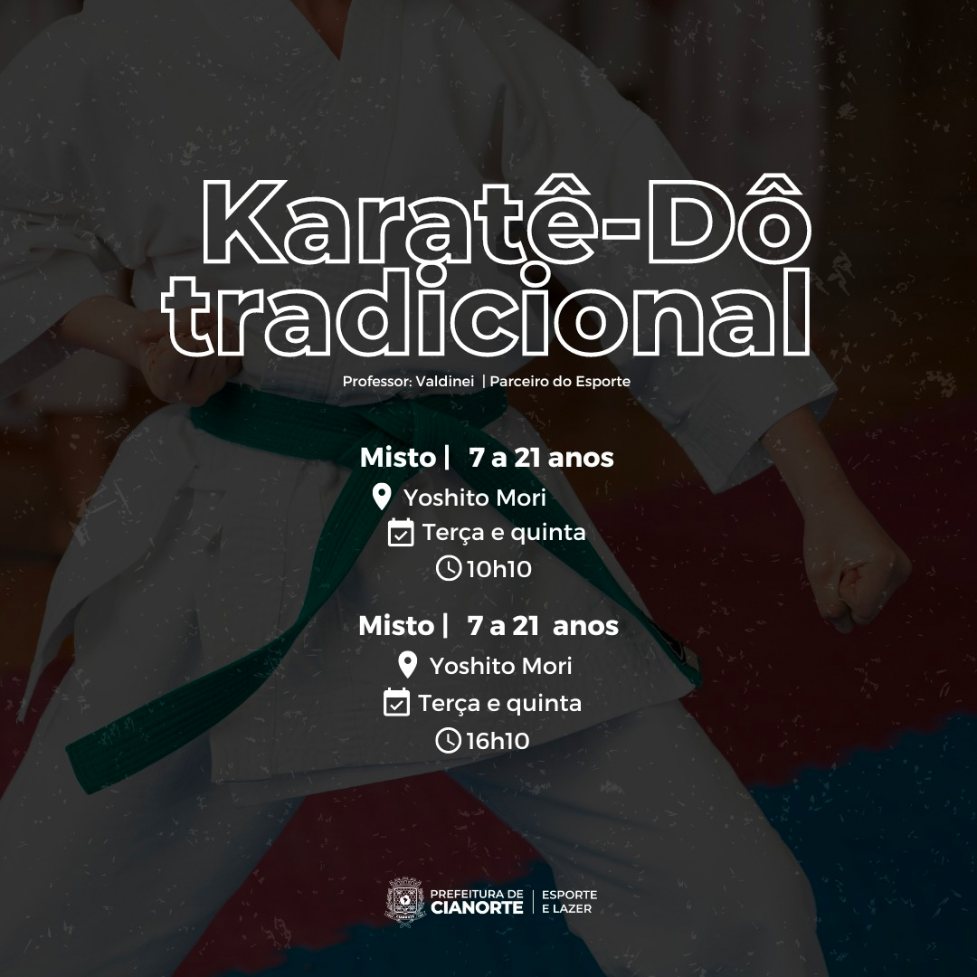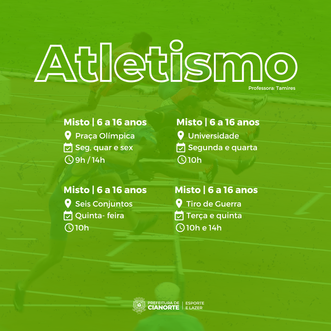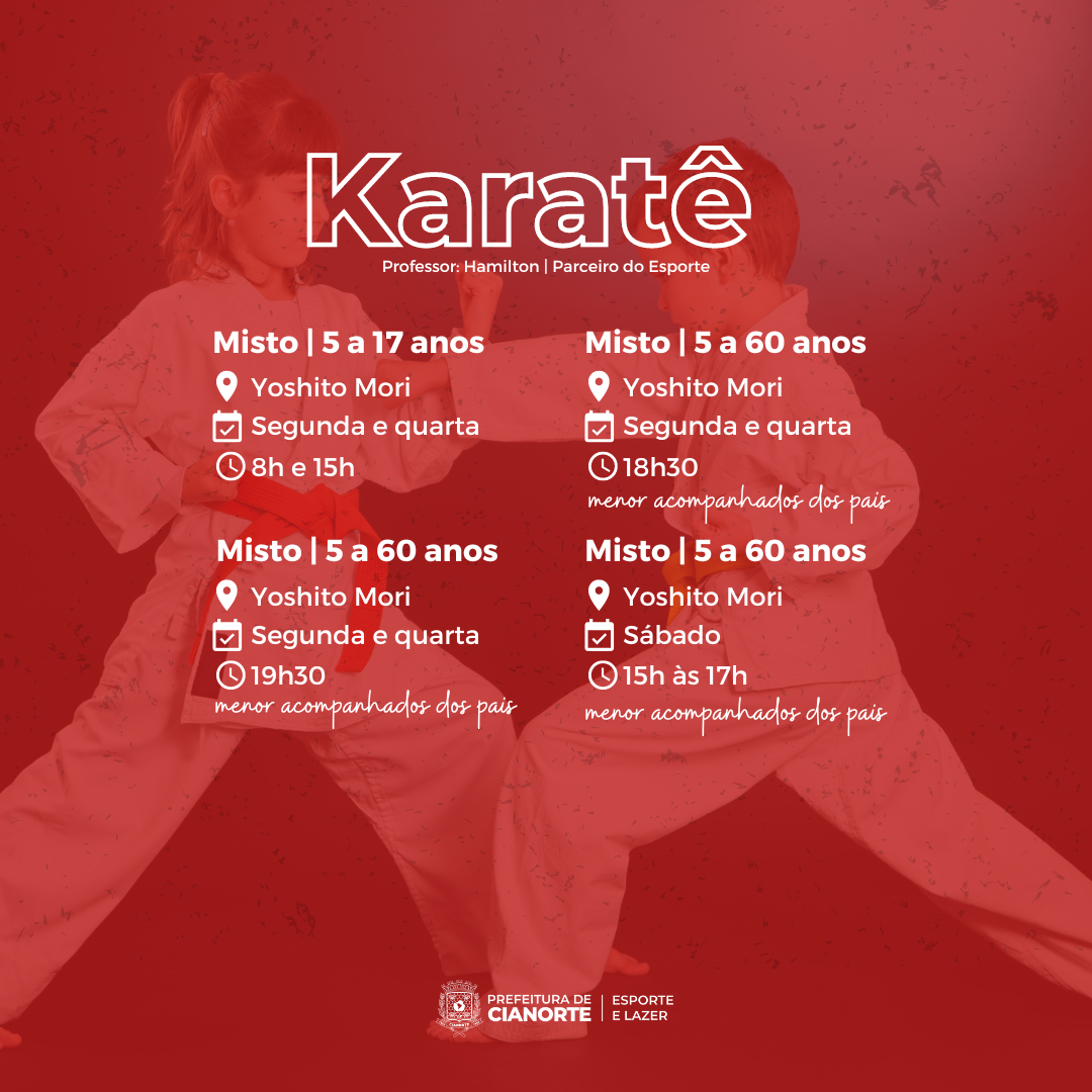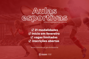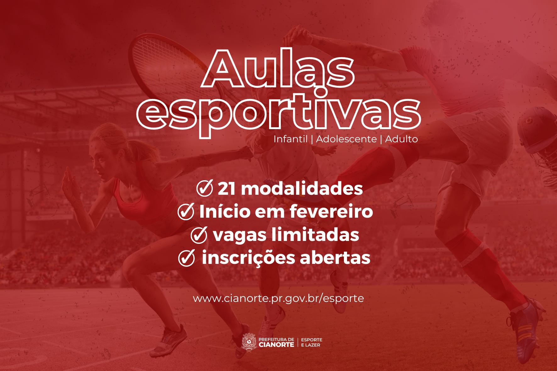 A Secretaria Municipal de Esporte e Lazer (SMEL) promove, a partir desta quarta-feira (1º), as inscrições para aulas esportivas em mais de modalidades voltadas para os públicos infantil, adolescente e adulto, em três categorias (masculina, feminina e mista). As turmas são orientadas por professores da SMEL, e de Parceiros com professores voluntários e de edificações como: Tiro de Guerra, Grand Ballet, Unipar, ThaiBoxe, Arena Nogueira, Cianorte Clube, Malheiros Racket Club, Projeto Abre Alas, Cianorte Futsal Feminino, Associação Cianortense de Skate (ACS), Liga Brasileira de Karatê, Associação Cianorte Karatê Do Tradicional, Federação Brasileira de Karatê - Dô e Kobu-do e Associação Paranaense de Karatê Jutsu.