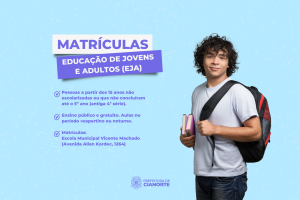 Em Cianorte, as pessoas com idade a partir dos 15 anos que desejam concluir os anos iniciais do Ensino Fundamental (do 1º ao 5º) têm a oportunidade na Educação de Jovens e Adultos (EJA), que está com as matrículas abertas. O ensino é gratuito, com aulas nos períodos vespertino ou noturno. Os interessados devem comparecer à secretaria da Escola Municipal Vicente Machado, na Avenida Allan Kardec, 1264, em frente a Paróquia Sagrado Coração de Jesus, na Zona 07. O atendimento é de segunda a sexta-feira, das 7h30 às 11h30 e das 13h30 às 17h30.