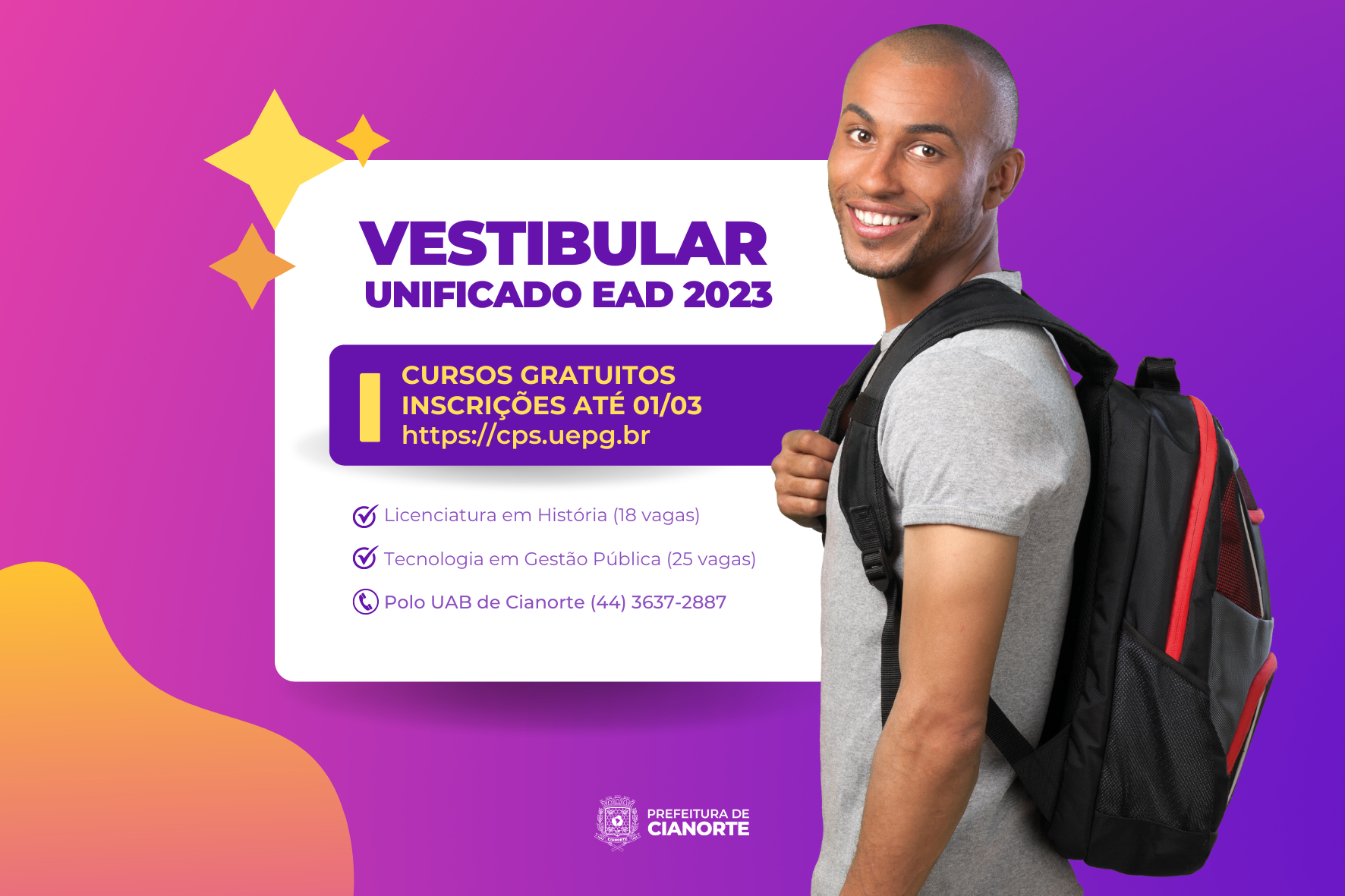 O vestibular será realizado pela Universidade Estadual de Ponta Grossa (UEPG) e o período de inscrições vai de 09 de fevereiro até 1º de março, com taxa de R$ 92,00. O Manual do candidato está disponível no link https://cps.uepg.br/inicio/index.php/vestibularead/ead-2023. Para mais informações, o Polo de Apoio Presencial está localizado na Escola Municipal Lidia Usuy Ohi, na Rua Henrique Dias, 211, com atendimento pelo telefone (44) 3637-2887.