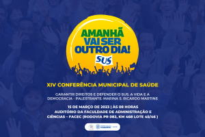 Os moradores de Cianorte são convidados a contribuir para a melhoria dos serviços de saúde prestados na cidade, participando da XIV Conferência Municipal de Saúde. O evento será no dia 15 de março, com início às 8h, no Auditório da Facec (PR-082, Km 468, lote 45/46). Na oportunidade, a palestrante Marina Ricardo Martins falará sobre o tema “Garantir direitos e defender o SUS, a vida e a democracia – Amanhã vai ser um outro dia”.