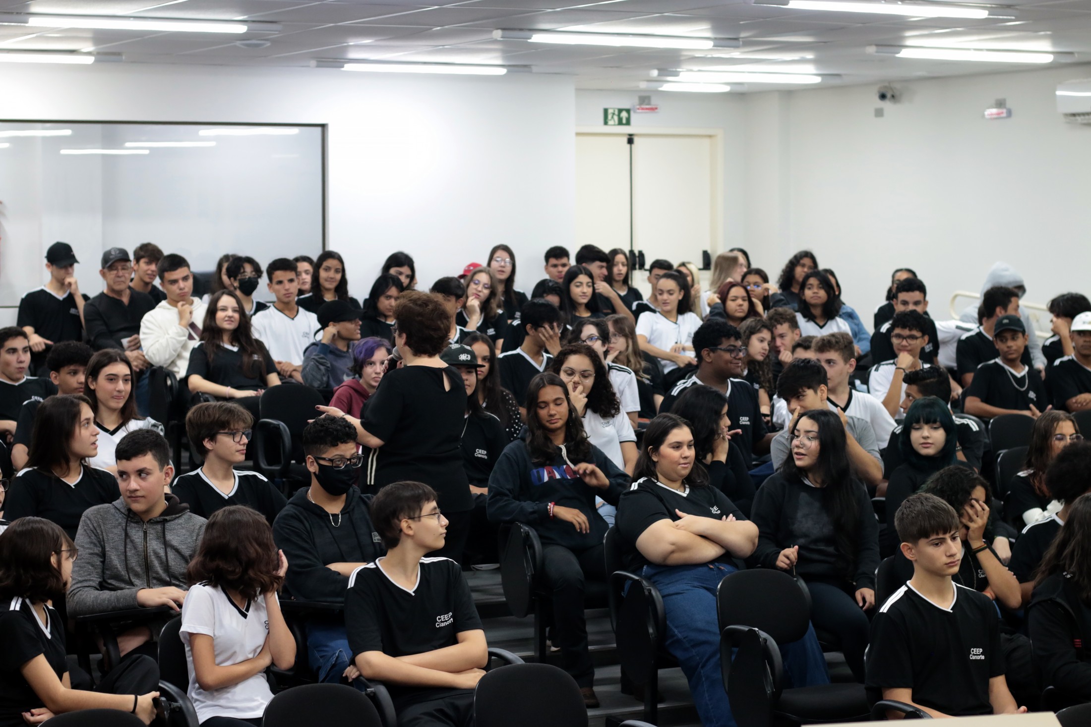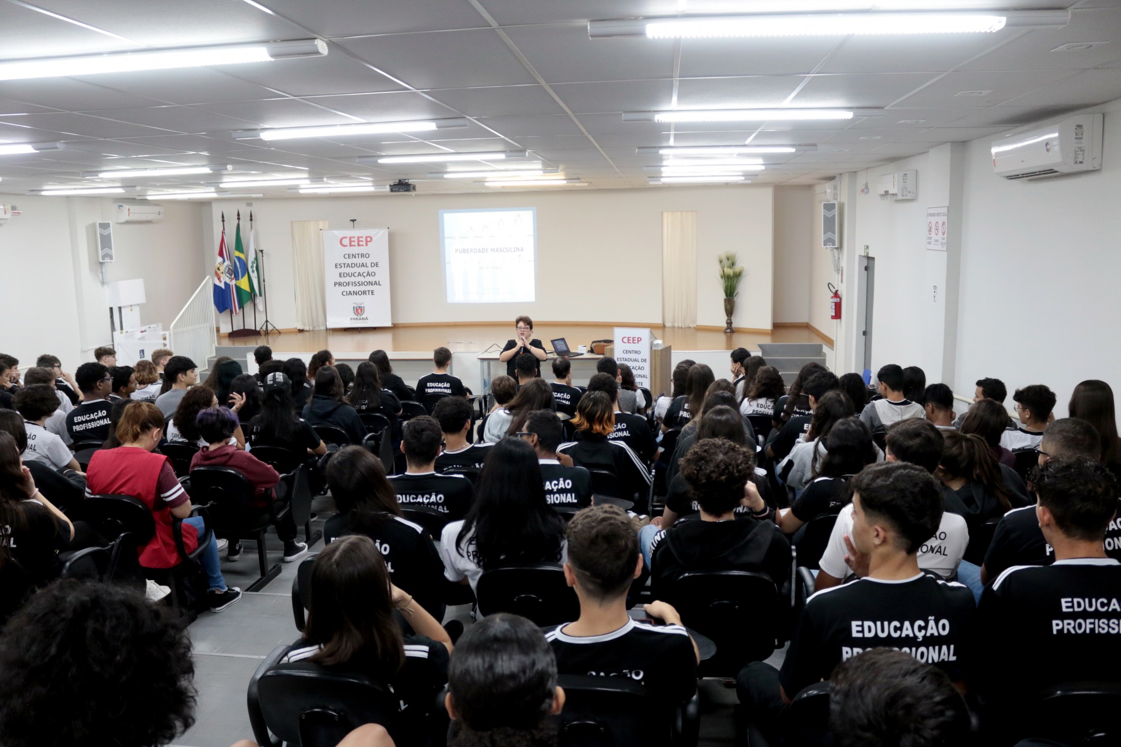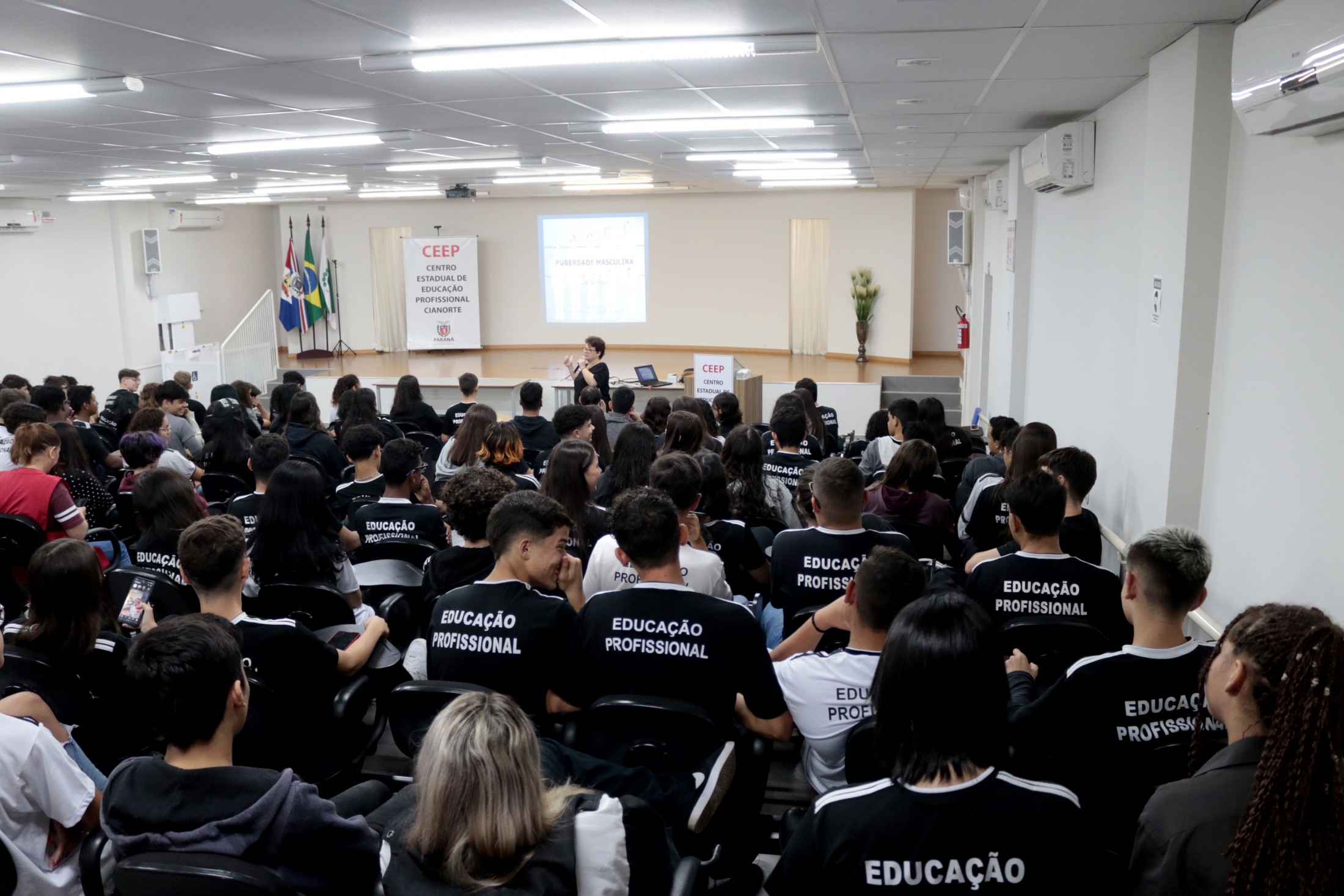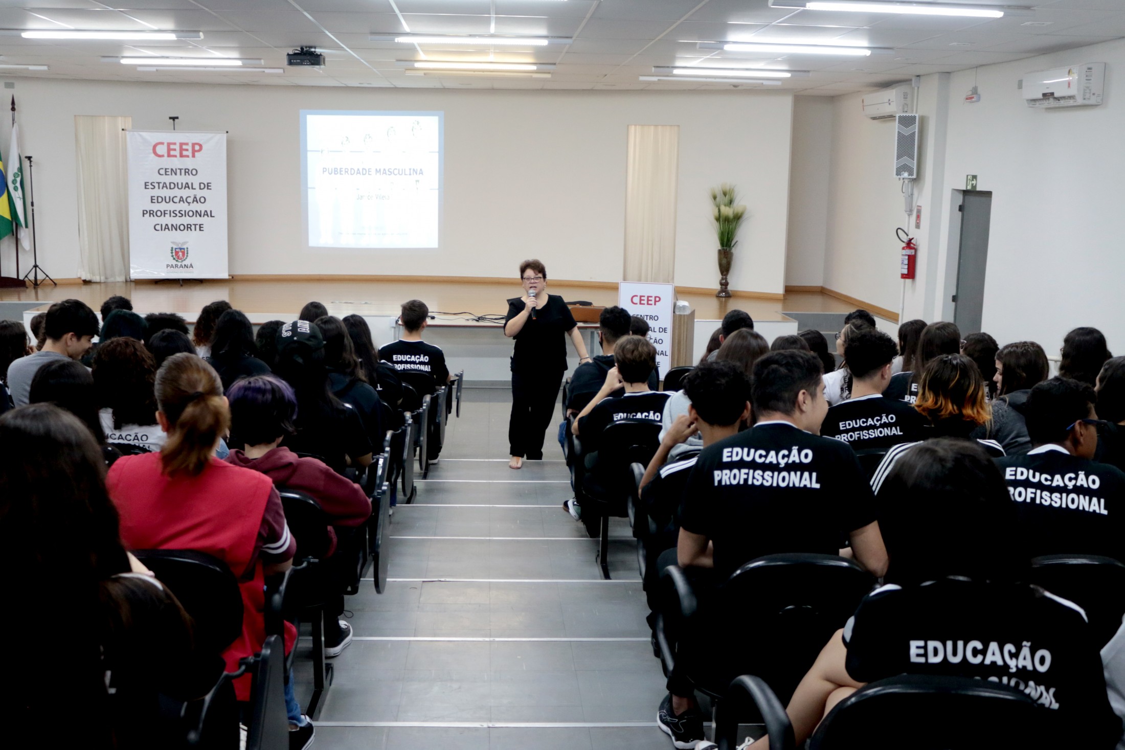 Nesta terça-feira (28), a Secretaria Municipal de Saúde e a de Políticas Públicas para Mulheres, Crianças e Adolescentes, com o apoio do Núcleo Regional de Educação, promoveu as primeiras palestras alusivas à Semana de Prevenção da Gravidez na Adolescência, instituída pela Lei Municipal 5.255/2021. Pela manhã, os alunos dos 1°s, 2°s e 3°s anos do Centro Estadual de Educação Profissional (CEEP) participaram da iniciativa e, à tarde, foi a vez dos estudantes do Centro Estadual de Educação Básica Para Jovens e Adultos de Cianorte (CEEBJA) Saada Mitre Abou Nabhan, totalizando 430 pessoas.