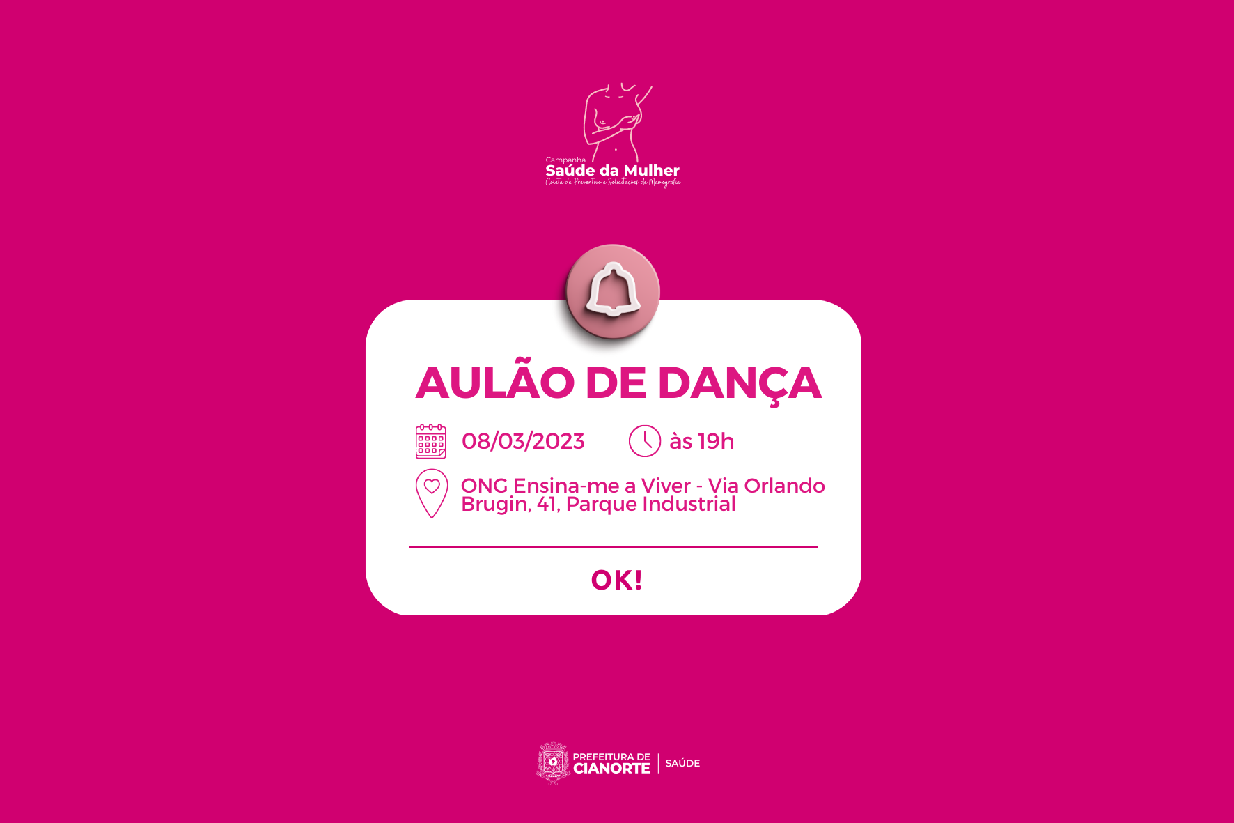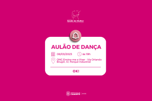 Para celebrar o Dia Internacional da Mulher, nesta quarta (08), o público feminino é convidado a participar do Aulão de Dança, que será realizado na ONG Ensina-me a Viver (Via Orlando Brugin, 41, Parque Industrial), com início às 19h. A iniciativa integra a Campanha Saúde da Mulher, fruto da parceria entre a Secretaria Municipal de Saúde e a entidade, que oferecerá exames preventivos Papanicolau e solicitações de mamografias ao longo do mês.