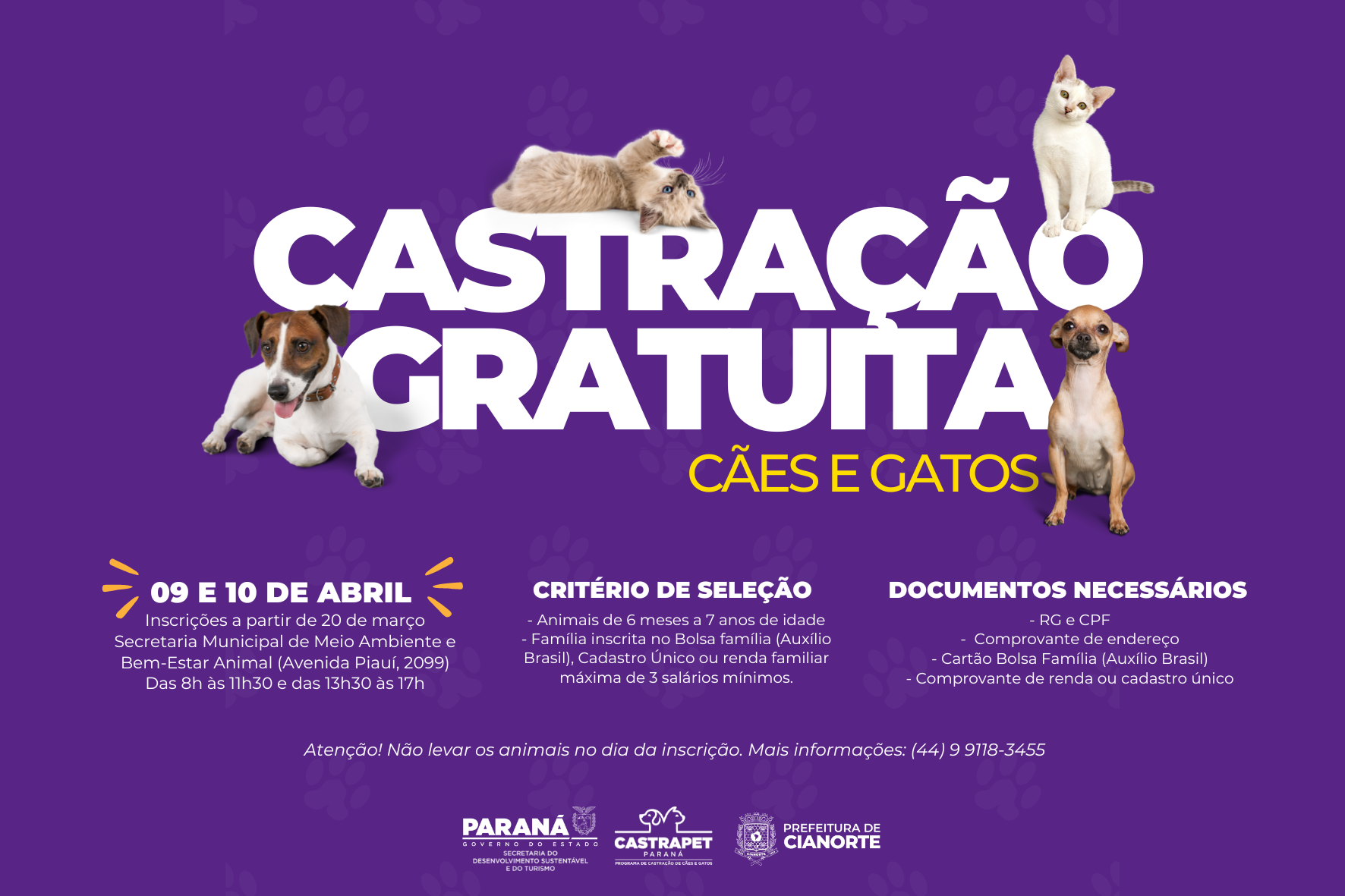 O programa permanente de esterilização de cães e gatos da Secretaria do Desenvolvimento Sustentável e do Turismo (Sedest), o CastraPet, estará em Cianorte nos dias 09 e 10 de abril para realizar a sua quarta edição. Ao todo serão 500 castrações gratuitas. As inscrições começam na próxima segunda-feira (20), das 8h às 11h30 e das 13h30 às 17h, na Secretaria do Meio Ambiente e Bem-Estar Animal, localizada Avenida Piauí, 2.099.
