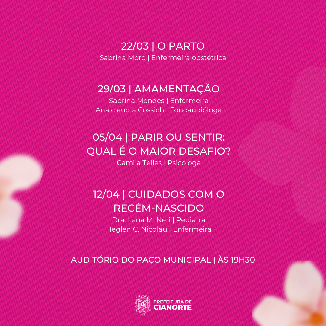 Serão quatro encontros, às quartas-feiras, às 19h30, no auditório da prefeitura, com início em 22 de março. As especialistas trabalharão: parto, amamentação, sentimentos e cuidados com o recém-nascido. Podem participar as futuras mamães e um acompanhante cada, seja o pai da criança ou outra pessoa que estará presente no parto ou pós-parto. Basta apresentar a carteirinha da gestante, independente do pré-natal na rede pública ou privada.