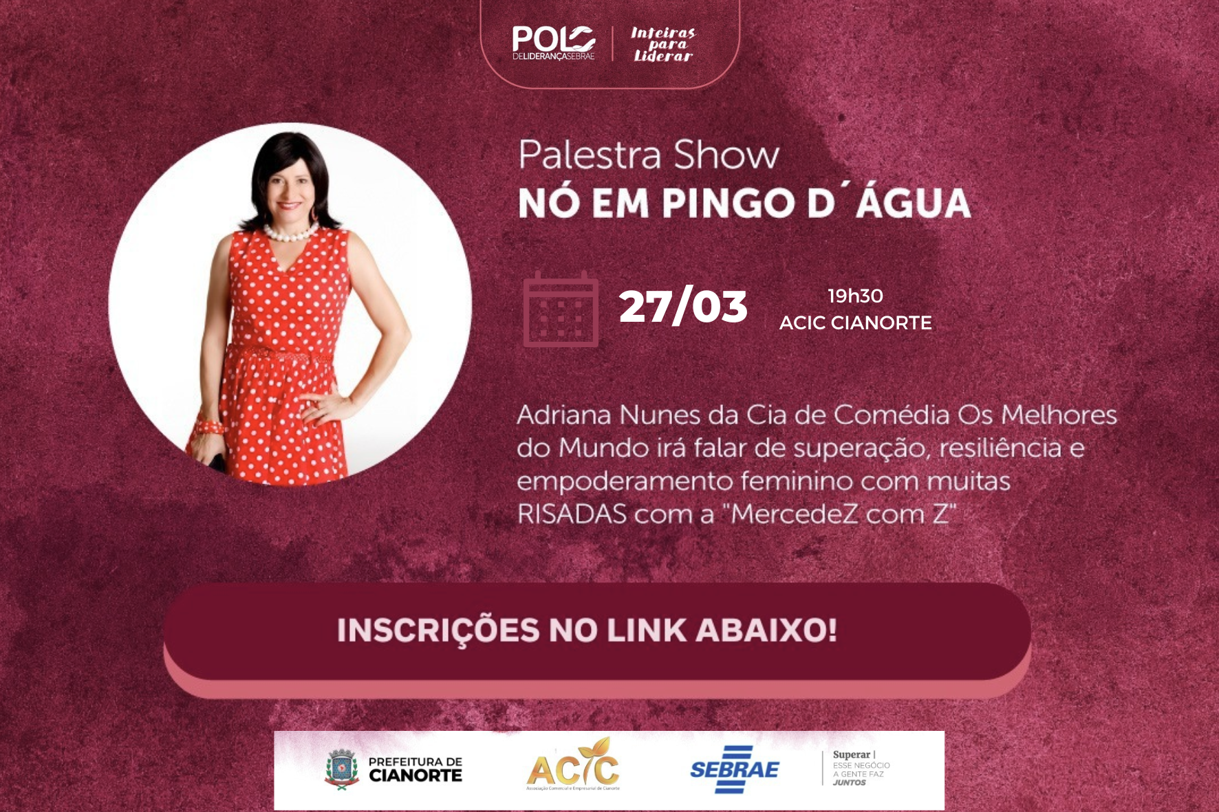 A parceria firmada entre a Prefeitura, Associação Comercial e Empresarial (Acic) e Sebrae traz para Cianorte o espetáculo “Nó em pingo d’água”, estrelado pela “MercedeZ com Z”, personagem da atriz e comediante Adriana Nunes, fundadora da Cia de Comédia Os Melhores do Mundo. A iniciativa será na segunda-feira (27), às 19h30, na Acic. O evento é gratuito e as inscrições podem ser realizadas pelo link: https://forms.office.com/r/vB4rpgVFZG.