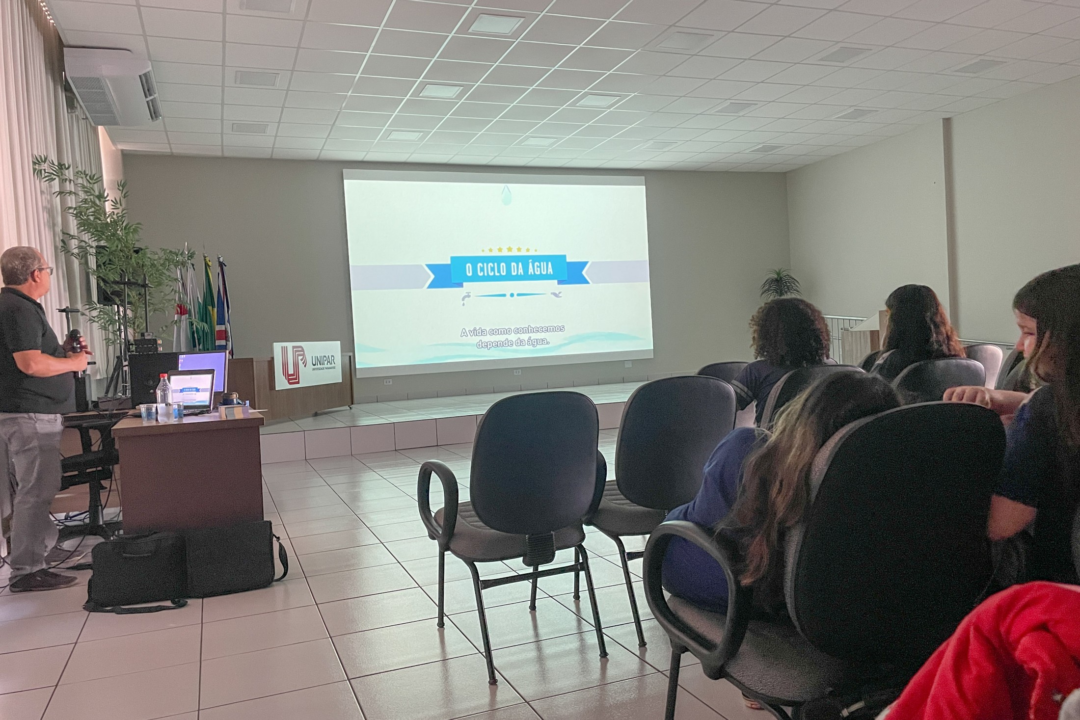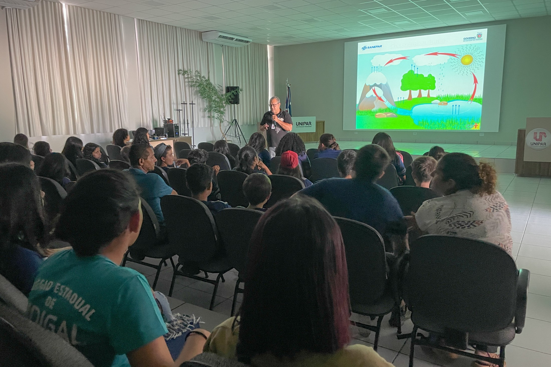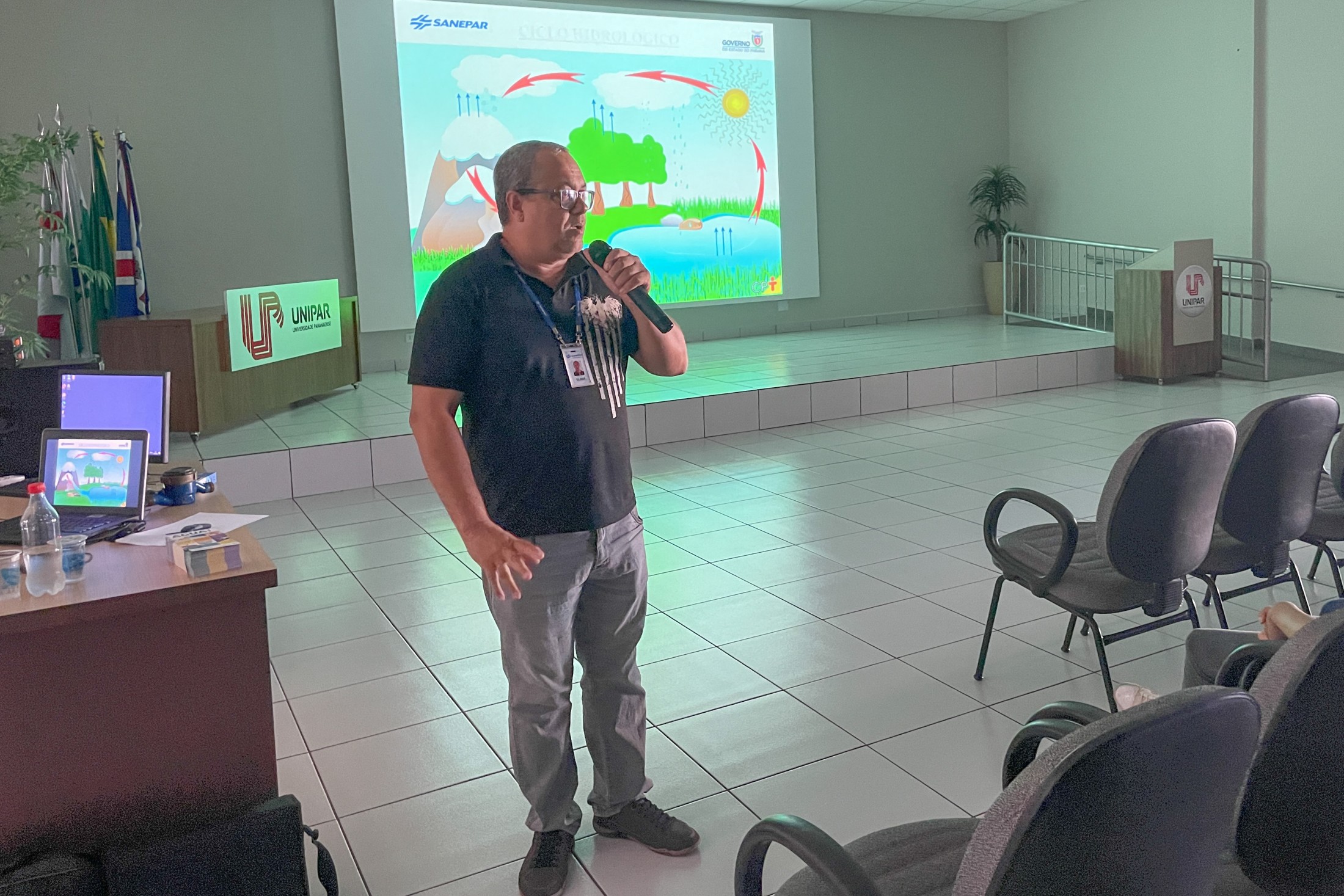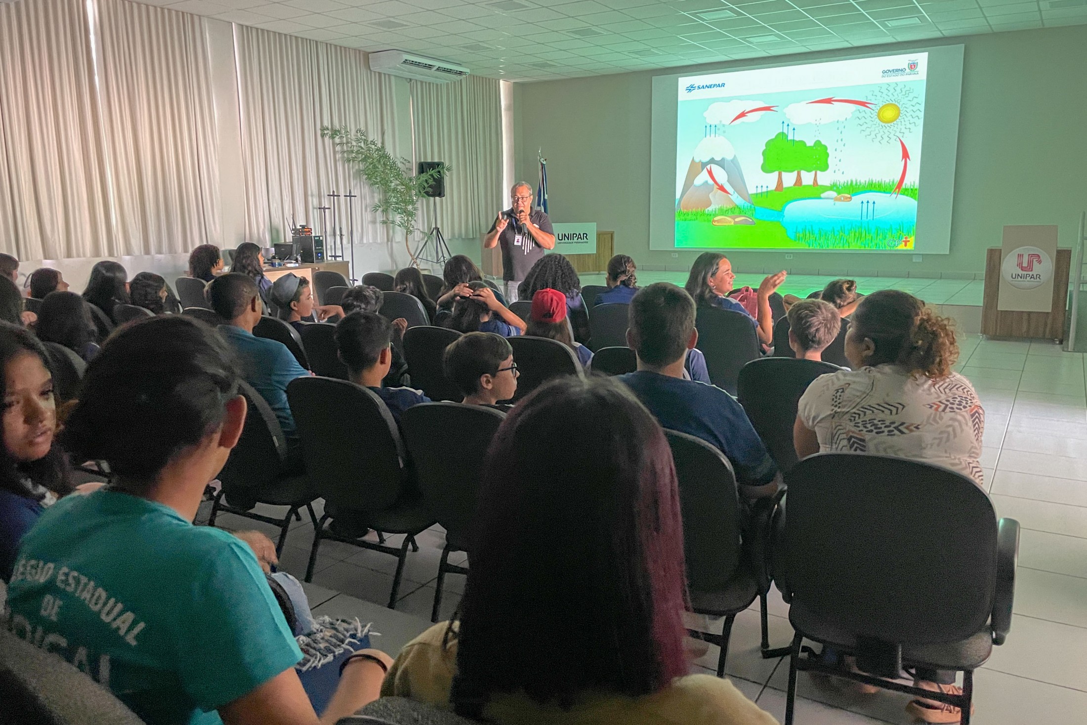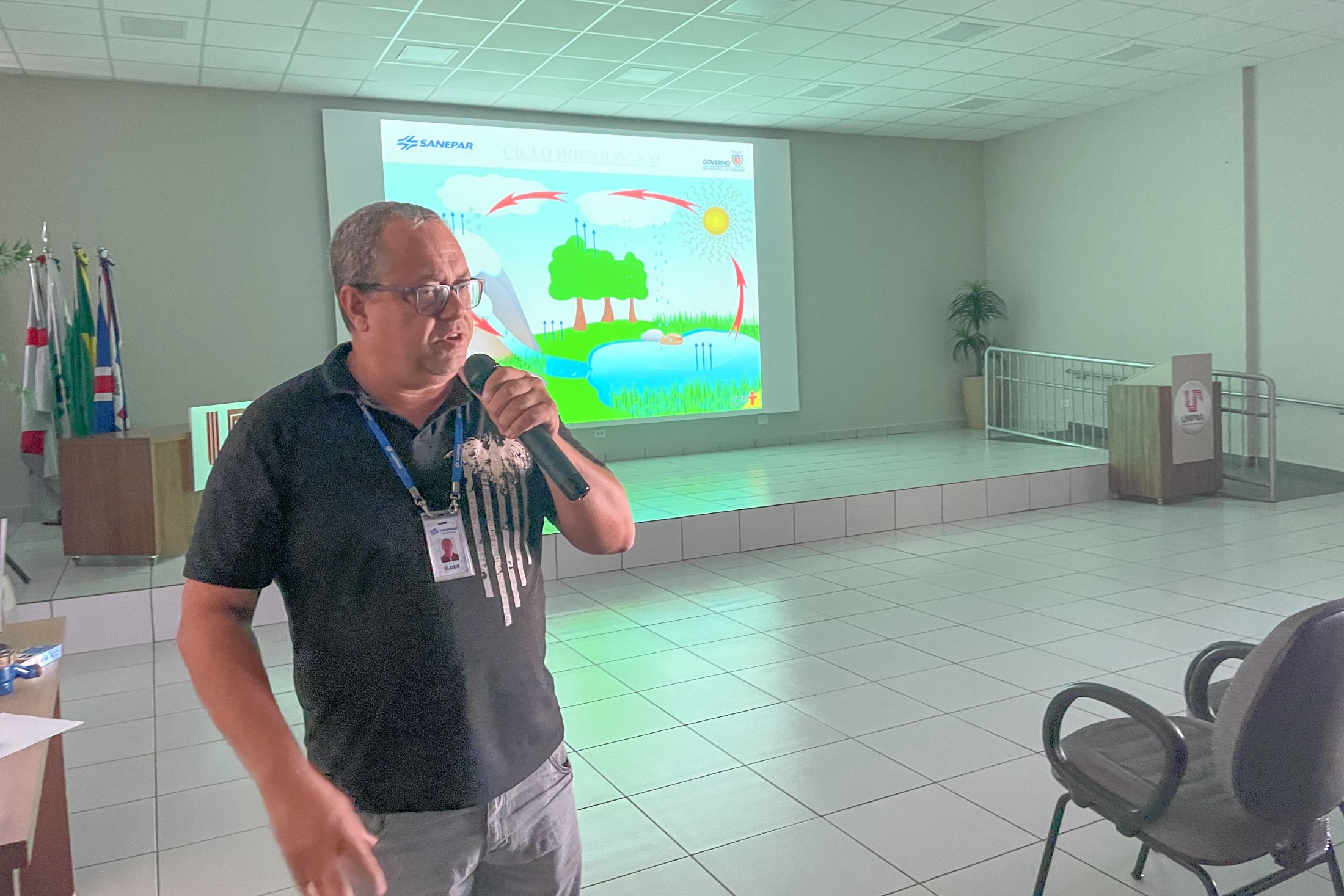 Em alusão ao Dia da Água, celebrado em 22 de março, a Divisão de Educação Ambiental da Secretaria Municipal de Meio Ambiente e Bem-Estar Animal promoveu, na última quarta-feira (22), uma palestra sobre Saneamento Básico com o técnico de Meio Ambiente da Sanepar, Elder Robson Myszkovski. A ocasião foi voltada aos colégios estaduais de São Lourenço e de Vidigal e aconteceu no auditório da Unipar. Ao todo, 90 alunos participaram.