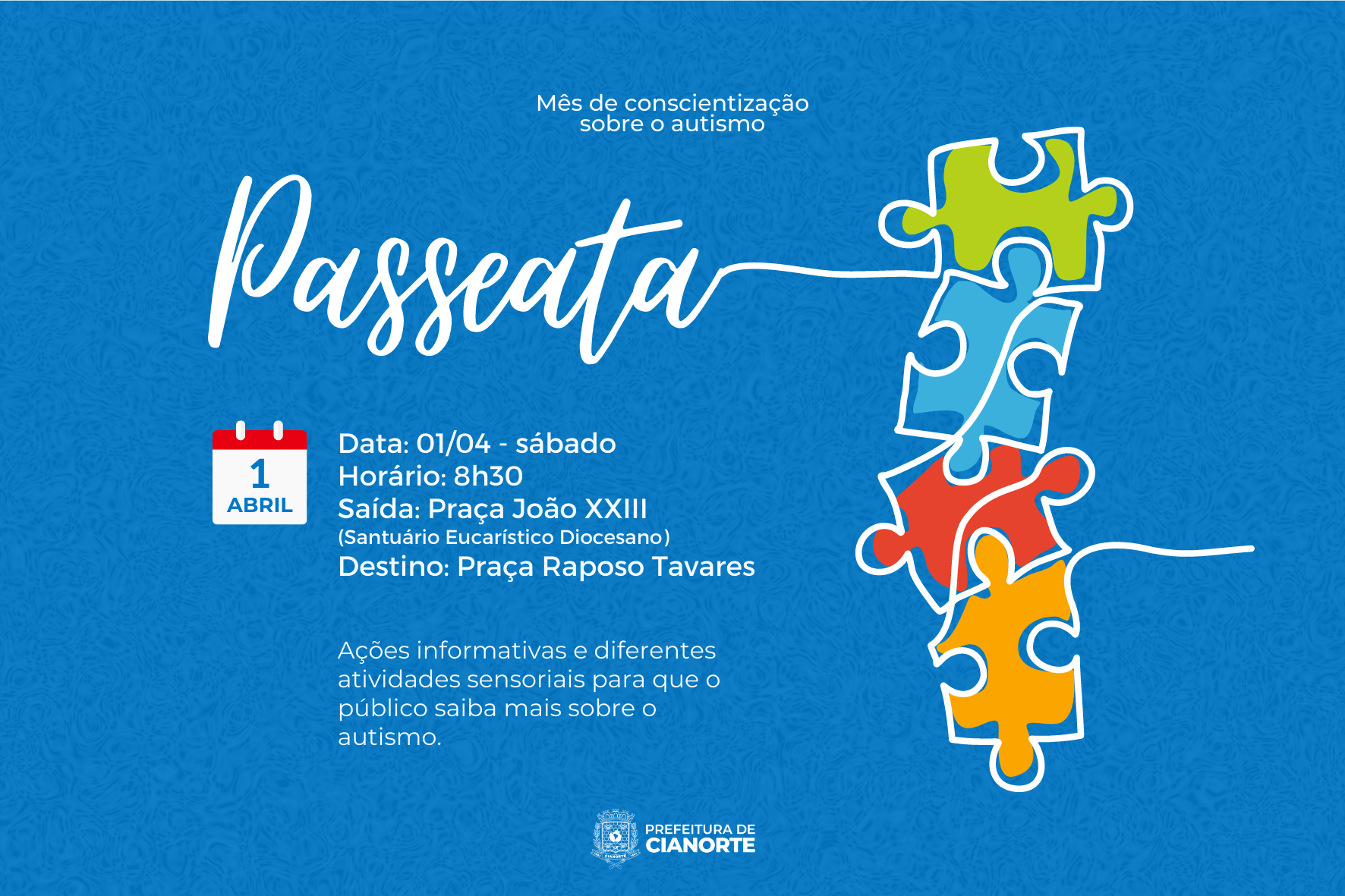 A concentração será na Praça João XXIII (Santuário Eucarístico Diocesano), às 8h30, com destino à Praça Raposo Tavares, onde haverá ações informativas e diferentes atividades sensoriais para que os cianortenses e visitantes saibam mais sobre o autismo. O evento é aberto ao público, para participar basta comparecer ao local.