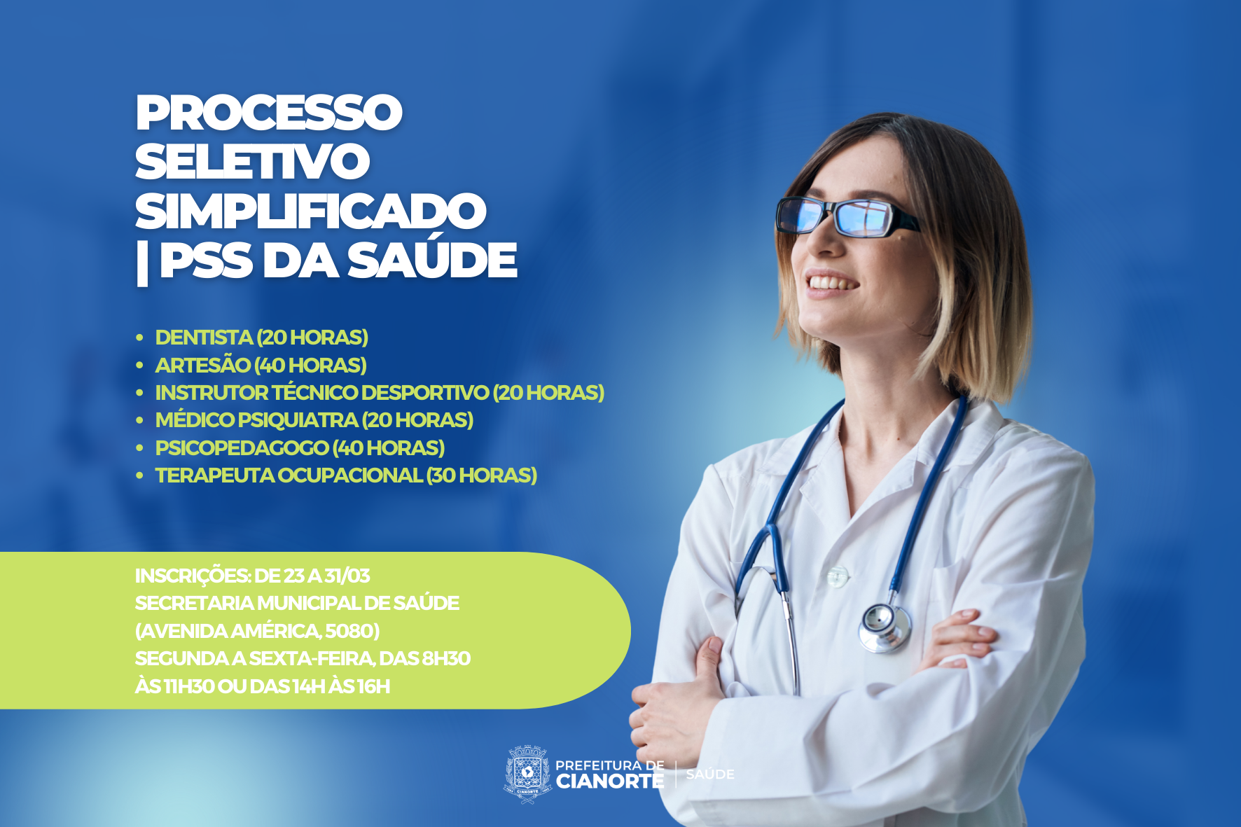 Os profissionais interessados em participar do Processo Seletivo Simplificado (PSS) para a contratação temporária de dentista (20 horas), artesão (40 horas), instrutor técnico desportivo (20 horas), médico psiquiatra (20 horas), psicopedagogo (40 horas) e terapeuta ocupacional (30 horas) têm até esta sexta-feira (31) para efetuar a inscrição. O edital está disponível no Órgão Oficial do Município (https://cianorte.pr.gov.br/diario-oficial/ – Edição nº 2526).