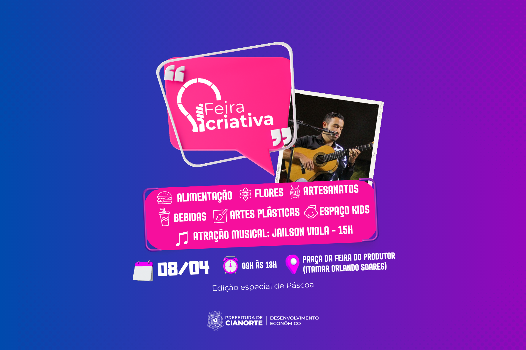 Com diversos produtos genuinamente cianortenses, a Feira Criativa é uma oportunidade de compras e lazer que não pode ser perdida. E, neste sábado (8), o clima de Páscoa dará um toque especial à ocasião, com opções de presentes e itens de consumo com a temática. A visitação é aberta ao público, das 9h às 18h, na Praça Itamar Orlando Soares (Feira do Produtor Rural).
