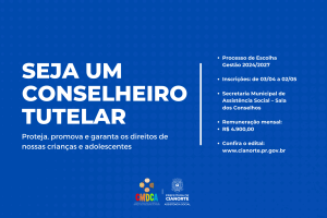 Quer ser um conselheiro tutelar? Então, procure a Secretaria Municipal de Assistência Social – Sala dos Conselhos, localizada na Praça Olímpica Marcos Danilo Padilha, nº 236, Zona 04, até o dia 02 de maio. Após a validação da inscrição, os candidatos passarão por avaliação documental, exame de conhecimentos específicos, avaliação psicológica e médica, eleição e curso de formação inicial. Todas as etapas têm caráter eliminatório.