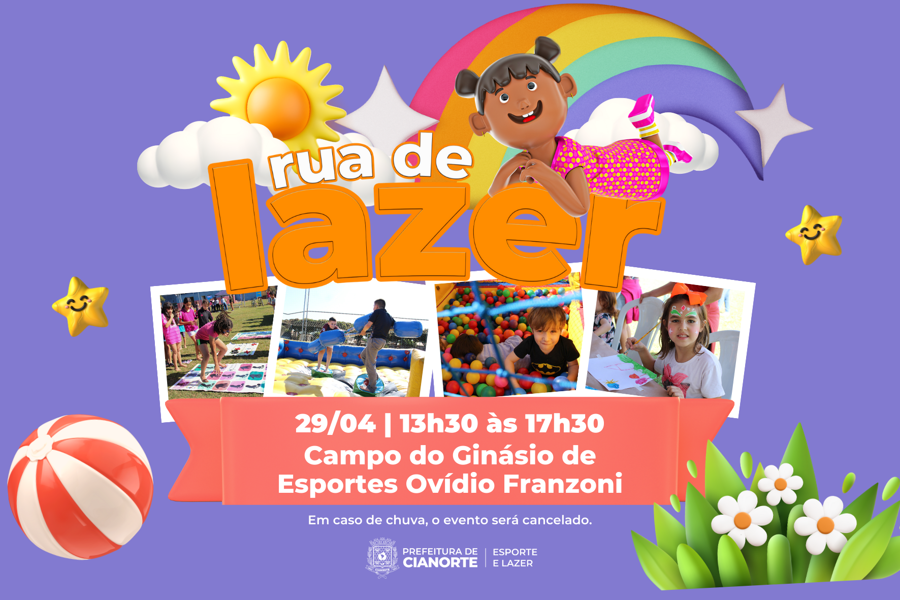 Neste sábado (29), o conjunto Ovídio Franzoni recebe o projeto Rua de Lazer, no campo do ginásio de esportes, das 13h30 às 17h30. A ação é promovida pela Prefeitura, por meio da Secretaria Municipal de Esporte e Lazer, em parceria com o curso de Educação Física da Unipar. Na ocasião, as crianças participarão gratuitamente de gincanas, recreações, brinquedos infláveis e distribuição de doces, tudo com muita alegria e diversão.