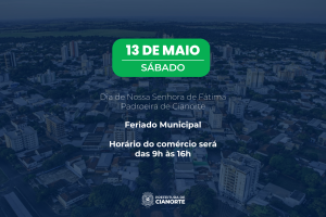 Neste sábado (13), Cianorte celebra o Dia de Nossa Senhora de Fátima, padroeira da cidade. A data é feriado municipal. No entanto, o comércio varejista, por acordo coletivo de trabalho, visto a véspera do Dia das Mães (domingo, 14), funcionará das 9h às 16h, com fechamento na segunda-feira (15). Diante disso, a Prefeitura salienta que essa exceção recai somente sobre a categoria.