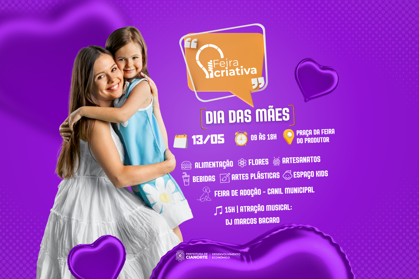 Em Cianorte, a Feira Criativa é uma oportunidade de compras e lazer que não pode ser perdida. E, neste sábado (13), véspera do Dia das Mães, o clima da data comemorativa dará um toque especial à ocasião, com opções de presentes e itens de consumo com a temática. A visitação é aberta ao público, das 9h às 18h, na Praça Itamar Orlando Soares (Feira do Produtor Rural).