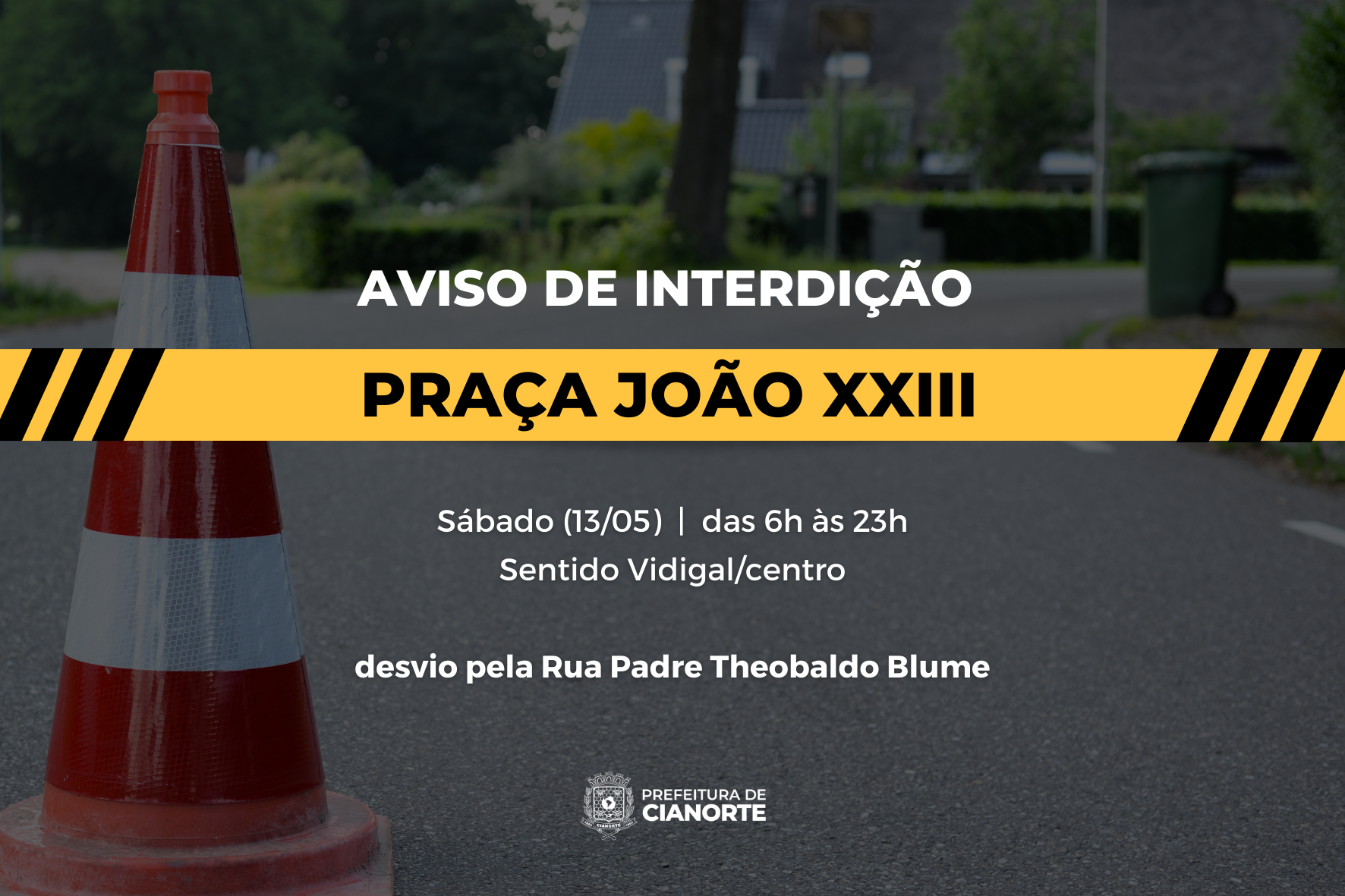 Em decorrência das celebrações do Dia de Nossa Senhora de Fátima, padroeira de Cianorte, neste sábado (13), a Praça João XXIII (Santuário Eucarístico Diocesano - “Igreja Matriz”) terá interdição do trânsito no sentido distrito de Vidigal ao centro, das 6h às 23h. O desvio deve ser realizado pela Rua Padre Theobaldo Blume.