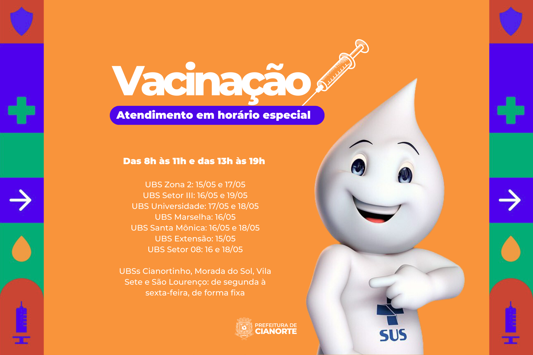 Assim, além das que já realizam a aplicação até as 19h (Morada do Sol, Vila Sete e Cianortinho), terão horário estendido a UBS Extensão, na segunda-feira (15/05); UBS Zona 02, na segunda (15/5) e quarta-feira (17/05); UBS Setor 03, na terça-feira (16/05) e sexta-feira (19/05); UBS Universidade, na quarta-feira (17/05) e quinta-feira (18/05); UBS Marselha, na terça-feira (16/05); UBS Santa Mônica, na terça-feira (16/05) e quinta-feira (18/05); e UBS Setor 08, na terça-feira (16/05) e quinta-feira (18/05).