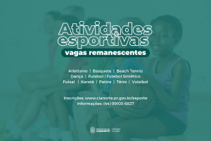 A Prefeitura de Cianorte, por meio da Secretaria Municipal de Esporte e Lazer (SMEL), reabriu as inscrições para as atividades esportivas gratuitas que têm vagas remanescentes. São oportunidades para diversas idades, em diferentes turmas, nas categorias feminina, masculina ou mista, nas modalidades Atletismo, Basquete, Beach Tennis, Dança, Futebol, Futebol Sintético, Futsal, Karatê, Patins, Tênis e Voleibol. Os interessados devem preencher formulário on-line, disponível no site do Município (http://cianorte.pr.gov.br/secretaria/esporte).